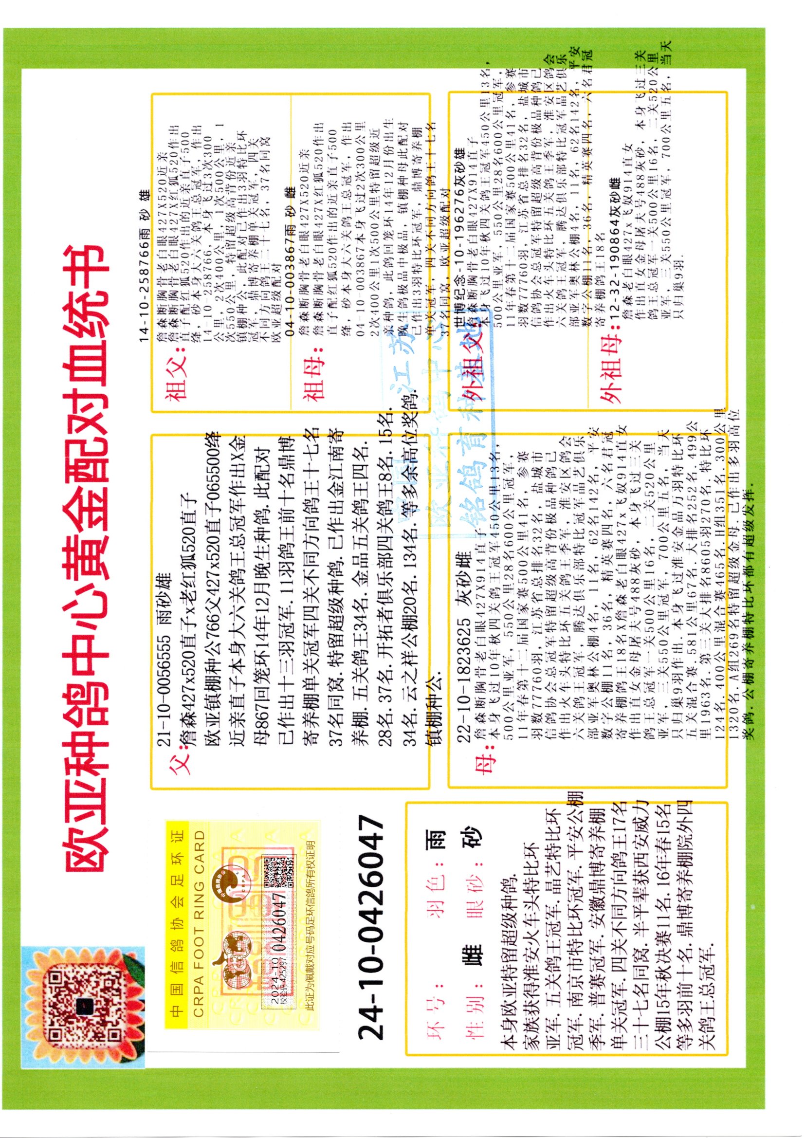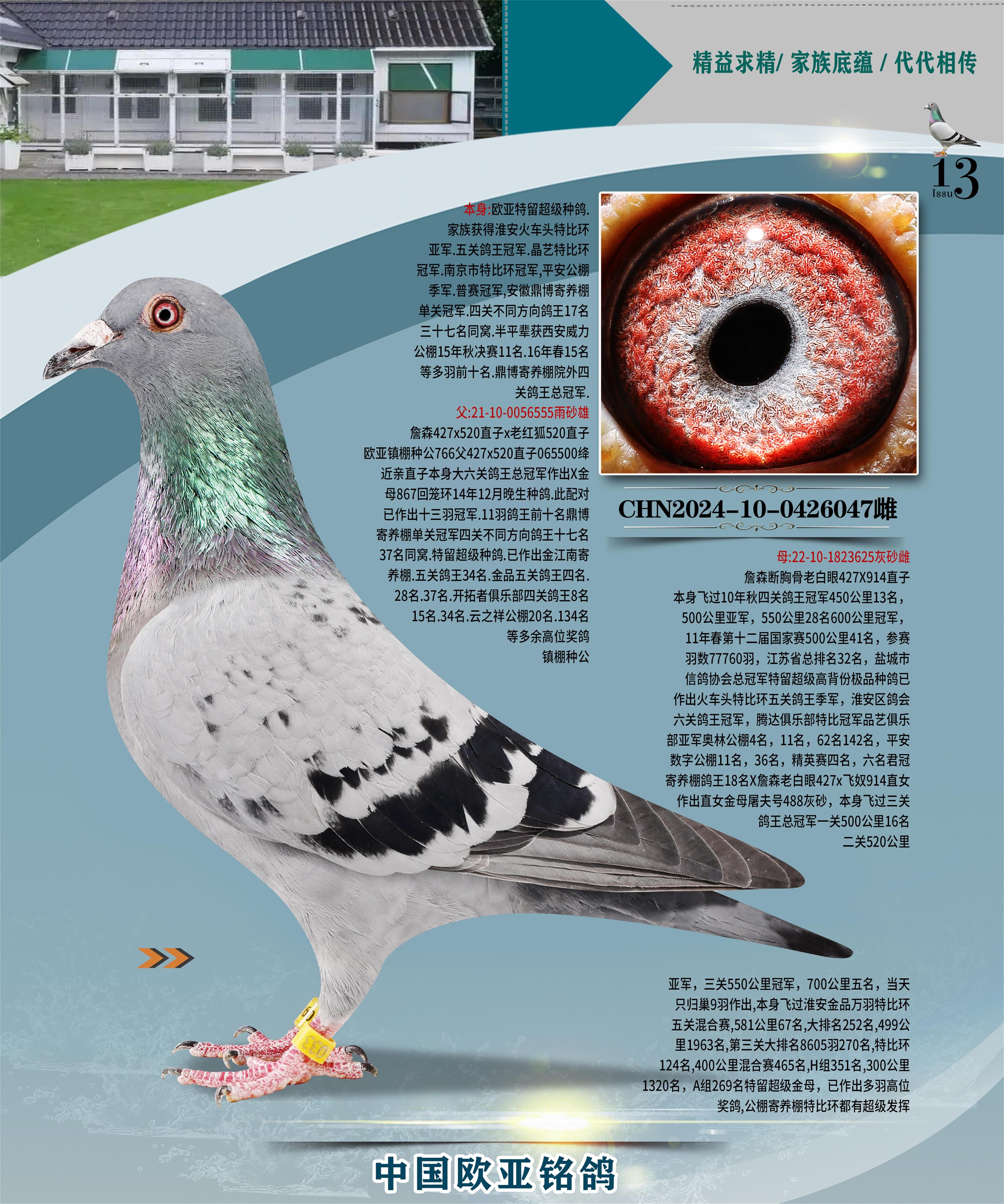24年秋南京特比環(huán)歐亞榮獲大團(tuán)體冠軍.小團(tuán)體冠軍551公里大特比13名.14名.16名.19名.20名.21名.24名.26名.27名.28名.42名.52名.54名.57名.65名.66名.68名.70名.71名.72名.74名.76名.80名.82名.83名.84名.85名.86名.90名.92名.110名.116名.121名.122名.128名.131名.158名.161名.164名.165名.166名.172名.174名.177名.182名.195名.196名.201名.205名.208名.210名.216名.253名.269名.275名.276名.294名.296名.299名,,24年秋云南天南銅都公棚決賽415名.天南銅都小棚決賽409名.云南玉活公棚決賽102名.490名.團(tuán)體32名上籠二羽進(jìn)二羽,天南銅都大棚506公里決賽445名。熱烈祝賀河北省巨鹿縣李蘭生老師用歐亞泰山號(hào)血系連續(xù)十一年奪冠軍,河北省國(guó)家賽冠軍.全國(guó)季軍等多次前十名高位,揚(yáng)州王軍王總用歐亞利奧24年春季獲山東翔宇公棚決賽33名蓋比53名。南京劉正龍劉總用歐亞蓋比獲得24年秋山東濰坊國(guó)際公棚決賽42名.精英賽30名.三關(guān)鴿王71名.決賽86名.加站賽16名.南京市特比環(huán)A組鴿王9名.B組鴿王5名.6名.C組鴿王5名.精英賽冠軍4名.技能賽A組冠軍4名.5名.秦淮區(qū)特比環(huán)榮獲15名.46名.48名.87名。四川西昌徐亮徐總用歐亞利奧獲得涼山州聚友決賽177名.第二關(guān)亞軍雙關(guān)鴿王19名.三關(guān)鴿王105名.云南豪庭公棚決賽603名。熱烈祝賀24年四川重慶翔園鴿舍用歐亞泰山號(hào)榮獲春季400公里冠軍.秋季500公里冠軍,河北王總用詹森X利奧獲得千羽千翔公棚400公里冠軍,廣東蔡楷煥榮獲24年秋愛(ài)好者 賽鴿俱樂(lè)部三關(guān)鴿王季軍.一關(guān)420公里99名.二關(guān)450公里11名.三關(guān)520公里32名.單關(guān)季軍.7名.12名,江西李衛(wèi)興榮獲貴州紅楓公棚8名.共翔俱樂(lè)部寄養(yǎng)棚四關(guān)綜合鴿王30名.一關(guān)400公里78名.二關(guān)500公里55名.三關(guān)520公里37名.四關(guān)500公里57名.同父母獲公棚18名.雷鳴獲得武漢黃浦育翔中心冠軍,四川陳文獲得四川明鴻俱樂(lè)部300公里夢(mèng)幻2名.3名.4名.9名.10名.13名.14名.15名.31名.34名.40名.41名.42名.43名.69名.71名.72名.73名.74名.94名.95名.97名.98名.99名.419公里決賽榮獲總冠軍7名.總共歸巢9羽,四川徐亮獲豪庭決賽603名,山西鄭勇獲得山西泰鑫公棚決賽255名詹森紅狐,熱烈祝賀馬總獲得開(kāi)爾(飛躍隊(duì))決賽9名獲獎(jiǎng)金1310000萬(wàn)元.第一關(guān)52名,天津津福資賽180公里96名.獲獎(jiǎng)金429543萬(wàn)元,歐亞支持全國(guó)鴿友24年秋多人報(bào)喜 祝大家取得更好成績(jī),給歐亞報(bào)喜鴿友歐亞決定給每人贈(zèng)送一羽超級(jí)種鴿。歐亞俱樂(lè)部特比環(huán)多關(guān)鴿王成績(jī):15年秋淮安特比環(huán)黑色星期一全會(huì)上籠9700多羽,當(dāng)天無(wú)鴿歸巢,第二天全會(huì)歸巢357羽,本舍歸巢158羽.前十名八羽.前一百名歸巢57羽,16年春季獲五關(guān)鴿王總冠軍,總亞軍四名.六名.七名.九名.十名.晶藝俱樂(lè)部520公里冠亞季軍5名.6名.7名.9名.11名等,火車(chē)頭冠軍.季軍6名.8名.9名.10名,16年秋晶藝俱樂(lè)部特比環(huán)520公里亞軍.季軍4名.6名.7名.9名,15年春南京白下特比環(huán)冠軍.亞軍.季軍6名.7名.8名.9名.10名.指定鴿A B組獲得冠軍.亞軍.季軍4名.5名.,17年淮安特比環(huán)亞軍.4名.5名.7名.8名.10名.六關(guān)鴿王總冠軍.4名.6名.9名.10名,寄養(yǎng)棚宿遷劉總20羽特比環(huán)獲冠軍.季軍.4名.7名.8名.9名等。18年榮獲萬(wàn)羽特比環(huán)六關(guān)鴿王總冠軍.總亞軍.總季軍.6名.8名.十名.單關(guān)四羽冠軍.二羽亞軍.四羽季軍.前十名27羽。19年秋萬(wàn)羽特比環(huán)六關(guān)鴿王總亞軍.總季軍.5名.8名等,單關(guān)二羽冠軍.三羽亞軍.一羽季軍前十名31羽。20年秋淮安市鴿會(huì)四關(guān)特比環(huán)大賽風(fēng)雨無(wú)阻鴿王亞軍.鴿王六名,金品俱樂(lè)部萬(wàn)羽特比環(huán)六關(guān)鴿王總冠軍,總亞軍.四名.五名.六名.七名.八名.十名.前二百名鴿王35羽,單關(guān)冠亞季軍前十名四十多羽,火車(chē)頭五關(guān)鴿王季軍.六名.八名.前二百名鴿王十七羽。20年春榮獲淮安五區(qū)一市四關(guān)鴿王總冠軍.亞軍.四名.八名.九名。21年秋榮獲金品萬(wàn)羽特比環(huán)大賽六關(guān)鴿王總亞軍.總季軍.四名.七名.九名.十名.單關(guān)冠亞軍季軍前十名三十多羽;疖(chē)頭協(xié)會(huì)鴿王六名.七名.十名.單關(guān)前十名十七羽。22年秋榮獲鴿王總冠軍.總亞軍.5名.7名.8名.9名.11名.單關(guān)冠亞季軍前十名三十多羽,第一關(guān)單關(guān)前二百名四十多羽,第二關(guān)前二百名三十多羽,第三關(guān)前二百名四十多羽,第四關(guān)前二百名四十多羽,第五關(guān)前一百名53羽。23年秋榮獲鴿王季軍.五名.八名.十名.13名.17名.20名.27名等多羽鴿王.單關(guān)前十名二十多羽。公棚.寄養(yǎng)棚部分成績(jī):16年秋寧夏黃河公棚總冠軍電腦戈馬力指定通炮冠軍,17年送八羽參賽獲得鴿王八名進(jìn)獎(jiǎng)四名,支持韓總榮獲八名。支持鴿友榮獲寧夏中衛(wèi)公棚決賽總冠軍.精英賽冠軍,支持18年寧夏黃河公棚決賽冠軍詹森X泰山。安徽鼎博寄養(yǎng)棚院內(nèi)外四關(guān)鴿王總冠軍.鴿王十七名.三十七名同窩,鴿王39名.42名.58名.67名。18年山東公棚預(yù)賽冠軍.決賽65名.送八羽進(jìn)獎(jiǎng)五羽.指定獲奔馳汽車(chē)一輛。支持鴿友獲得云南藍(lán)云公棚冠軍.蓋比X佛卡門(mén)。支持