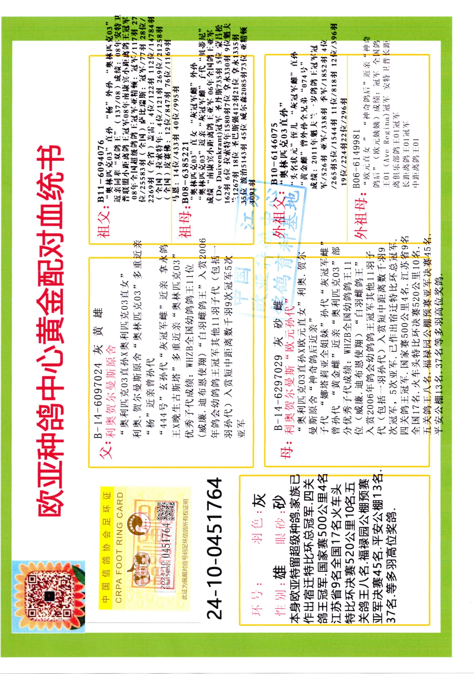 24年秋南京特比環(huán)歐亞榮獲大團體冠軍.小團體冠軍551公里大特比13名.14名.16名.19名.20名.21名.24名.26名.27名.28名.42名.52名.54名.57名.65名.66名.68名.70名.71名.72名.74名.76名.80名.82名.83名.84名.85名.86名.90名.92名.110名.116名.121名.122名.128名.131名.158名.161名.164名.165名.166名.172名.174名.177名.182名.195名.196名.201名.205名.208名.210名.216名.253名.269名.275名.276名.294名.296名.299名,,24年秋云南天南銅都公棚決賽415名.天南銅都小棚決賽409名.云南玉活公棚決賽102名.490名.團體32名上籠二羽進二羽,天南銅都大棚506公里決賽445名。熱烈祝賀河北省巨鹿縣李蘭生老師用歐亞泰山號血系連續(xù)十一年奪冠軍,河北省國家賽冠軍.全國季軍等多次前十名高位,揚州王軍王總用歐亞利奧24年春季獲山東翔宇公棚決賽33名蓋比53名。南京劉正龍劉總用歐亞蓋比獲得24年秋山東濰坊國際公棚決賽42名.精英賽30名.三關(guān)鴿王71名.決賽86名.加站賽16名.南京市特比環(huán)A組鴿王9名.B組鴿王5名.6名.C組鴿王5名.精英賽冠軍4名.技能賽A組冠軍4名.5名.秦淮區(qū)特比環(huán)榮獲15名.46名.48名.87名。四川西昌徐亮徐總用歐亞利奧獲得涼山州聚友決賽177名.第二關(guān)亞軍雙關(guān)鴿王19名.三關(guān)鴿王105名.云南豪庭公棚決賽603名。熱烈祝賀24年四川重慶翔園鴿舍用歐亞泰山號榮獲春季400公里冠軍.秋季500公里冠軍,河北王總用詹森X利奧獲得千羽千翔公棚400公里冠軍,廣東蔡楷煥榮獲24年秋愛好者 賽鴿俱樂部三關(guān)鴿王季軍.一關(guān)420公里99名.二關(guān)450公里11名.三關(guān)520公里32名.單關(guān)季軍.7名.12名,江西李衛(wèi)興榮獲貴州紅楓公棚8名.共翔俱樂部寄養(yǎng)棚四關(guān)綜合鴿王30名.一關(guān)400公里78名.二關(guān)500公里55名.三關(guān)520公里37名.四關(guān)500公里57名.同父母獲公棚18名.雷鳴獲得武漢黃浦育翔中心冠軍,四川陳文獲得四川明鴻俱樂部300公里夢幻2名.3名.4名.9名.10名.13名.14名.15名.31名.34名.40名.41名.42名.43名.69名.71名.72名.73名.74名.94名.95名.97名.98名.99名.419公里決賽榮獲總冠軍7名.總共歸巢9羽,四川徐亮獲豪庭決賽603名,山西鄭勇獲得山西泰鑫公棚決賽255名詹森紅狐,熱烈祝賀馬總獲得開爾(飛躍隊)決賽9名獲獎金1310000萬元.第一關(guān)52名,天津津福資賽180公里96名.獲獎金429543萬元,歐亞支持全國鴿友24年秋多人報喜 祝大家取得更好成績,給歐亞報喜鴿友歐亞決定給每人贈送一羽超級種鴿。歐亞俱樂部特比環(huán)多關(guān)鴿王成績:15年秋淮安特比環(huán)黑色星期一全會上籠9700多羽,當天無鴿歸巢,第二天全會歸巢357羽,本舍歸巢158羽.前十名八羽.前一百名歸巢57羽,16年春季獲五關(guān)鴿王總冠軍,總亞軍四名.六名.七名.九名.十名.晶藝俱樂部520公里冠亞季軍5名.6名.7名.9名.11名等,火車頭冠軍.季軍6名.8名.9名.10名,16年秋晶藝俱樂部特比環(huán)520公里亞軍.季軍4名.6名.7名.9名,15年春南京白下特比環(huán)冠軍.亞軍.季軍6名.7名.8名.9名.10名.指定鴿A B組獲得冠軍.亞軍.季軍4名.5名.,17年淮安特比環(huán)亞軍.4名.5名.7名.8名.10名.六關(guān)鴿王總冠軍.4名.6名.9名.10名,寄養(yǎng)棚宿遷劉總20羽特比環(huán)獲冠軍.季軍.4名.7名.8名.9名等。18年榮獲萬羽特比環(huán)六關(guān)鴿王總冠軍.總亞軍.總季軍.6名.8名.十名.單關(guān)四羽冠軍.二羽亞軍.四羽季軍.前十名27羽。19年秋萬羽特比環(huán)六關(guān)鴿王總亞軍.總季軍.5名.8名等,單關(guān)二羽冠軍.三羽亞軍.一羽季軍前十名31羽。20年秋淮安市鴿會四關(guān)特比環(huán)大賽風雨無阻鴿王亞軍.鴿王六名,金品俱樂部萬羽特比環(huán)六關(guān)鴿王總冠軍,總亞軍.四名.五名.六名.七名.八名.十名.前二百名鴿王35羽,單關(guān)冠亞季軍前十名四十多羽,火車頭五關(guān)鴿王季軍.六名.八名.前二百名鴿王十七羽。20年春榮獲淮安五區(qū)一市四關(guān)鴿王總冠軍.亞軍.四名.八名.九名。21年秋榮獲金品萬羽特比環(huán)大賽六關(guān)鴿王總亞軍.總季軍.四名.七名.九名.十名.單關(guān)冠亞軍季軍前十名三十多羽;疖囶^協(xié)會鴿王六名.七名.十名.單關(guān)前十名十七羽。22年秋榮獲鴿王總冠軍.總亞軍.5名.7名.8名.9名.11名.單關(guān)冠亞季軍前十名三十多羽,第一關(guān)單關(guān)前二百名四十多羽,第二關(guān)前二百名三十多羽,第三關(guān)前二百名四十多羽,第四關(guān)前二百名四十多羽,第五關(guān)前一百名53羽。23年秋榮獲鴿王季軍.五名.八名.十名.13名.17名.20名.27名等多羽鴿王.單關(guān)前十名二十多羽。公棚.寄養(yǎng)棚部分成績:16年秋寧夏黃河公棚總冠軍電腦戈馬力指定通炮冠軍,17年送八羽參賽獲得鴿王八名進獎四名,支持韓總榮獲八名。支持鴿友榮獲寧夏中衛(wèi)公棚決賽總冠軍.精英賽冠軍,支持18年寧夏黃河公棚決賽冠軍詹森X泰山。安徽鼎博寄養(yǎng)棚院內(nèi)外四關(guān)鴿王總冠軍.鴿王十七名.三十七名同窩,鴿王39名.42名.58名.67名。18年山東公棚預賽冠軍.決賽65名.送八羽進獎五羽.指定獲奔馳汽車一輛。支持鴿友獲得云南藍云公棚冠軍.蓋比X佛卡門。支持鴿友榮獲云南銀集公棚決賽冠軍 詹森427X520血系 速度賽6700羽冠軍。17年榮獲金馬俱樂部寄養(yǎng)棚四關(guān)鴿王總冠軍.季軍.六名.八名.第一關(guān)冠軍.亞軍.季軍四名.七名.十一名.金牌教練獎。支持鴿友18年北京費翔公棚預賽九名電腦X桑杰士,支持鴿友榮