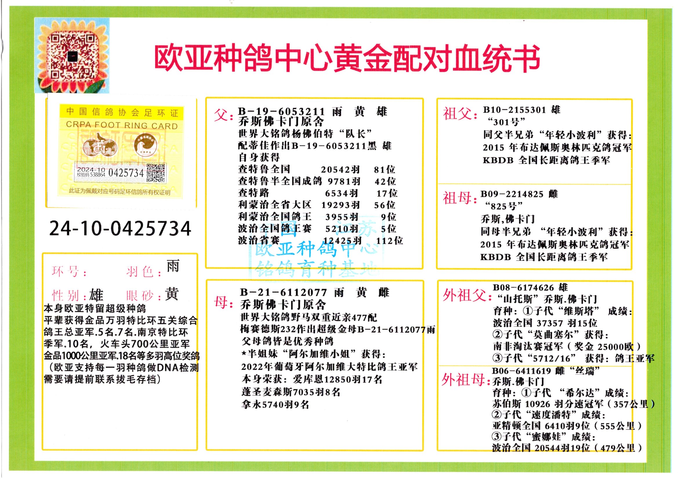 24年秋南京特比環(huán)歐亞榮獲大團(tuán)體冠軍.小團(tuán)體冠軍551公里大特比13名.14名.16名.19名.20名.21名.24名.26名.27名.28名.42名.52名.54名.57名.65名.66名.68名.70名.71名.72名.74名.76名.80名.82名.83名.84名.85名.86名.90名.92名.110名.116名.121名.122名.128名.131名.158名.161名.164名.165名.166名.172名.174名.177名.182名.195名.196名.201名.205名.208名.210名.216名.253名.269名.275名.276名.294名.296名.299名,,24年秋云南天南銅都公棚決賽415名.天南銅都小棚決賽409名.云南玉活公棚決賽102名.490名.團(tuán)體32名上籠二羽進(jìn)二羽,天南銅都大棚506公里決賽445名。熱烈祝賀河北省巨鹿縣李蘭生老師用歐亞泰山號血系連續(xù)十一年奪冠軍,河北省國家賽冠軍.全國季軍等多次前十名高位,揚(yáng)州王軍王總用歐亞利奧24年春季獲山東翔宇公棚決賽33名蓋比53名。南京劉正龍劉總用歐亞蓋比獲得24年秋山東濰坊國際公棚決賽42名.精英賽30名.三關(guān)鴿王71名.決賽86名.加站賽16名.南京市特比環(huán)A組鴿王9名.B組鴿王5名.6名.C組鴿王5名.精英賽冠軍4名.技能賽A組冠軍4名.5名.秦淮區(qū)特比環(huán)榮獲15名.46名.48名.87名。四川西昌徐亮徐總用歐亞利奧獲得涼山州聚友決賽177名.第二關(guān)亞軍雙關(guān)鴿王19名.三關(guān)鴿王105名.云南豪庭公棚決賽603名。熱烈祝賀24年四川重慶翔園鴿舍用歐亞泰山號榮獲春季400公里冠軍.秋季500公里冠軍,河北王總用詹森X利奧獲得千羽千翔公棚400公里冠軍,廣東蔡楷煥榮獲24年秋愛好者 賽鴿俱樂部三關(guān)鴿王季軍.一關(guān)420公里99名.二關(guān)450公里11名.三關(guān)520公里32名.單關(guān)季軍.7名.12名,江西李衛(wèi)興榮獲貴州紅楓公棚8名.共翔俱樂部寄養(yǎng)棚四關(guān)綜合鴿王30名.一關(guān)400公里78名.二關(guān)500公里55名.三關(guān)520公里37名.四關(guān)500公里57名.同父母獲公棚18名.雷鳴獲得武漢黃浦育翔中心冠軍,四川陳文獲得四川明鴻俱樂部300公里夢幻2名.3名.4名.9名.10名.13名.14名.15名.31名.34名.40名.41名.42名.43名.69名.71名.72名.73名.74名.94名.95名.97名.98名.99名.419公里決賽榮獲總冠軍7名.總共歸巢9羽,四川徐亮獲豪庭決賽603名,山西鄭勇獲得山西泰鑫公棚決賽255名詹森紅狐,熱烈祝賀馬總獲得開爾(飛躍隊(duì))決賽9名獲獎金1310000萬元.第一關(guān)52名,天津津福資賽180公里96名.獲獎金429543萬元,歐亞支持全國鴿友24年秋多人報(bào)喜 祝大家取得更好成績,給歐亞報(bào)喜鴿友歐亞決定給每人贈送一羽超級種鴿。歐亞俱樂部特比環(huán)多關(guān)鴿王成績:15年秋淮安特比環(huán)黑色星期一全會上籠9700多羽,當(dāng)天無鴿歸巢,第二天全會歸巢357羽,本舍歸巢158羽.前十名八羽.前一百名歸巢57羽,16年春季獲五關(guān)鴿王總冠軍,總亞軍四名.六名.七名.九名.十名.晶藝俱樂部520公里冠亞季軍5名.6名.7名.9名.11名等,火車頭冠軍.季軍6名.8名.9名.10名,16年秋晶藝俱樂部特比環(huán)520公里亞軍.季軍4名.6名.7名.9名,15年春南京白下特比環(huán)冠軍.亞軍.季軍6名.7名.8名.9名.10名.指定鴿A B組獲得冠軍.亞軍.季軍4名.5名.,17年淮安特比環(huán)亞軍.4名.5名.7名.8名.10名.六關(guān)鴿王總冠軍.4名.6名.9名.10名,寄養(yǎng)棚宿遷劉總20羽特比環(huán)獲冠軍.季軍.4名.7名.8名.9名等。18年榮獲萬羽特比環(huán)六關(guān)鴿王總冠軍.總亞軍.總季軍.6名.8名.十名.單關(guān)四羽冠軍.二羽亞軍.四羽季軍.前十名27羽。19年秋萬羽特比環(huán)六關(guān)鴿王總亞軍.總季軍.5名.8名等,單關(guān)二羽冠軍.三羽亞軍.一羽季軍前十名31羽。20年秋淮安市鴿會四關(guān)特比環(huán)大賽風(fēng)雨無阻鴿王亞軍.鴿王六名,金品俱樂部萬羽特比環(huán)六關(guān)鴿王總冠軍,總亞軍.四名.五名.六名.七名.八名.十名.前二百名鴿王35羽,單關(guān)冠亞季軍前十名四十多羽,火車頭五關(guān)鴿王季軍.六名.八名.前二百名鴿王十七羽。20年春榮獲淮安五區(qū)一市四關(guān)鴿王總冠軍.亞軍.四名.八名.九名。21年秋榮獲金品萬羽特比環(huán)大賽六關(guān)鴿王總亞軍.總季軍.四名.七名.九名.十名.單關(guān)冠亞軍季軍前十名三十多羽;疖囶^協(xié)會鴿王六名.七名.十名.單關(guān)前十名十七羽。22年秋榮獲鴿王總冠軍.總亞軍.5名.7名.8名.9名.11名.單關(guān)冠亞季軍前十名三十多羽,第一關(guān)單關(guān)前二百名四十多羽,第二關(guān)前二百名三十多羽,第三關(guān)前二百名四十多羽,第四關(guān)前二百名四十多羽,第五關(guān)前一百名53羽。23年秋榮獲鴿王季軍.五名.八名.十名.13名.17名.20名.27名等多羽鴿王.單關(guān)前十名二十多羽。公棚.寄養(yǎng)棚部分成績:16年秋寧夏黃河公棚總冠軍電腦戈馬力指定通炮冠軍,17年送八羽參賽獲得鴿王八名進(jìn)獎四名,支持韓總榮獲八名。支持鴿友榮獲寧夏中衛(wèi)公棚決賽總冠軍.精英賽冠軍,支持18年寧夏黃河公棚決賽冠軍詹森X泰山。安徽鼎博寄養(yǎng)棚院內(nèi)外四關(guān)鴿王總冠軍.鴿王十七名.三十七名同窩,鴿王39名.42名.58名.67名。18年山東公棚預(yù)賽冠軍.決賽65名.送八羽進(jìn)獎五羽.指定獲奔馳汽車一輛。支持鴿友獲得云南藍(lán)云公棚冠軍.蓋比X佛卡門。支持鴿友榮獲云南銀集公棚決賽冠軍 詹森427X520血系 速度賽6700羽冠軍。17年榮獲金馬俱樂部寄養(yǎng)棚四關(guān)鴿王總冠軍.季軍.六名.八名.第一關(guān)冠軍.亞軍.季軍四名.七名.十一名.金牌教