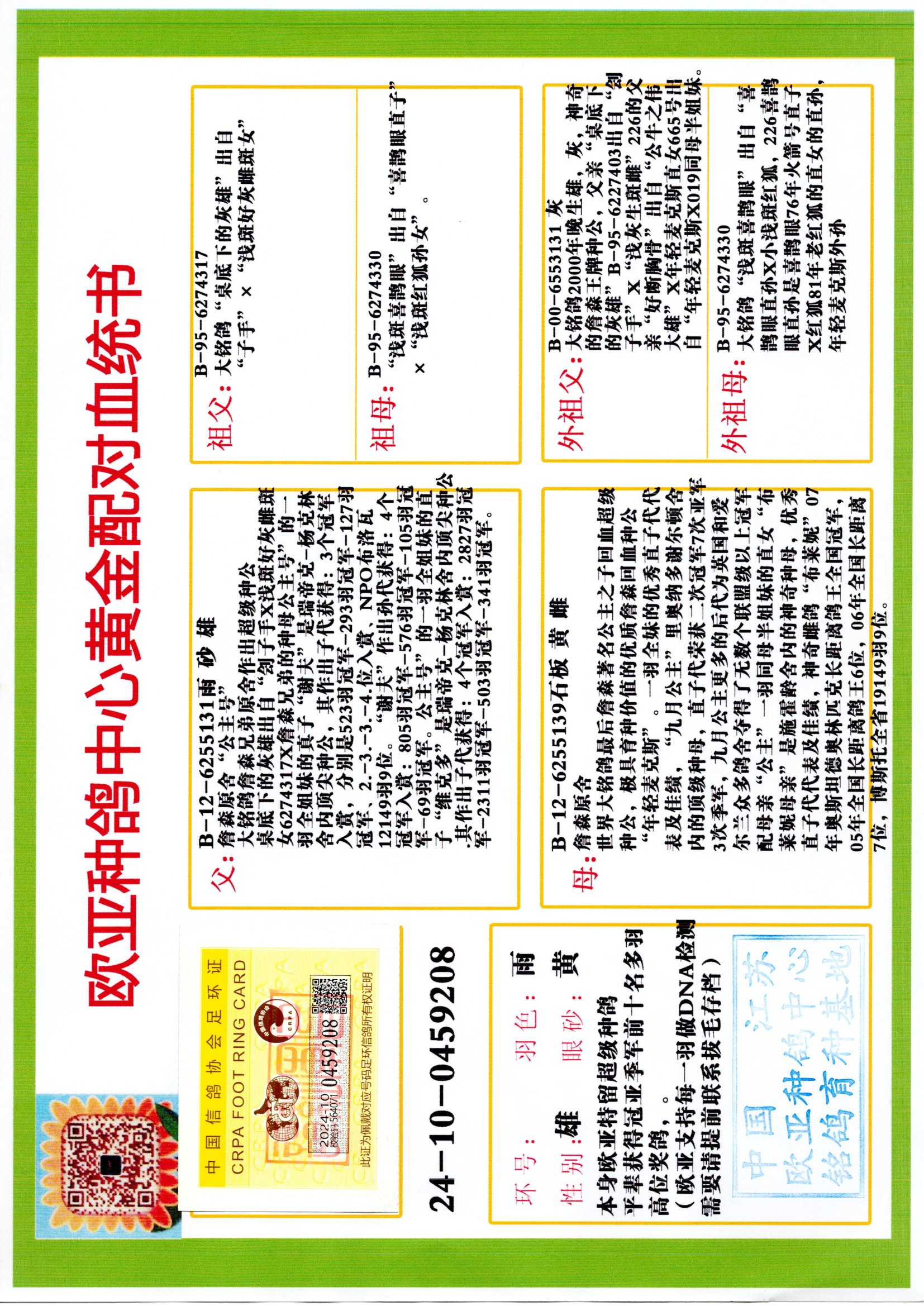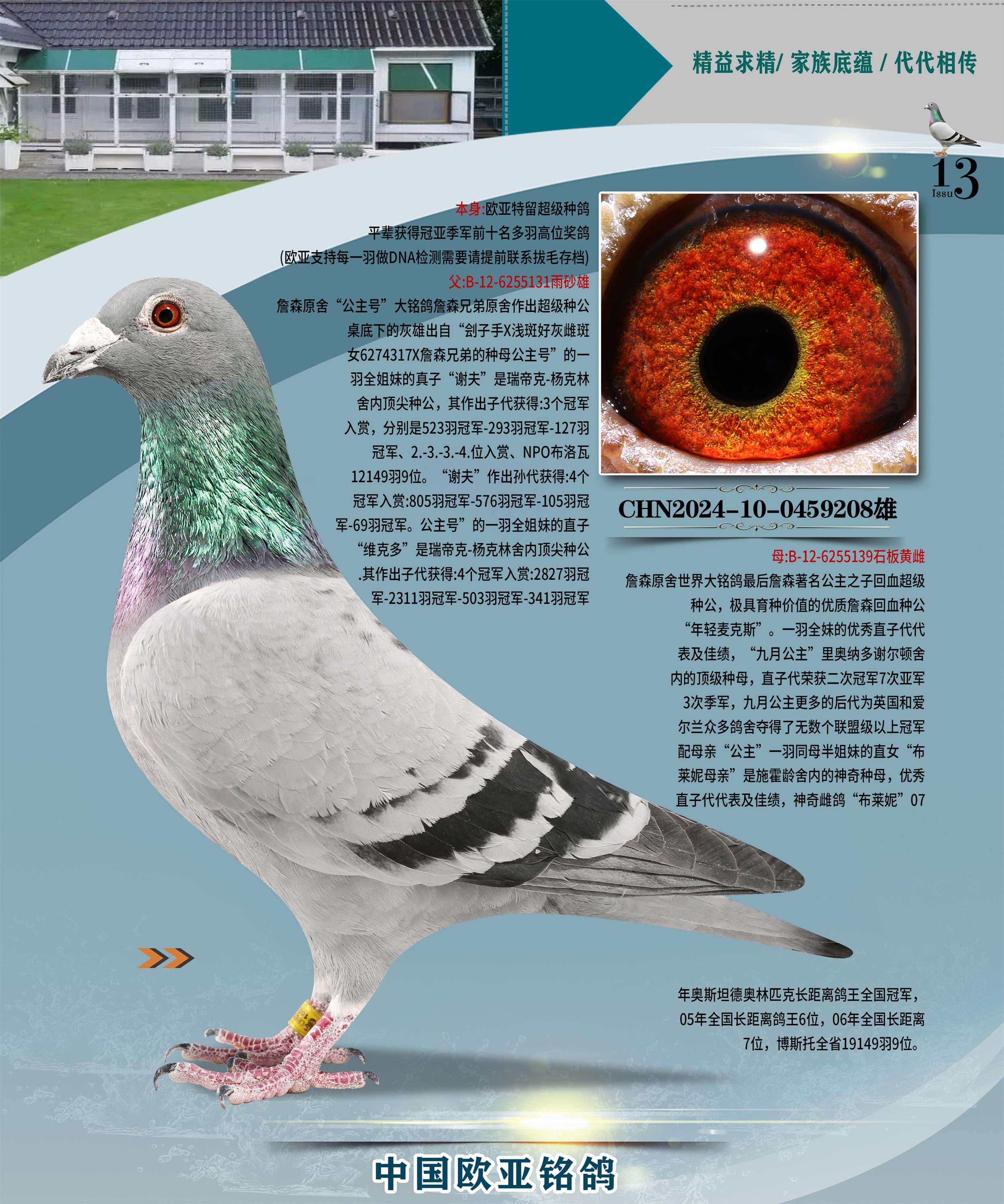24年秋南京特比環(huán)歐亞榮獲大團體冠軍.小團體冠軍551公里大特比13名.14名.16名.19名.20名.21名.24名.26名.27名.28名.42名.52名.54名.57名.65名.66名.68名.70名.71名.72名.74名.76名.80名.82名.83名.84名.85名.86名.90名.92名.110名.116名.121名.122名.128名.131名.158名.161名.164名.165名.166名.172名.174名.177名.182名.195名.196名.201名.205名.208名.210名.216名.253名.269名.275名.276名.294名.296名.299名,,24年秋云南天南銅都公棚決賽415名.天南銅都小棚決賽409名.云南玉活公棚決賽102名.490名.團體32名上籠二羽進二羽,天南銅都大棚506公里決賽445名。熱烈祝賀河北省巨鹿縣李蘭生老師用歐亞泰山號血系連續(xù)十一年奪冠軍,河北省國家賽冠軍.全國季軍等多次前十名高位,揚州王軍王總用歐亞利奧24年春季獲山東翔宇公棚決賽33名蓋比53名。南京劉正龍劉總用歐亞蓋比獲得24年秋山東濰坊國際公棚決賽42名.精英賽30名.三關(guān)鴿王71名.決賽86名.加站賽16名.南京市特比環(huán)A組鴿王9名.B組鴿王5名.6名.C組鴿王5名.精英賽冠軍4名.技能賽A組冠軍4名.5名.秦淮區(qū)特比環(huán)榮獲15名.46名.48名.87名。四川西昌徐亮徐總用歐亞利奧獲得涼山州聚友決賽177名.第二關(guān)亞軍雙關(guān)鴿王19名.三關(guān)鴿王105名.云南豪庭公棚決賽603名。熱烈祝賀24年四川重慶翔園鴿舍用歐亞泰山號榮獲春季400公里冠軍.秋季500公里冠軍,河北王總用詹森X利奧獲得千羽千翔公棚400公里冠軍,廣東蔡楷煥榮獲24年秋愛好者 賽鴿俱樂部三關(guān)鴿王季軍.一關(guān)420公里99名.二關(guān)450公里11名.三關(guān)520公里32名.單關(guān)季軍.7名.12名,江西李衛(wèi)興榮獲貴州紅楓公棚8名.共翔俱樂部寄養(yǎng)棚四關(guān)綜合鴿王30名.一關(guān)400公里78名.二關(guān)500公里55名.三關(guān)520公里37名.四關(guān)500公里57名.同父母獲公棚18名.雷鳴獲得武漢黃浦育翔中心冠軍,四川陳文獲得四川明鴻俱樂部300公里夢幻2名.3名.4名.9名.10名.13名.14名.15名.31名.34名.40名.41名.42名.43名.69名.71名.72名.73名.74名.94名.95名.97名.98名.99名.419公里決賽榮獲總冠軍7名.總共歸巢9羽,四川徐亮獲豪庭決賽603名,山西鄭勇獲得山西泰鑫公棚決賽255名詹森紅狐,熱烈祝賀馬總獲得開爾(飛躍隊)決賽9名獲獎金1310000萬元.第一關(guān)52名,天津津福資賽180公里96名.獲獎金429543萬元,歐亞支持全國鴿友24年秋多人報喜 祝大家取得更好成績,給歐亞報喜鴿友歐亞決定給每人贈送一羽超級種鴿。歐亞俱樂部特比環(huán)多關(guān)鴿王成績:15年秋淮安特比環(huán)黑色星期一全會上籠9700多羽,當天無鴿歸巢,第二天全會歸巢357羽,本舍歸巢158羽.前十名八羽.前一百名歸巢57羽,16年春季獲五關(guān)鴿王總冠軍,總亞軍四名.六名.七名.九名.十名.晶藝俱樂部520公里冠亞季軍5名.6名.7名.9名.11名等,火車頭冠軍.季軍6名.8名.9名.10名,16年秋晶藝俱樂部特比環(huán)520公里亞軍.季軍4名.6名.7名.9名,15年春南京白下特比環(huán)冠軍.亞軍.季軍6名.7名.8名.9名.10名.指定鴿A B組獲得冠軍.亞軍.季軍4名.5名.,17年淮安特比環(huán)亞軍.4名.5名.7名.8名.10名.六關(guān)鴿王總冠軍.4名.6名.9名.10名,寄養(yǎng)棚宿遷劉總20羽特比環(huán)獲冠軍.季軍.4名.7名.8名.9名等。18年榮獲萬羽特比環(huán)六關(guān)鴿王總冠軍.總亞軍.總季軍.6名.8名.十名.單關(guān)四羽冠軍.二羽亞軍.四羽季軍.前十名27羽。19年秋萬羽特比環(huán)六關(guān)鴿王總亞軍.總季軍.5名.8名等,單關(guān)二羽冠軍.三羽亞軍.一羽季軍前十名31羽。20年秋淮安市鴿會四關(guān)特比環(huán)大賽風(fēng)雨無阻鴿王亞軍.鴿王六名,金品俱樂部萬羽特比環(huán)六關(guān)鴿王總冠軍,總亞軍.四名.五名.六名.七名.八名.十名.前二百名鴿王35羽,單關(guān)冠亞季軍前十名四十多羽,火車頭五關(guān)鴿王季軍.六名.八名.前二百名鴿王十七羽。20年春榮獲淮安五區(qū)一市四關(guān)鴿王總冠軍.亞軍.四名.八名.九名。21年秋榮獲金品萬羽特比環(huán)大賽六關(guān)鴿王總亞軍.總季軍.四名.七名.九名.十名.單關(guān)冠亞軍季軍前十名三十多羽。火車頭協(xié)會鴿王六名.七名.十名.單關(guān)前十名十七羽。22年秋榮獲鴿王總冠軍.總亞軍.5名.7名.8名.9名.11名.單關(guān)冠亞季軍前十名三十多羽,第一關(guān)單關(guān)前二百名四十多羽,第二關(guān)前二百名三十多羽,第三關(guān)前二百名四十多羽,第四關(guān)前二百名四十多羽,第五關(guān)前一百名53羽。23年秋榮獲鴿王季軍.五名.八名.十名.13名.17名.20名.27名等多羽鴿王.單關(guān)前十名二十多羽。公棚.寄養(yǎng)棚部分成績:16年秋寧夏黃河公棚總冠軍電腦戈馬力指定通炮冠軍,17年送八羽參賽獲得鴿王八名進獎四名,支持韓總榮獲八名。支持鴿友榮獲寧夏中衛(wèi)公棚決賽總冠軍.精英賽冠軍,支持18年寧夏黃河公棚決賽冠軍詹森X泰山。安徽鼎博寄養(yǎng)棚院內(nèi)外四關(guān)鴿王總冠軍.鴿王十七名.三十七名同窩,鴿王39名.42名.58名.67名。18年山東公棚預(yù)賽冠軍.決賽65名.送八羽進獎五羽.指定獲奔馳汽車一輛。支持鴿友獲得云南藍云公棚冠軍.蓋比X佛卡門。支持鴿友榮獲云南銀集公棚決賽冠軍 詹森427X520血系 速度賽6700羽冠軍。17年榮獲金馬俱樂部寄養(yǎng)棚四關(guān)鴿王總冠軍.季軍.六名.八名.第一關(guān)冠軍.亞軍.季軍四名.七名.十一名.金牌教練獎。支持鴿友18年北京費翔公棚預(yù)賽九名電腦X桑