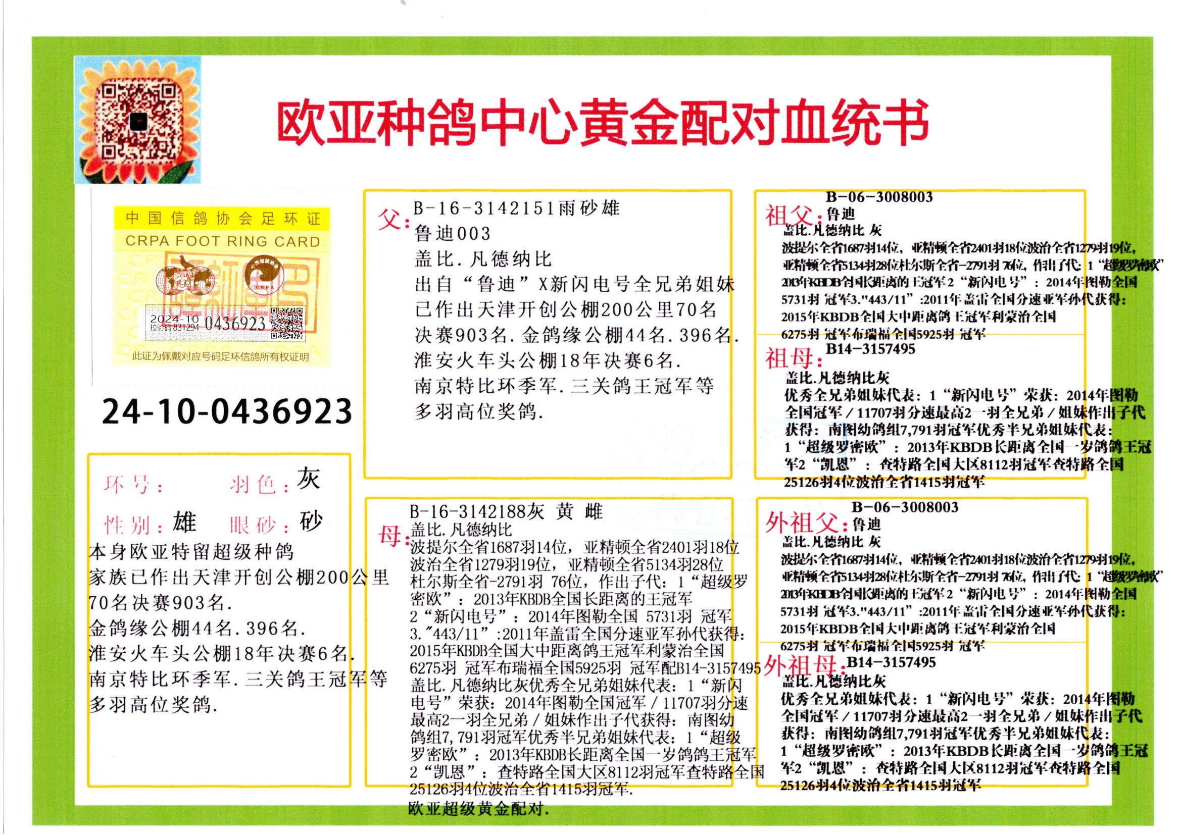 24年秋南京特比環(huán)歐亞榮獲大團(tuán)體冠軍.小團(tuán)體冠軍551公里大特比13名.14名.16名.19名.20名.21名.24名.26名.27名.28名.42名.52名.54名.57名.65名.66名.68名.70名.71名.72名.74名.76名.80名.82名.83名.84名.85名.86名.90名.92名.110名.116名.121名.122名.128名.131名.158名.161名.164名.165名.166名.172名.174名.177名.182名.195名.196名.201名.205名.208名.210名.216名.253名.269名.275名.276名.294名.296名.299名,,24年秋云南天南銅都公棚決賽415名.天南銅都小棚決賽409名.云南玉活公棚決賽102名.490名.團(tuán)體32名上籠二羽進(jìn)二羽,天南銅都大棚506公里決賽445名。熱烈祝賀河北省巨鹿縣李蘭生老師用歐亞泰山號血系連續(xù)十一年奪冠軍,河北省國家賽冠軍.全國季軍等多次前十名高位,揚(yáng)州王軍王總用歐亞利奧24年春季獲山東翔宇公棚決賽33名蓋比53名。南京劉正龍劉總用歐亞蓋比獲得24年秋山東濰坊國際公棚決賽42名.精英賽30名.三關(guān)鴿王71名.決賽86名.加站賽16名.南京市特比環(huán)A組鴿王9名.B組鴿王5名.6名.C組鴿王5名.精英賽冠軍4名.技能賽A組冠軍4名.5名.秦淮區(qū)特比環(huán)榮獲15名.46名.48名.87名。四川西昌徐亮徐總用歐亞利奧獲得涼山州聚友決賽177名.第二關(guān)亞軍雙關(guān)鴿王19名.三關(guān)鴿王105名.云南豪庭公棚決賽603名。熱烈祝賀24年四川重慶翔園鴿舍用歐亞泰山號榮獲春季400公里冠軍.秋季500公里冠軍,河北王總用詹森X利奧獲得千羽千翔公棚400公里冠軍,廣東蔡楷煥榮獲24年秋愛好者 賽鴿俱樂部三關(guān)鴿王季軍.一關(guān)420公里99名.二關(guān)450公里11名.三關(guān)520公里32名.單關(guān)季軍.7名.12名,江西李衛(wèi)興榮獲貴州紅楓公棚8名.共翔俱樂部寄養(yǎng)棚四關(guān)綜合鴿王30名.一關(guān)400公里78名.二關(guān)500公里55名.三關(guān)520公里37名.四關(guān)500公里57名.同父母獲公棚18名.雷鳴獲得武漢黃浦育翔中心冠軍,四川陳文獲得四川明鴻俱樂部300公里夢幻2名.3名.4名.9名.10名.13名.14名.15名.31名.34名.40名.41名.42名.43名.69名.71名.72名.73名.74名.94名.95名.97名.98名.99名.419公里決賽榮獲總冠軍7名.總共歸巢9羽,四川徐亮獲豪庭決賽603名,山西鄭勇獲得山西泰鑫公棚決賽255名詹森紅狐,熱烈祝賀馬總獲得開爾(飛躍隊(duì))決賽9名獲獎金1310000萬元.第一關(guān)52名,天津津福資賽180公里96名.獲獎金429543萬元,歐亞支持全國鴿友24年秋多人報喜 祝大家取得更好成績,給歐亞報喜鴿友歐亞決定給每人贈送一羽超級種鴿。歐亞俱樂部特比環(huán)多關(guān)鴿王成績:15年秋淮安特比環(huán)黑色星期一全會上籠9700多羽,當(dāng)天無鴿歸巢,第二天全會歸巢357羽,本舍歸巢158羽.前十名八羽.前一百名歸巢57羽,16年春季獲五關(guān)鴿王總冠軍,總亞軍四名.六名.七名.九名.十名.晶藝俱樂部520公里冠亞季軍5名.6名.7名.9名.11名等,火車頭冠軍.季軍6名.8名.9名.10名,16年秋晶藝俱樂部特比環(huán)520公里亞軍.季軍4名.6名.7名.9名,15年春南京白下特比環(huán)冠軍.亞軍.季軍6名.7名.8名.9名.10名.指定鴿A B組獲得冠軍.亞軍.季軍4名.5名.,17年淮安特比環(huán)亞軍.4名.5名.7名.8名.10名.六關(guān)鴿王總冠軍.4名.6名.9名.10名,寄養(yǎng)棚宿遷劉總20羽特比環(huán)獲冠軍.季軍.4名.7名.8名.9名等。18年榮獲萬羽特比環(huán)六關(guān)鴿王總冠軍.總亞軍.總季軍.6名.8名.十名.單關(guān)四羽冠軍.二羽亞軍.四羽季軍.前十名27羽。19年秋萬羽特比環(huán)六關(guān)鴿王總亞軍.總季軍.5名.8名等,單關(guān)二羽冠軍.三羽亞軍.一羽季軍前十名31羽。20年秋淮安市鴿會四關(guān)特比環(huán)大賽風(fēng)雨無阻鴿王亞軍.鴿王六名,金品俱樂部萬羽特比環(huán)六關(guān)鴿王總冠軍,總亞軍.四名.五名.六名.七名.八名.十名.前二百名鴿王35羽,單關(guān)冠亞季軍前十名四十多羽,火車頭五關(guān)鴿王季軍.六名.八名.前二百名鴿王十七羽。20年春榮獲淮安五區(qū)一市四關(guān)鴿王總冠軍.亞軍.四名.八名.九名。21年秋榮獲金品萬羽特比環(huán)大賽六關(guān)鴿王總亞軍.總季軍.四名.七名.九名.十名.單關(guān)冠亞軍季軍前十名三十多羽;疖囶^協(xié)會鴿王六名.七名.十名.單關(guān)前十名十七羽。22年秋榮獲鴿王總冠軍.總亞軍.5名.7名.8名.9名.11名.單關(guān)冠亞季軍前十名三十多羽,第一關(guān)單關(guān)前二百名四十多羽,第二關(guān)前二百名三十多羽,第三關(guān)前二百名四十多羽,第四關(guān)前二百名四十多羽,第五關(guān)前一百名53羽。23年秋榮獲鴿王季軍.五名.八名.十名.13名.17名.20名.27名等多羽鴿王.單關(guān)前十名二十多羽。公棚.寄養(yǎng)棚部分成績:16年秋寧夏黃河公棚總冠軍電腦戈馬力指定通炮冠軍,17年送八羽參賽獲得鴿王八名進(jìn)獎四名,支持韓總榮獲八名。支持鴿友榮獲寧夏中衛(wèi)公棚決賽總冠軍.精英賽冠軍,支持18年寧夏黃河公棚決賽冠軍詹森X泰山。安徽鼎博寄養(yǎng)棚院內(nèi)外四關(guān)鴿王總冠軍.鴿王十七名.三十七名同窩,鴿王39名.42名.58名.67名。18年山東公棚預(yù)賽冠軍.決賽65名.送八羽進(jìn)獎五羽.指定獲奔馳汽車一輛。支持鴿友獲得云南藍(lán)云公棚冠軍.蓋比X佛卡門。支持鴿友榮獲云南銀集公棚決賽冠軍 詹森427X520血系 速度賽6700羽冠軍。17年榮獲金馬俱樂部寄養(yǎng)棚四關(guān)鴿王總冠軍.季軍.六名.八名.第一關(guān)冠軍.亞軍.季軍四名.七名.十一名.金牌教練獎。支
