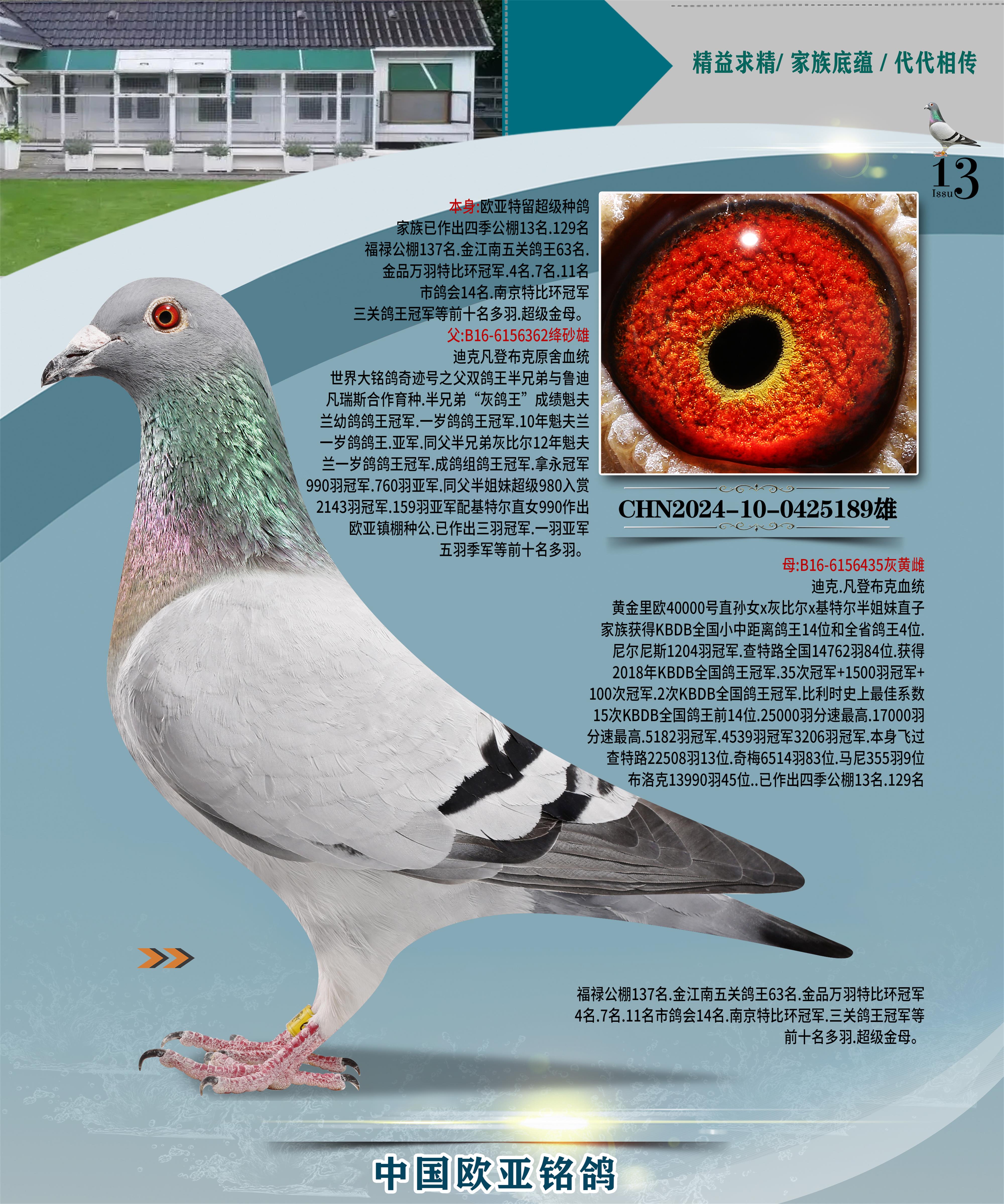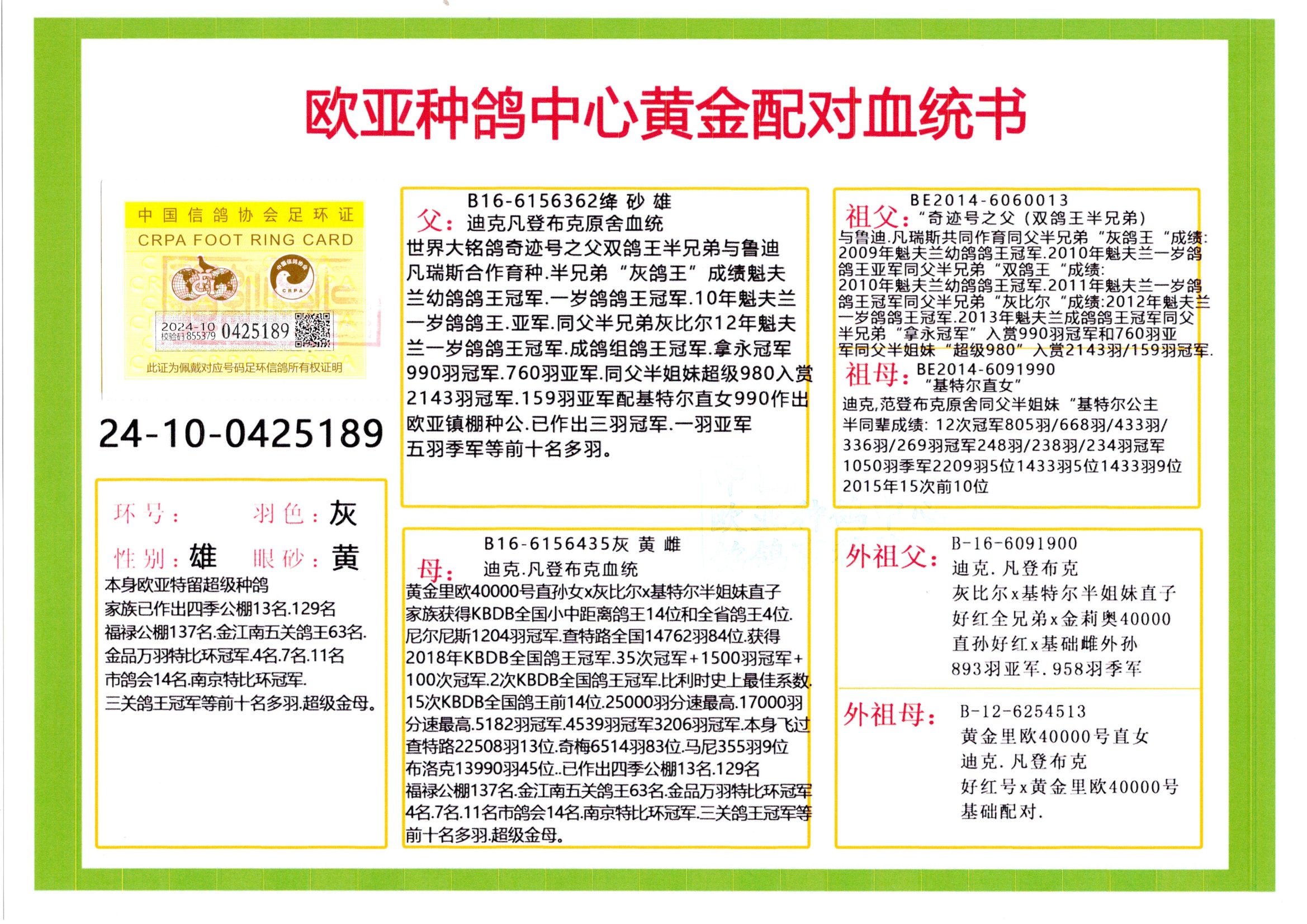 24年秋南京特比環(huán)歐亞榮獲大團體冠軍.小團體冠軍551公里大特比13名.14名.16名.19名.20名.21名.24名.26名.27名.28名.42名.52名.54名.57名.65名.66名.68名.70名.71名.72名.74名.76名.80名.82名.83名.84名.85名.86名.90名.92名.110名.116名.121名.122名.128名.131名.158名.161名.164名.165名.166名.172名.174名.177名.182名.195名.196名.201名.205名.208名.210名.216名.253名.269名.275名.276名.294名.296名.299名,,24年秋云南天南銅都公棚決賽415名.天南銅都小棚決賽409名.云南玉活公棚決賽102名.490名.團體32名上籠二羽進二羽,天南銅都大棚506公里決賽445名。熱烈祝賀河北省巨鹿縣李蘭生老師用歐亞泰山號血系連續(xù)十一年奪冠軍,河北省國家賽冠軍.全國季軍等多次前十名高位,揚州王軍王總用歐亞利奧24年春季獲山東翔宇公棚決賽33名蓋比53名。南京劉正龍劉總用歐亞蓋比獲得24年秋山東濰坊國際公棚決賽42名.精英賽30名.三關鴿王71名.決賽86名.加站賽16名.南京市特比環(huán)A組鴿王9名.B組鴿王5名.6名.C組鴿王5名.精英賽冠軍4名.技能賽A組冠軍4名.5名.秦淮區(qū)特比環(huán)榮獲15名.46名.48名.87名。四川西昌徐亮徐總用歐亞利奧獲得涼山州聚友決賽177名.第二關亞軍雙關鴿王19名.三關鴿王105名.云南豪庭公棚決賽603名。熱烈祝賀24年四川重慶翔園鴿舍用歐亞泰山號榮獲春季400公里冠軍.秋季500公里冠軍,河北王總用詹森X利奧獲得千羽千翔公棚400公里冠軍,廣東蔡楷煥榮獲24年秋愛好者 賽鴿俱樂部三關鴿王季軍.一關420公里99名.二關450公里11名.三關520公里32名.單關季軍.7名.12名,江西李衛(wèi)興榮獲貴州紅楓公棚8名.共翔俱樂部寄養(yǎng)棚四關綜合鴿王30名.一關400公里78名.二關500公里55名.三關520公里37名.四關500公里57名.同父母獲公棚18名.雷鳴獲得武漢黃浦育翔中心冠軍,四川陳文獲得四川明鴻俱樂部300公里夢幻2名.3名.4名.9名.10名.13名.14名.15名.31名.34名.40名.41名.42名.43名.69名.71名.72名.73名.74名.94名.95名.97名.98名.99名.419公里決賽榮獲總冠軍7名.總共歸巢9羽,四川徐亮獲豪庭決賽603名,山西鄭勇獲得山西泰鑫公棚決賽255名詹森紅狐,熱烈祝賀馬總獲得開爾(飛躍隊)決賽9名獲獎金1310000萬元.第一關52名,天津津福資賽180公里96名.獲獎金429543萬元,歐亞支持全國鴿友24年秋多人報喜 祝大家取得更好成績,給歐亞報喜鴿友歐亞決定給每人贈送一羽超級種鴿。歐亞俱樂部特比環(huán)多關鴿王成績:15年秋淮安特比環(huán)黑色星期一全會上籠9700多羽,當天無鴿歸巢,第二天全會歸巢357羽,本舍歸巢158羽.前十名八羽.前一百名歸巢57羽,16年春季獲五關鴿王總冠軍,總亞軍四名.六名.七名.九名.十名.晶藝俱樂部520公里冠亞季軍5名.6名.7名.9名.11名等,火車頭冠軍.季軍6名.8名.9名.10名,16年秋晶藝俱樂部特比環(huán)520公里亞軍.季軍4名.6名.7名.9名,15年春南京白下特比環(huán)冠軍.亞軍.季軍6名.7名.8名.9名.10名.指定鴿A B組獲得冠軍.亞軍.季軍4名.5名.,17年淮安特比環(huán)亞軍.4名.5名.7名.8名.10名.六關鴿王總冠軍.4名.6名.9名.10名,寄養(yǎng)棚宿遷劉總20羽特比環(huán)獲冠軍.季軍.4名.7名.8名.9名等。18年榮獲萬羽特比環(huán)六關鴿王總冠軍.總亞軍.總季軍.6名.8名.十名.單關四羽冠軍.二羽亞軍.四羽季軍.前十名27羽。19年秋萬羽特比環(huán)六關鴿王總亞軍.總季軍.5名.8名等,單關二羽冠軍.三羽亞軍.一羽季軍前十名31羽。20年秋淮安市鴿會四關特比環(huán)大賽風雨無阻鴿王亞軍.鴿王六名,金品俱樂部萬羽特比環(huán)六關鴿王總冠軍,總亞軍.四名.五名.六名.七名.八名.十名.前二百名鴿王35羽,單關冠亞季軍前十名四十多羽,火車頭五關鴿王季軍.六名.八名.前二百名鴿王十七羽。20年春榮獲淮安五區(qū)一市四關鴿王總冠軍.亞軍.四名.八名.九名。21年秋榮獲金品萬羽特比環(huán)大賽六關鴿王總亞軍.總季軍.四名.七名.九名.十名.單關冠亞軍季軍前十名三十多羽;疖囶^協(xié)會鴿王六名.七名.十名.單關前十名十七羽。22年秋榮獲鴿王總冠軍.總亞軍.5名.7名.8名.9名.11名.單關冠亞季軍前十名三十多羽,第一關單關前二百名四十多羽,第二關前二百名三十多羽,第三關前二百名四十多羽,第四關前二百名四十多羽,第五關前一百名53羽。23年秋榮獲鴿王季軍.五名.八名.十名.13名.17名.20名.27名等多羽鴿王.單關前十名二十多羽。公棚.寄養(yǎng)棚部分成績:16年秋寧夏黃河公棚總冠軍電腦戈馬力指定通炮冠軍,17年送八羽參賽獲得鴿王八名進獎四名,支持韓總榮獲八名。支持鴿友榮獲寧夏中衛(wèi)公棚決賽總冠軍.精英賽冠軍,支持18年寧夏黃河公棚決賽冠軍詹森X泰山。安徽鼎博寄養(yǎng)棚院內(nèi)外四關鴿王總冠軍.鴿王十七名.三十七名同窩,鴿王39名.42名.58名.67名。18年山東公棚預賽冠軍.決賽65名.送八羽進獎五羽.指定獲奔馳汽車一輛。支持鴿友獲得云南藍云公棚冠軍.蓋比X佛卡門。支持鴿友榮獲云南銀集公棚決賽冠軍 詹森427X520血系 速度賽6700羽冠軍。17年榮獲金馬俱樂部寄養(yǎng)棚四關鴿王總冠軍.季軍.六名.八名.第一關冠軍.亞軍.季軍四名.七名.十一名.金牌教練獎。支持鴿友18年北京費翔公棚預賽九名電腦X桑杰士,支持鴿友榮獲陜西威力公棚決賽11名.內(nèi)蒙古臨河寄養(yǎng)棚四關鴿王六名.詹森配泰山,支持河北王總用歐亞詹森427配胡本喜獲20年秋開爾青年棚季軍。云南東榮公棚16年預賽冠軍.決賽77名.17年決賽12名.詹森紅狐X泰山,17年平安公