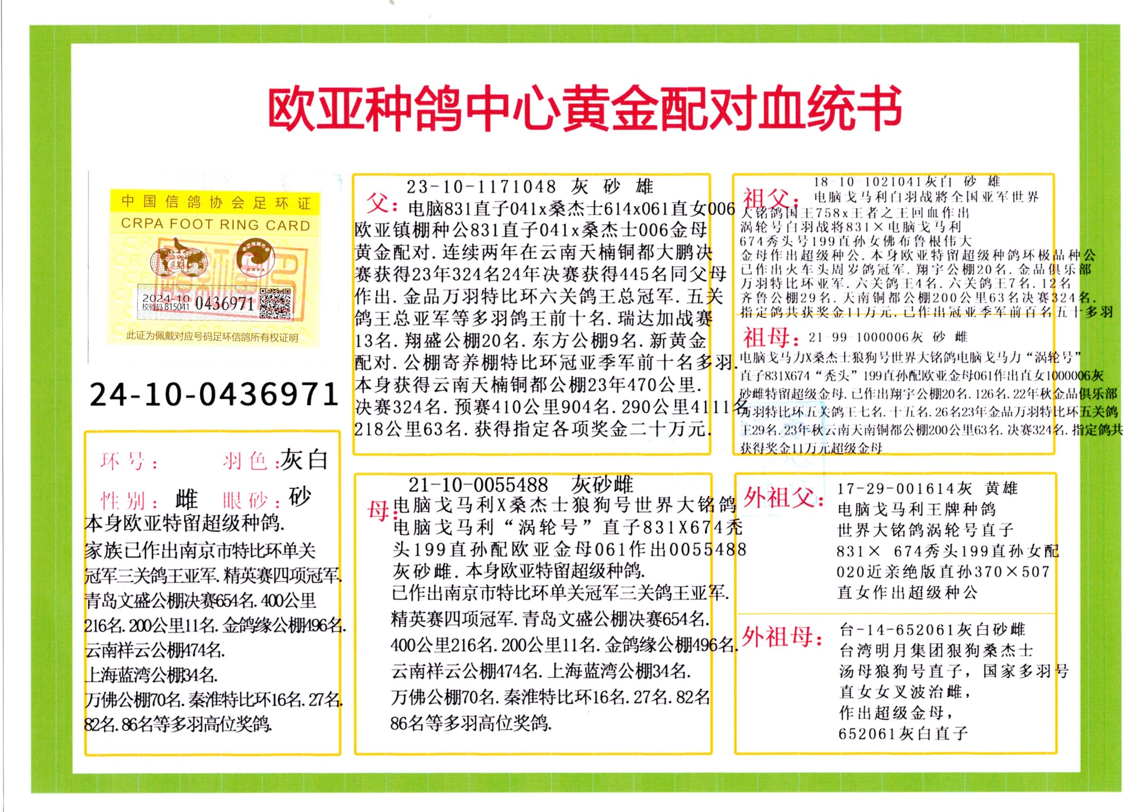 24年秋南京特比環(huán)歐亞榮獲大團體冠軍.小團體冠軍551公里大特比13名.14名.16名.19名.20名.21名.24名.26名.27名.28名.42名.52名.54名.57名.65名.66名.68名.70名.71名.72名.74名.76名.80名.82名.83名.84名.85名.86名.90名.92名.110名.116名.121名.122名.128名.131名.158名.161名.164名.165名.166名.172名.174名.177名.182名.195名.196名.201名.205名.208名.210名.216名.253名.269名.275名.276名.294名.296名.299名,,24年秋云南天南銅都公棚決賽415名.天南銅都小棚決賽409名.云南玉活公棚決賽102名.490名.團體32名上籠二羽進(jìn)二羽,天南銅都大棚506公里決賽445名。熱烈祝賀河北省巨鹿縣李蘭生老師用歐亞泰山號血系連續(xù)十一年奪冠軍,河北省國家賽冠軍.全國季軍等多次前十名高位,揚州王軍王總用歐亞利奧24年春季獲山東翔宇公棚決賽33名蓋比53名。南京劉正龍劉總用歐亞蓋比獲得24年秋山東濰坊國際公棚決賽42名.精英賽30名.三關(guān)鴿王71名.決賽86名.加站賽16名.南京市特比環(huán)A組鴿王9名.B組鴿王5名.6名.C組鴿王5名.精英賽冠軍4名.技能賽A組冠軍4名.5名.秦淮區(qū)特比環(huán)榮獲15名.46名.48名.87名。四川西昌徐亮徐總用歐亞利奧獲得涼山州聚友決賽177名.第二關(guān)亞軍雙關(guān)鴿王19名.三關(guān)鴿王105名.云南豪庭公棚決賽603名。熱烈祝賀24年四川重慶翔園鴿舍用歐亞泰山號榮獲春季400公里冠軍.秋季500公里冠軍,河北王總用詹森X利奧獲得千羽千翔公棚400公里冠軍,廣東蔡楷煥榮獲24年秋愛好者 賽鴿俱樂部三關(guān)鴿王季軍.一關(guān)420公里99名.二關(guān)450公里11名.三關(guān)520公里32名.單關(guān)季軍.7名.12名,江西李衛(wèi)興榮獲貴州紅楓公棚8名.共翔俱樂部寄養(yǎng)棚四關(guān)綜合鴿王30名.一關(guān)400公里78名.二關(guān)500公里55名.三關(guān)520公里37名.四關(guān)500公里57名.同父母獲公棚18名.雷鳴獲得武漢黃浦育翔中心冠軍,四川陳文獲得四川明鴻俱樂部300公里夢幻2名.3名.4名.9名.10名.13名.14名.15名.31名.34名.40名.41名.42名.43名.69名.71名.72名.73名.74名.94名.95名.97名.98名.99名.419公里決賽榮獲總冠軍7名.總共歸巢9羽,四川徐亮獲豪庭決賽603名,山西鄭勇獲得山西泰鑫公棚決賽255名詹森紅狐,熱烈祝賀馬總獲得開爾(飛躍隊)決賽9名獲獎金1310000萬元.第一關(guān)52名,天津津福資賽180公里96名.獲獎金429543萬元,歐亞支持全國鴿友24年秋多人報喜 祝大家取得更好成績,給歐亞報喜鴿友歐亞決定給每人贈送一羽超級種鴿。歐亞俱樂部特比環(huán)多關(guān)鴿王成績:15年秋淮安特比環(huán)黑色星期一全會上籠9700多羽,當(dāng)天無鴿歸巢,第二天全會歸巢357羽,本舍歸巢158羽.前十名八羽.前一百名歸巢57羽,16年春季獲五關(guān)鴿王總冠軍,總亞軍四名.六名.七名.九名.十名.晶藝俱樂部520公里冠亞季軍5名.6名.7名.9名.11名等,火車頭冠軍.季軍6名.8名.9名.10名,16年秋晶藝俱樂部特比環(huán)520公里亞軍.季軍4名.6名.7名.9名,15年春南京白下特比環(huán)冠軍.亞軍.季軍6名.7名.8名.9名.10名.指定鴿A B組獲得冠軍.亞軍.季軍4名.5名.,17年淮安特比環(huán)亞軍.4名.5名.7名.8名.10名.六關(guān)鴿王總冠軍.4名.6名.9名.10名,寄養(yǎng)棚宿遷劉總20羽特比環(huán)獲冠軍.季軍.4名.7名.8名.9名等。18年榮獲萬羽特比環(huán)六關(guān)鴿王總冠軍.總亞軍.總季軍.6名.8名.十名.單關(guān)四羽冠軍.二羽亞軍.四羽季軍.前十名27羽。19年秋萬羽特比環(huán)六關(guān)鴿王總亞軍.總季軍.5名.8名等,單關(guān)二羽冠軍.三羽亞軍.一羽季軍前十名31羽。20年秋淮安市鴿會四關(guān)特比環(huán)大賽風(fēng)雨無阻鴿王亞軍.鴿王六名,金品俱樂部萬羽特比環(huán)六關(guān)鴿王總冠軍,總亞軍.四名.五名.六名.七名.八名.十名.前二百名鴿王35羽,單關(guān)冠亞季軍前十名四十多羽,火車頭五關(guān)鴿王季軍.六名.八名.前二百名鴿王十七羽。20年春榮獲淮安五區(qū)一市四關(guān)鴿王總冠軍.亞軍.四名.八名.九名。21年秋榮獲金品萬羽特比環(huán)大賽六關(guān)鴿王總亞軍.總季軍.四名.七名.九名.十名.單關(guān)冠亞軍季軍前十名三十多羽;疖囶^協(xié)會鴿王六名.七名.十名.單關(guān)前十名十七羽。22年秋榮獲鴿王總冠軍.總亞軍.5名.7名.8名.9名.11名.單關(guān)冠亞季軍前十名三十多羽,第一關(guān)單關(guān)前二百名四十多羽,第二關(guān)前二百名三十多羽,第三關(guān)前二百名四十多羽,第四關(guān)前二百名四十多羽,第五關(guān)前一百名53羽。23年秋榮獲鴿王季軍.五名.八名.十名.13名.17名.20名.27名等多羽鴿王.單關(guān)前十名二十多羽。公棚.寄養(yǎng)棚部分成績:16年秋寧夏黃河公棚總冠軍電腦戈馬力指定通炮冠軍,17年送八羽參賽獲得鴿王八名進(jìn)獎四名,支持韓總榮獲八名。支持鴿友榮獲寧夏中衛(wèi)公棚決賽總冠軍.精英賽冠軍,支持18年寧夏黃河公棚決賽冠軍詹森X泰山。安徽鼎博寄養(yǎng)棚院內(nèi)外四關(guān)鴿王總冠軍.鴿王十七名.三十七名同窩,鴿王39名.42名.58名.67名。18年山東公棚預(yù)賽冠軍.決賽65名.送八羽進(jìn)獎五羽.指定獲奔馳汽車一輛。支持鴿友獲得云南藍(lán)云公棚冠軍.蓋比X佛卡門。支持鴿友榮獲云南銀集公棚決賽冠軍 詹森427X520血系 速度賽6700羽冠軍。17年榮獲金馬俱樂部寄養(yǎng)棚四關(guān)鴿王總冠軍.季軍.六名.八名.第一關(guān)冠軍.亞軍.季軍四名.七名.十一名.金牌教練獎。支持鴿友18年北京費翔公棚