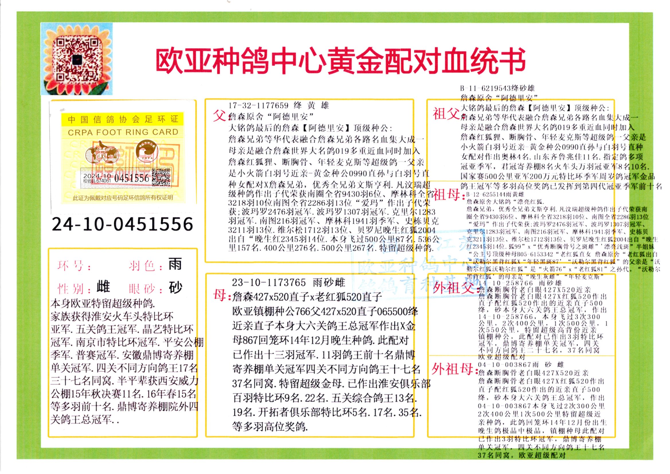 24年秋南京特比環(huán)歐亞榮獲大團體冠軍.小團體冠軍551公里大特比13名.14名.16名.19名.20名.21名.24名.26名.27名.28名.42名.52名.54名.57名.65名.66名.68名.70名.71名.72名.74名.76名.80名.82名.83名.84名.85名.86名.90名.92名.110名.116名.121名.122名.128名.131名.158名.161名.164名.165名.166名.172名.174名.177名.182名.195名.196名.201名.205名.208名.210名.216名.253名.269名.275名.276名.294名.296名.299名,,24年秋云南天南銅都公棚決賽415名.天南銅都小棚決賽409名.云南玉活公棚決賽102名.490名.團體32名上籠二羽進二羽,天南銅都大棚506公里決賽445名。熱烈祝賀河北省巨鹿縣李蘭生老師用歐亞泰山號血系連續(xù)十一年奪冠軍,河北省國家賽冠軍.全國季軍等多次前十名高位,揚州王軍王總用歐亞利奧24年春季獲山東翔宇公棚決賽33名蓋比53名。南京劉正龍劉總用歐亞蓋比獲得24年秋山東濰坊國際公棚決賽42名.精英賽30名.三關鴿王71名.決賽86名.加站賽16名.南京市特比環(huán)A組鴿王9名.B組鴿王5名.6名.C組鴿王5名.精英賽冠軍4名.技能賽A組冠軍4名.5名.秦淮區(qū)特比環(huán)榮獲15名.46名.48名.87名。四川西昌徐亮徐總用歐亞利奧獲得涼山州聚友決賽177名.第二關亞軍雙關鴿王19名.三關鴿王105名.云南豪庭公棚決賽603名。熱烈祝賀24年四川重慶翔園鴿舍用歐亞泰山號榮獲春季400公里冠軍.秋季500公里冠軍,河北王總用詹森X利奧獲得千羽千翔公棚400公里冠軍,廣東蔡楷煥榮獲24年秋愛好者 賽鴿俱樂部三關鴿王季軍.一關420公里99名.二關450公里11名.三關520公里32名.單關季軍.7名.12名,江西李衛(wèi)興榮獲貴州紅楓公棚8名.共翔俱樂部寄養(yǎng)棚四關綜合鴿王30名.一關400公里78名.二關500公里55名.三關520公里37名.四關500公里57名.同父母獲公棚18名.雷鳴獲得武漢黃浦育翔中心冠軍,四川陳文獲得四川明鴻俱樂部300公里夢幻2名.3名.4名.9名.10名.13名.14名.15名.31名.34名.40名.41名.42名.43名.69名.71名.72名.73名.74名.94名.95名.97名.98名.99名.419公里決賽榮獲總冠軍7名.總共歸巢9羽,四川徐亮獲豪庭決賽603名,山西鄭勇獲得山西泰鑫公棚決賽255名詹森紅狐,熱烈祝賀馬總獲得開爾(飛躍隊)決賽9名獲獎金1310000萬元.第一關52名,天津津福資賽180公里96名.獲獎金429543萬元,歐亞支持全國鴿友24年秋多人報喜 祝大家取得更好成績,給歐亞報喜鴿友歐亞決定給每人贈送一羽超級種鴿。歐亞俱樂部特比環(huán)多關鴿王成績:15年秋淮安特比環(huán)黑色星期一全會上籠9700多羽,當天無鴿歸巢,第二天全會歸巢357羽,本舍歸巢158羽.前十名八羽.前一百名歸巢57羽,16年春季獲五關鴿王總冠軍,總亞軍四名.六名.七名.九名.十名.晶藝俱樂部520公里冠亞季軍5名.6名.7名.9名.11名等,火車頭冠軍.季軍6名.8名.9名.10名,16年秋晶藝俱樂部特比環(huán)520公里亞軍.季軍4名.6名.7名.9名,15年春南京白下特比環(huán)冠軍.亞軍.季軍6名.7名.8名.9名.10名.指定鴿A B組獲得冠軍.亞軍.季軍4名.5名.,17年淮安特比環(huán)亞軍.4名.5名.7名.8名.10名.六關鴿王總冠軍.4名.6名.9名.10名,寄養(yǎng)棚宿遷劉總20羽特比環(huán)獲冠軍.季軍.4名.7名.8名.9名等。18年榮獲萬羽特比環(huán)六關鴿王總冠軍.總亞軍.總季軍.6名.8名.十名.單關四羽冠軍.二羽亞軍.四羽季軍.前十名27羽。19年秋萬羽特比環(huán)六關鴿王總亞軍.總季軍.5名.8名等,單關二羽冠軍.三羽亞軍.一羽季軍前十名31羽。20年秋淮安市鴿會四關特比環(huán)大賽風雨無阻鴿王亞軍.鴿王六名,金品俱樂部萬羽特比環(huán)六關鴿王總冠軍,總亞軍.四名.五名.六名.七名.八名.十名.前二百名鴿王35羽,單關冠亞季軍前十名四十多羽,火車頭五關鴿王季軍.六名.八名.前二百名鴿王十七羽。20年春榮獲淮安五區(qū)一市四關鴿王總冠軍.亞軍.四名.八名.九名。21年秋榮獲金品萬羽特比環(huán)大賽六關鴿王總亞軍.總季軍.四名.七名.九名.十名.單關冠亞軍季軍前十名三十多羽;疖囶^協(xié)會鴿王六名.七名.十名.單關前十名十七羽。22年秋榮獲鴿王總冠軍.總亞軍.5名.7名.8名.9名.11名.單關冠亞季軍前十名三十多羽,第一關單關前二百名四十多羽,第二關前二百名三十多羽,第三關前二百名四十多羽,第四關前二百名四十多羽,第五關前一百名53羽。23年秋榮獲鴿王季軍.五名.八名.十名.13名.17名.20名.27名等多羽鴿王.單關前十名二十多羽。公棚.寄養(yǎng)棚部分成績:16年秋寧夏黃河公棚總冠軍電腦戈馬力指定通炮冠軍,17年送八羽參賽獲得鴿王八名進獎四名,支持韓總榮獲八名。支持鴿友榮獲寧夏中衛(wèi)公棚決賽總冠軍.精英賽冠軍,支持18年寧夏黃河公棚決賽冠軍詹森X泰山。安徽鼎博寄養(yǎng)棚院內外四關鴿王總冠軍.鴿王十七名.三十七名同窩,鴿王39名.42名.58名.67名。18年山東公棚預賽冠軍.決賽65名.送八羽進獎五羽.指定獲奔馳汽車一輛。支持鴿友獲得云南藍云公棚冠軍.蓋比X佛卡門。支持鴿友榮獲云南銀集公棚決賽冠軍 詹森427X520血系 速度賽6700羽冠軍。17年榮獲金馬俱樂部寄養(yǎng)棚四關鴿王總冠軍.季軍.六名.八名.第一關冠軍.亞軍.季軍四名.七名.十一名.金牌教練獎。支持鴿友18年北京費翔公棚預賽九名電腦X桑杰士,支持鴿友榮獲陜西威力公棚決賽11名.內蒙古臨河寄養(yǎng)棚四關鴿王六名.詹森配泰山,支持河北王總用歐亞詹森427配胡本喜獲20年秋開爾青年棚季軍。云南東榮公棚16年預賽冠軍.決賽77名.17年決賽12名.詹森紅狐X泰山,17年平安公棚決賽4名