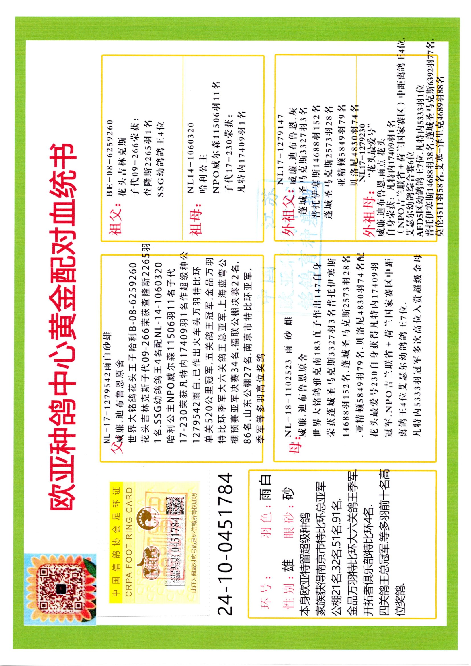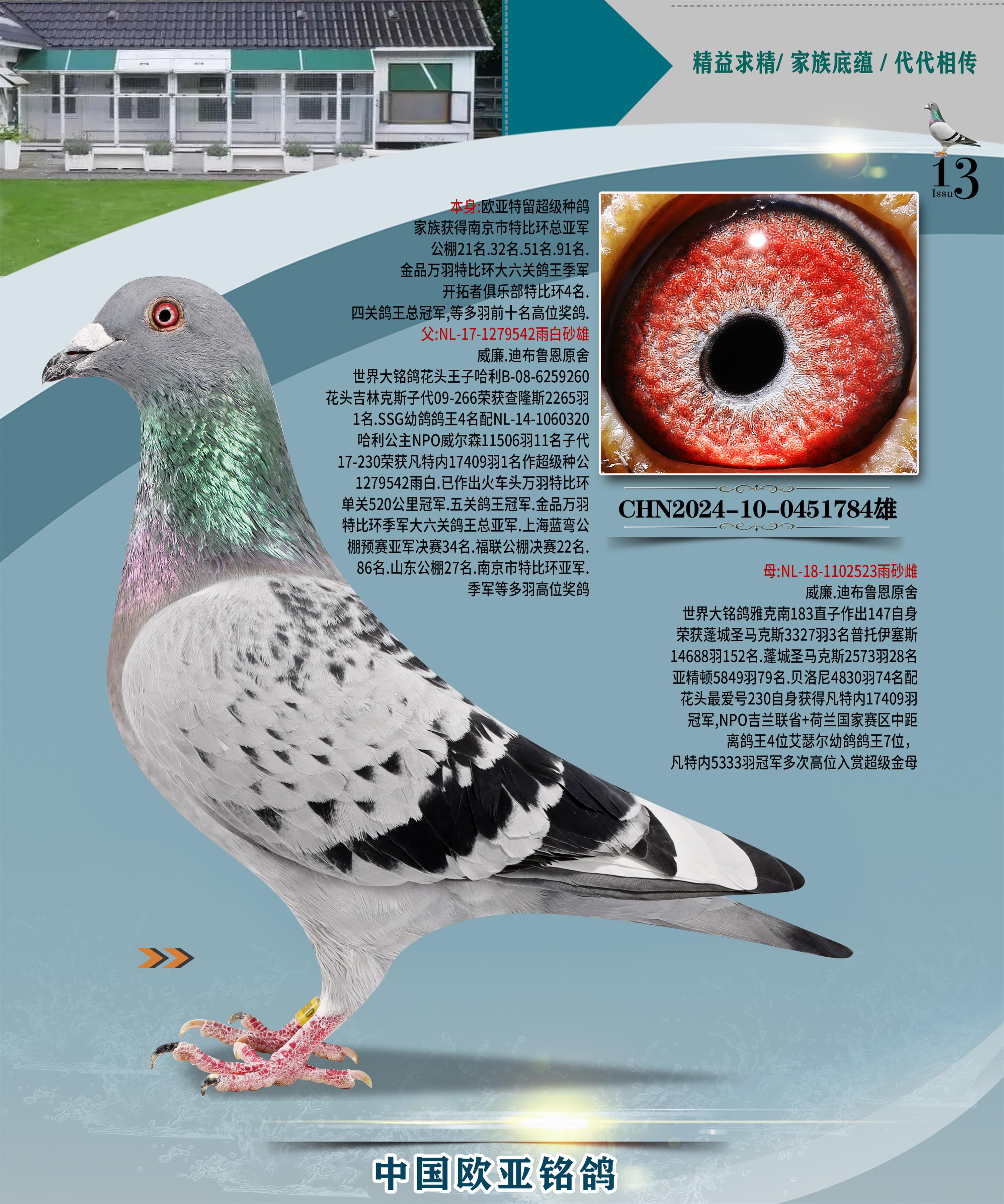 24年秋南京特比環(huán)歐亞榮獲大團(tuán)體冠軍.小團(tuán)體冠軍551公里大特比13名.14名.16名.19名.20名.21名.24名.26名.27名.28名.42名.52名.54名.57名.65名.66名.68名.70名.71名.72名.74名.76名.80名.82名.83名.84名.85名.86名.90名.92名.110名.116名.121名.122名.128名.131名.158名.161名.164名.165名.166名.172名.174名.177名.182名.195名.196名.201名.205名.208名.210名.216名.253名.269名.275名.276名.294名.296名.299名,,24年秋云南天南銅都公棚決賽415名.天南銅都小棚決賽409名.云南玉活公棚決賽102名.490名.團(tuán)體32名上籠二羽進(jìn)二羽,天南銅都大棚506公里決賽445名。熱烈祝賀河北省巨鹿縣李蘭生老師用歐亞泰山號(hào)血系連續(xù)十一年奪冠軍,河北省國(guó)家賽冠軍.全國(guó)季軍等多次前十名高位,揚(yáng)州王軍王總用歐亞利奧24年春季獲山東翔宇公棚決賽33名蓋比53名。南京劉正龍劉總用歐亞蓋比獲得24年秋山東濰坊國(guó)際公棚決賽42名.精英賽30名.三關(guān)鴿王71名.決賽86名.加站賽16名.南京市特比環(huán)A組鴿王9名.B組鴿王5名.6名.C組鴿王5名.精英賽冠軍4名.技能賽A組冠軍4名.5名.秦淮區(qū)特比環(huán)榮獲15名.46名.48名.87名。四川西昌徐亮徐總用歐亞利奧獲得涼山州聚友決賽177名.第二關(guān)亞軍雙關(guān)鴿王19名.三關(guān)鴿王105名.云南豪庭公棚決賽603名。熱烈祝賀24年四川重慶翔園鴿舍用歐亞泰山號(hào)榮獲春季400公里冠軍.秋季500公里冠軍,河北王總用詹森X利奧獲得千羽千翔公棚400公里冠軍,廣東蔡楷煥榮獲24年秋愛好者 賽鴿俱樂部三關(guān)鴿王季軍.一關(guān)420公里99名.二關(guān)450公里11名.三關(guān)520公里32名.單關(guān)季軍.7名.12名,江西李衛(wèi)興榮獲貴州紅楓公棚8名.共翔俱樂部寄養(yǎng)棚四關(guān)綜合鴿王30名.一關(guān)400公里78名.二關(guān)500公里55名.三關(guān)520公里37名.四關(guān)500公里57名.同父母獲公棚18名.雷鳴獲得武漢黃浦育翔中心冠軍,四川陳文獲得四川明鴻俱樂部300公里夢(mèng)幻2名.3名.4名.9名.10名.13名.14名.15名.31名.34名.40名.41名.42名.43名.69名.71名.72名.73名.74名.94名.95名.97名.98名.99名.419公里決賽榮獲總冠軍7名.總共歸巢9羽,四川徐亮獲豪庭決賽603名,山西鄭勇獲得山西泰鑫公棚決賽255名詹森紅狐,熱烈祝賀馬總獲得開爾(飛躍隊(duì))決賽9名獲獎(jiǎng)金1310000萬元.第一關(guān)52名,天津津福資賽180公里96名.獲獎(jiǎng)金429543萬元,歐亞支持全國(guó)鴿友24年秋多人報(bào)喜 祝大家取得更好成績(jī),給歐亞報(bào)喜鴿友歐亞決定給每人贈(zèng)送一羽超級(jí)種鴿。歐亞俱樂部特比環(huán)多關(guān)鴿王成績(jī):15年秋淮安特比環(huán)黑色星期一全會(huì)上籠9700多羽,當(dāng)天無鴿歸巢,第二天全會(huì)歸巢357羽,本舍歸巢158羽.前十名八羽.前一百名歸巢57羽,16年春季獲五關(guān)鴿王總冠軍,總亞軍四名.六名.七名.九名.十名.晶藝俱樂部520公里冠亞季軍5名.6名.7名.9名.11名等,火車頭冠軍.季軍6名.8名.9名.10名,16年秋晶藝俱樂部特比環(huán)520公里亞軍.季軍4名.6名.7名.9名,15年春南京白下特比環(huán)冠軍.亞軍.季軍6名.7名.8名.9名.10名.指定鴿A B組獲得冠軍.亞軍.季軍4名.5名.,17年淮安特比環(huán)亞軍.4名.5名.7名.8名.10名.六關(guān)鴿王總冠軍.4名.6名.9名.10名,寄養(yǎng)棚宿遷劉總20羽特比環(huán)獲冠軍.季軍.4名.7名.8名.9名等。18年榮獲萬羽特比環(huán)六關(guān)鴿王總冠軍.總亞軍.總季軍.6名.8名.十名.單關(guān)四羽冠軍.二羽亞軍.四羽季軍.前十名27羽。19年秋萬羽特比環(huán)六關(guān)鴿王總亞軍.總季軍.5名.8名等,單關(guān)二羽冠軍.三羽亞軍.一羽季軍前十名31羽。20年秋淮安市鴿會(huì)四關(guān)特比環(huán)大賽風(fēng)雨無阻鴿王亞軍.鴿王六名,金品俱樂部萬羽特比環(huán)六關(guān)鴿王總冠軍,總亞軍.四名.五名.六名.七名.八名.十名.前二百名鴿王35羽,單關(guān)冠亞季軍前十名四十多羽,火車頭五關(guān)鴿王季軍.六名.八名.前二百名鴿王十七羽。20年春榮獲淮安五區(qū)一市四關(guān)鴿王總冠軍.亞軍.四名.八名.九名。21年秋榮獲金品萬羽特比環(huán)大賽六關(guān)鴿王總亞軍.總季軍.四名.七名.九名.十名.單關(guān)冠亞軍季軍前十名三十多羽;疖囶^協(xié)會(huì)鴿王六名.七名.十名.單關(guān)前十名十七羽。22年秋榮獲鴿王總冠軍.總亞軍.5名.7名.8名.9名.11名.單關(guān)冠亞季軍前十名三十多羽,第一關(guān)單關(guān)前二百名四十多羽,第二關(guān)前二百名三十多羽,第三關(guān)前二百名四十多羽,第四關(guān)前二百名四十多羽,第五關(guān)前一百名53羽。23年秋榮獲鴿王季軍.五名.八名.十名.13名.17名.20名.27名等多羽鴿王.單關(guān)前十名二十多羽。公棚.寄養(yǎng)棚部分成績(jī):16年秋寧夏黃河公棚總冠軍電腦戈馬力指定通炮冠軍,17年送八羽參賽獲得鴿王八名進(jìn)獎(jiǎng)四名,支持韓總榮獲八名。支持鴿友榮獲寧夏中衛(wèi)公棚決賽總冠軍.精英賽冠軍,支持18年寧夏黃河公棚決賽冠軍詹森X泰山。安徽鼎博寄養(yǎng)棚院內(nèi)外四關(guān)鴿王總冠軍.鴿王十七名.三十七名同窩,鴿王39名.42名.58名.67名。18年山東公棚預(yù)賽冠軍.決賽65名.送八羽進(jìn)獎(jiǎng)五羽.指定獲奔馳汽車一輛。支持鴿友獲得云南藍(lán)云公棚冠軍.蓋比X佛卡門。支持鴿友榮獲云南銀集公棚決賽冠軍 詹森427X520血系 速度賽6700羽冠軍。17年榮獲金馬俱樂部寄養(y
