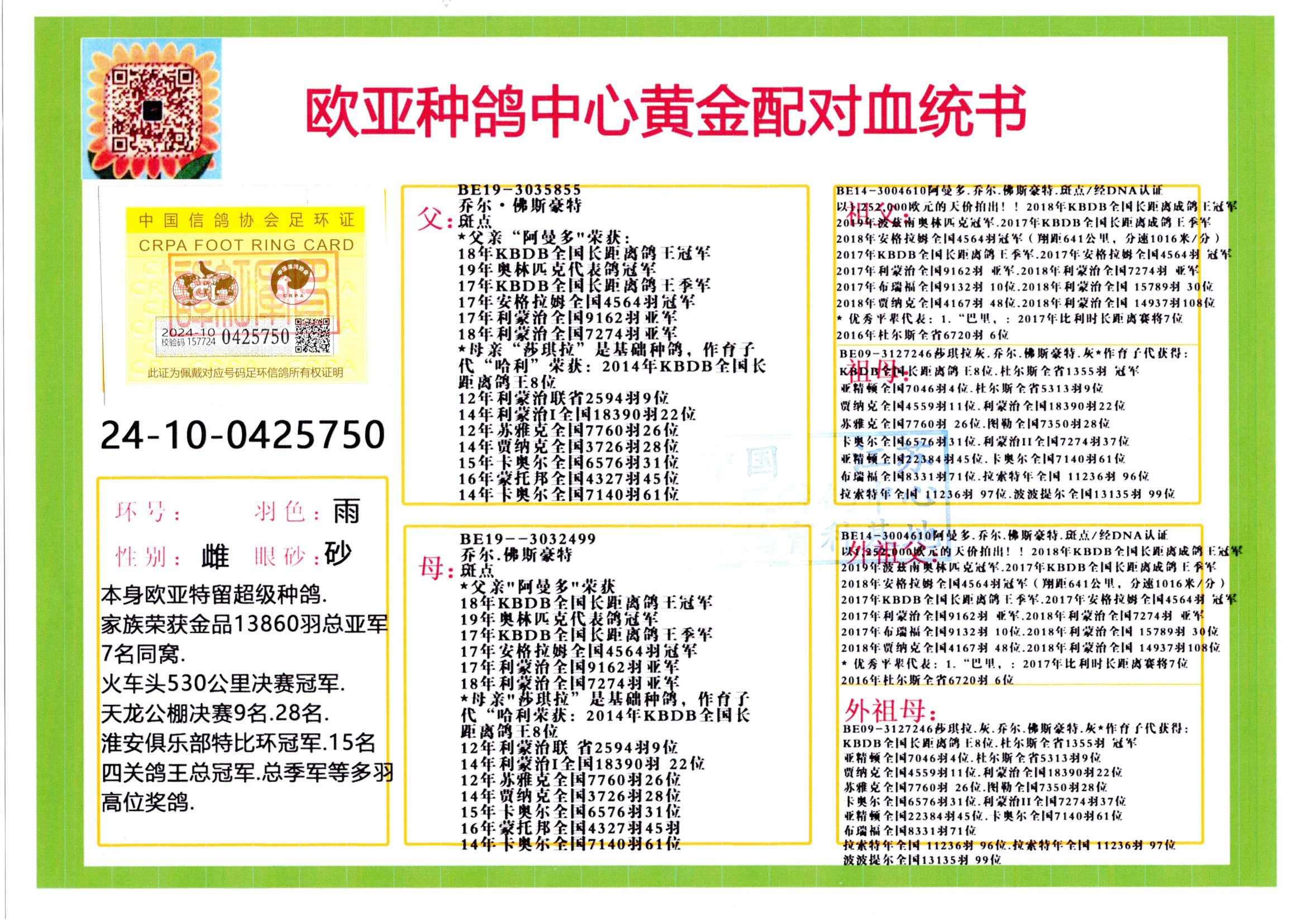 24年秋南京特比環(huán)歐亞榮獲大團體冠軍.小團體冠軍551公里大特比13名.14名.16名.19名.20名.21名.24名.26名.27名.28名.42名.52名.54名.57名.65名.66名.68名.70名.71名.72名.74名.76名.80名.82名.83名.84名.85名.86名.90名.92名.110名.116名.121名.122名.128名.131名.158名.161名.164名.165名.166名.172名.174名.177名.182名.195名.196名.201名.205名.208名.210名.216名.253名.269名.275名.276名.294名.296名.299名,,24年秋云南天南銅都公棚決賽415名.天南銅都小棚決賽409名.云南玉活公棚決賽102名.490名.團體32名上籠二羽進二羽,天南銅都大棚506公里決賽445名。熱烈祝賀河北省巨鹿縣李蘭生老師用歐亞泰山號血系連續(xù)十一年奪冠軍,河北省國家賽冠軍.全國季軍等多次前十名高位,揚州王軍王總用歐亞利奧24年春季獲山東翔宇公棚決賽33名蓋比53名。南京劉正龍劉總用歐亞蓋比獲得24年秋山東濰坊國際公棚決賽42名.精英賽30名.三關鴿王71名.決賽86名.加站賽16名.南京市特比環(huán)A組鴿王9名.B組鴿王5名.6名.C組鴿王5名.精英賽冠軍4名.技能賽A組冠軍4名.5名.秦淮區(qū)特比環(huán)榮獲15名.46名.48名.87名。四川西昌徐亮徐總用歐亞利奧獲得涼山州聚友決賽177名.第二關亞軍雙關鴿王19名.三關鴿王105名.云南豪庭公棚決賽603名。熱烈祝賀24年四川重慶翔園鴿舍用歐亞泰山號榮獲春季400公里冠軍.秋季500公里冠軍,河北王總用詹森X利奧獲得千羽千翔公棚400公里冠軍,廣東蔡楷煥榮獲24年秋愛好者 賽鴿俱樂部三關鴿王季軍.一關420公里99名.二關450公里11名.三關520公里32名.單關季軍.7名.12名,江西李衛(wèi)興榮獲貴州紅楓公棚8名.共翔俱樂部寄養(yǎng)棚四關綜合鴿王30名.一關400公里78名.二關500公里55名.三關520公里37名.四關500公里57名.同父母獲公棚18名.雷鳴獲得武漢黃浦育翔中心冠軍,四川陳文獲得四川明鴻俱樂部300公里夢幻2名.3名.4名.9名.10名.13名.14名.15名.31名.34名.40名.41名.42名.43名.69名.71名.72名.73名.74名.94名.95名.97名.98名.99名.419公里決賽榮獲總冠軍7名.總共歸巢9羽,四川徐亮獲豪庭決賽603名,山西鄭勇獲得山西泰鑫公棚決賽255名詹森紅狐,熱烈祝賀馬總獲得開爾(飛躍隊)決賽9名獲獎金1310000萬元.第一關52名,天津津福資賽180公里96名.獲獎金429543萬元,歐亞支持全國鴿友24年秋多人報喜 祝大家取得更好成績,給歐亞報喜鴿友歐亞決定給每人贈送一羽超級種鴿。歐亞俱樂部特比環(huán)多關鴿王成績:15年秋淮安特比環(huán)黑色星期一全會上籠9700多羽,當天無鴿歸巢,第二天全會歸巢357羽,本舍歸巢158羽.前十名八羽.前一百名歸巢57羽,16年春季獲五關鴿王總冠軍,總亞軍四名.六名.七名.九名.十名.晶藝俱樂部520公里冠亞季軍5名.6名.7名.9名.11名等,火車頭冠軍.季軍6名.8名.9名.10名,16年秋晶藝俱樂部特比環(huán)520公里亞軍.季軍4名.6名.7名.9名,15年春南京白下特比環(huán)冠軍.亞軍.季軍6名.7名.8名.9名.10名.指定鴿A B組獲得冠軍.亞軍.季軍4名.5名.,17年淮安特比環(huán)亞軍.4名.5名.7名.8名.10名.六關鴿王總冠軍.4名.6名.9名.10名,寄養(yǎng)棚宿遷劉總20羽特比環(huán)獲冠軍.季軍.4名.7名.8名.9名等。18年榮獲萬羽特比環(huán)六關鴿王總冠軍.總亞軍.總季軍.6名.8名.十名.單關四羽冠軍.二羽亞軍.四羽季軍.前十名27羽。19年秋萬羽特比環(huán)六關鴿王總亞軍.總季軍.5名.8名等,單關二羽冠軍.三羽亞軍.一羽季軍前十名31羽。20年秋淮安市鴿會四關特比環(huán)大賽風雨無阻鴿王亞軍.鴿王六名,金品俱樂部萬羽特比環(huán)六關鴿王總冠軍,總亞軍.四名.五名.六名.七名.八名.十名.前二百名鴿王35羽,單關冠亞季軍前十名四十多羽,火車頭五關鴿王季軍.六名.八名.前二百名鴿王十七羽。20年春榮獲淮安五區(qū)一市四關鴿王總冠軍.亞軍.四名.八名.九名。21年秋榮獲金品萬羽特比環(huán)大賽六關鴿王總亞軍.總季軍.四名.七名.九名.十名.單關冠亞軍季軍前十名三十多羽;疖囶^協會鴿王六名.七名.十名.單關前十名十七羽。22年秋榮獲鴿王總冠軍.總亞軍.5名.7名.8名.9名.11名.單關冠亞季軍前十名三十多羽,第一關單關前二百名四十多羽,第二關前二百名三十多羽,第三關前二百名四十多羽,第四關前二百名四十多羽,第五關前一百名53羽。23年秋榮獲鴿王季軍.五名.八名.十名.13名.17名.20名.27名等多羽鴿王.單關前十名二十多羽。公棚.寄養(yǎng)棚部分成績:16年秋寧夏黃河公棚總冠軍電腦戈馬力指定通炮冠軍,17年送八羽參賽獲得鴿王八名進獎四名,支持韓總榮獲八名。支持鴿友榮獲寧夏中衛(wèi)公棚決賽總冠軍.精英賽冠軍,支持18年寧夏黃河公棚決賽冠軍詹森X泰山。安徽鼎博寄養(yǎng)棚院內外四關鴿王總冠軍.鴿王十七名.三十七名同窩,鴿王39名.42名.58名.67名。18年山東公棚預賽冠軍.決賽65名.送八羽進獎五羽.指定獲奔馳汽車一輛。支持鴿友獲得云南藍云公棚冠軍.蓋比X佛卡門。支持鴿友榮獲云南銀集公棚決賽冠軍 詹森427X520血系 速度賽6700羽冠軍。17年榮獲金馬俱樂部寄養(yǎng)棚四關鴿王總冠軍.季軍.六名.八名.第一關冠軍.亞軍.季軍四名.七名.十一名.金牌教練獎。支持鴿友18年北京費翔公棚預賽九名電腦X桑杰士,支持鴿友榮獲陜西威力公棚決賽11名.內蒙古臨河寄養(yǎng)棚四關鴿王六名.詹森配泰山,支持河北王總用歐亞詹森427配胡本喜獲20年秋開爾青年棚季軍。云南東榮公棚16年預賽冠軍.決賽77名.17年決賽12名.詹森紅狐X泰山,17年平安公棚決賽4名 詹