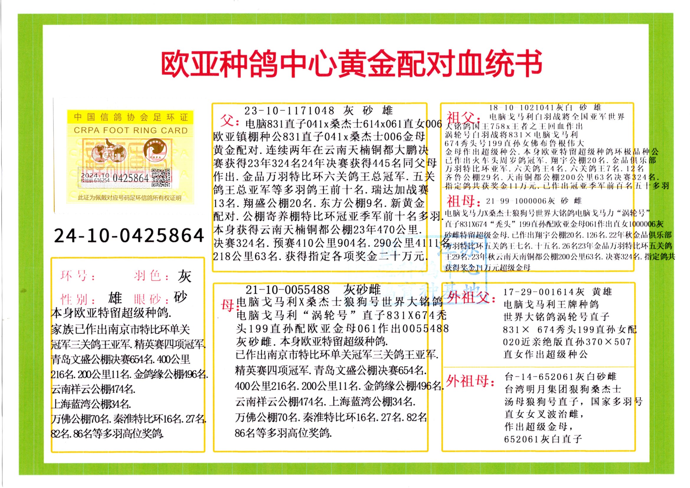 24年秋南京特比環(huán)歐亞榮獲大團(tuán)體冠軍.小團(tuán)體冠軍551公里大特比13名.14名.16名.19名.20名.21名.24名.26名.27名.28名.42名.52名.54名.57名.65名.66名.68名.70名.71名.72名.74名.76名.80名.82名.83名.84名.85名.86名.90名.92名.110名.116名.121名.122名.128名.131名.158名.161名.164名.165名.166名.172名.174名.177名.182名.195名.196名.201名.205名.208名.210名.216名.253名.269名.275名.276名.294名.296名.299名,,24年秋云南天南銅都公棚決賽415名.天南銅都小棚決賽409名.云南玉活公棚決賽102名.490名.團(tuán)體32名上籠二羽進(jìn)二羽,天南銅都大棚506公里決賽445名。熱烈祝賀河北省巨鹿縣李蘭生老師用歐亞泰山號(hào)血系連續(xù)十一年奪冠軍,河北省國(guó)家賽冠軍.全國(guó)季軍等多次前十名高位,揚(yáng)州王軍王總用歐亞利奧24年春季獲山東翔宇公棚決賽33名蓋比53名。南京劉正龍劉總用歐亞蓋比獲得24年秋山東濰坊國(guó)際公棚決賽42名.精英賽30名.三關(guān)鴿王71名.決賽86名.加站賽16名.南京市特比環(huán)A組鴿王9名.B組鴿王5名.6名.C組鴿王5名.精英賽冠軍4名.技能賽A組冠軍4名.5名.秦淮區(qū)特比環(huán)榮獲15名.46名.48名.87名。四川西昌徐亮徐總用歐亞利奧獲得涼山州聚友決賽177名.第二關(guān)亞軍雙關(guān)鴿王19名.三關(guān)鴿王105名.云南豪庭公棚決賽603名。熱烈祝賀24年四川重慶翔園鴿舍用歐亞泰山號(hào)榮獲春季400公里冠軍.秋季500公里冠軍,河北王總用詹森X利奧獲得千羽千翔公棚400公里冠軍,廣東蔡楷煥榮獲24年秋愛好者 賽鴿俱樂(lè)部三關(guān)鴿王季軍.一關(guān)420公里99名.二關(guān)450公里11名.三關(guān)520公里32名.單關(guān)季軍.7名.12名,江西李衛(wèi)興榮獲貴州紅楓公棚8名.共翔俱樂(lè)部寄養(yǎng)棚四關(guān)綜合鴿王30名.一關(guān)400公里78名.二關(guān)500公里55名.三關(guān)520公里37名.四關(guān)500公里57名.同父母獲公棚18名.雷鳴獲得武漢黃浦育翔中心冠軍,四川陳文獲得四川明鴻俱樂(lè)部300公里夢(mèng)幻2名.3名.4名.9名.10名.13名.14名.15名.31名.34名.40名.41名.42名.43名.69名.71名.72名.73名.74名.94名.95名.97名.98名.99名.419公里決賽榮獲總冠軍7名.總共歸巢9羽,四川徐亮獲豪庭決賽603名,山西鄭勇獲得山西泰鑫公棚決賽255名詹森紅狐,熱烈祝賀馬總獲得開爾(飛躍隊(duì))決賽9名獲獎(jiǎng)金1310000萬(wàn)元.第一關(guān)52名,天津津福資賽180公里96名.獲獎(jiǎng)金429543萬(wàn)元,歐亞支持全國(guó)鴿友24年秋多人報(bào)喜 祝大家取得更好成績(jī),給歐亞報(bào)喜鴿友歐亞決定給每人贈(zèng)送一羽超級(jí)種鴿。歐亞俱樂(lè)部特比環(huán)多關(guān)鴿王成績(jī):15年秋淮安特比環(huán)黑色星期一全會(huì)上籠9700多羽,當(dāng)天無(wú)鴿歸巢,第二天全會(huì)歸巢357羽,本舍歸巢158羽.前十名八羽.前一百名歸巢57羽,16年春季獲五關(guān)鴿王總冠軍,總亞軍四名.六名.七名.九名.十名.晶藝俱樂(lè)部520公里冠亞季軍5名.6名.7名.9名.11名等,火車頭冠軍.季軍6名.8名.9名.10名,16年秋晶藝俱樂(lè)部特比環(huán)520公里亞軍.季軍4名.6名.7名.9名,15年春南京白下特比環(huán)冠軍.亞軍.季軍6名.7名.8名.9名.10名.指定鴿A B組獲得冠軍.亞軍.季軍4名.5名.,17年淮安特比環(huán)亞軍.4名.5名.7名.8名.10名.六關(guān)鴿王總冠軍.4名.6名.9名.10名,寄養(yǎng)棚宿遷劉總20羽特比環(huán)獲冠軍.季軍.4名.7名.8名.9名等。18年榮獲萬(wàn)羽特比環(huán)六關(guān)鴿王總冠軍.總亞軍.總季軍.6名.8名.十名.單關(guān)四羽冠軍.二羽亞軍.四羽季軍.前十名27羽。19年秋萬(wàn)羽特比環(huán)六關(guān)鴿王總亞軍.總季軍.5名.8名等,單關(guān)二羽冠軍.三羽亞軍.一羽季軍前十名31羽。20年秋淮安市鴿會(huì)四關(guān)特比環(huán)大賽風(fēng)雨無(wú)阻鴿王亞軍.鴿王六名,金品俱樂(lè)部萬(wàn)羽特比環(huán)六關(guān)鴿王總冠軍,總亞軍.四名.五名.六名.七名.八名.十名.前二百名鴿王35羽,單關(guān)冠亞季軍前十名四十多羽,火車頭五關(guān)鴿王季軍.六名.八名.前二百名鴿王十七羽。20年春榮獲淮安五區(qū)一市四關(guān)鴿王總冠軍.亞軍.四名.八名.九名。21年秋榮獲金品萬(wàn)羽特比環(huán)大賽六關(guān)鴿王總亞軍.總季軍.四名.七名.九名.十名.單關(guān)冠亞軍季軍前十名三十多羽;疖囶^協(xié)會(huì)鴿王六名.七名.十名.單關(guān)前十名十七羽。22年秋榮獲鴿王總冠軍.總亞軍.5名.7名.8名.9名.11名.單關(guān)冠亞季軍前十名三十多羽,第一關(guān)單關(guān)前二百名四十多羽,第二關(guān)前二百名三十多羽,第三關(guān)前二百名四十多羽,第四關(guān)前二百名四十多羽,第五關(guān)前一百名53羽。23年秋榮獲鴿王季軍.五名.八名.十名.13名.17名.20名.27名等多羽鴿王.單關(guān)前十名二十多羽。公棚.寄養(yǎng)棚部分成績(jī):16年秋寧夏黃河公棚總冠軍電腦戈馬力指定通炮冠軍,17年送八羽參賽獲得鴿王八名進(jìn)獎(jiǎng)四名,支持韓總榮獲八名。支持鴿友榮獲寧夏中衛(wèi)公棚決賽總冠軍.精英賽冠軍,支持18年寧夏黃河公棚決賽冠軍詹森X泰山。安徽鼎博寄養(yǎng)棚院內(nèi)外四關(guān)鴿王總冠軍.鴿王十七名.三十七名同窩,鴿王39名.42名.58名.67名。18年山東公棚預(yù)賽冠軍.決賽65名.送八羽進(jìn)獎(jiǎng)五羽.指定獲奔馳汽車一輛。支持鴿友獲得云南藍(lán)云公棚冠軍.蓋比X佛卡門。支持鴿友榮獲云南銀集公棚決賽冠軍
