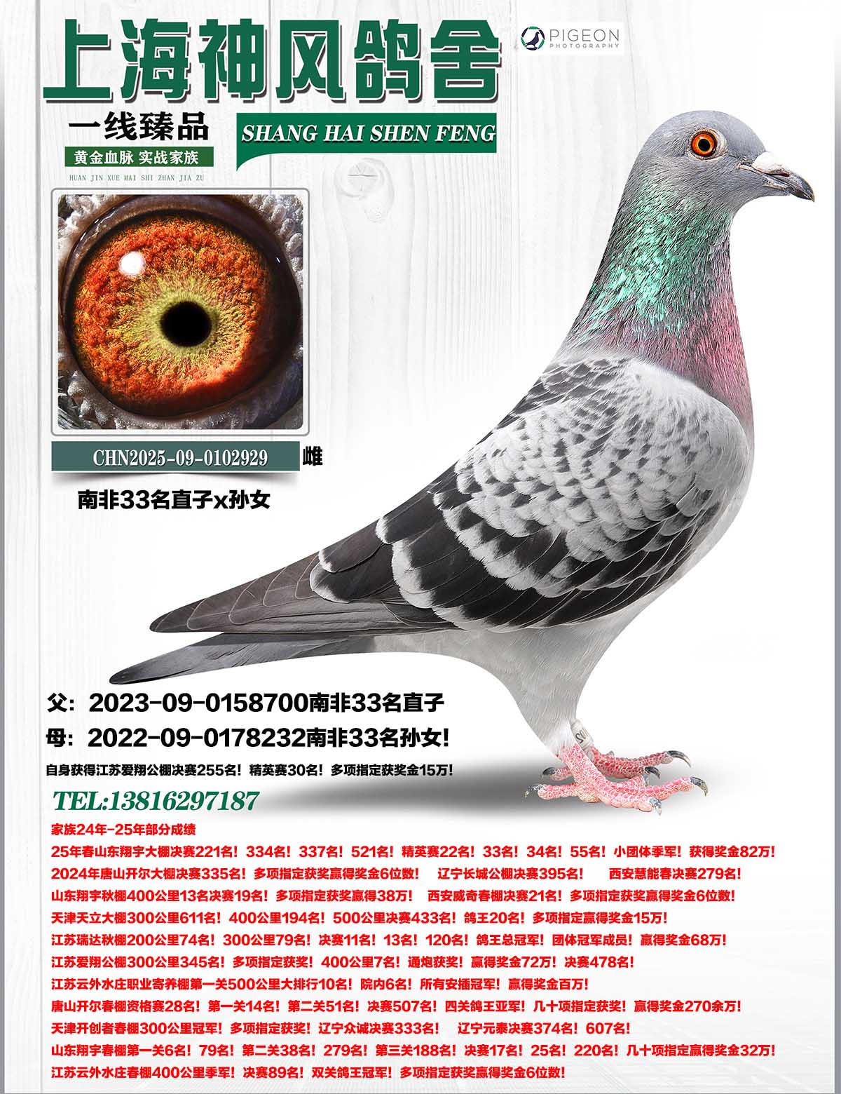曾祖母本舍胡本頭號(hào)中鴿“鴿王締造者”直女!本身和全平輩后代西安威力。寧夏黃河。安徽萬(wàn)佛。江蘇愛翔。浙江先鋒。上海君冠。等等眾多公棚都有高位獲獎(jiǎng)!