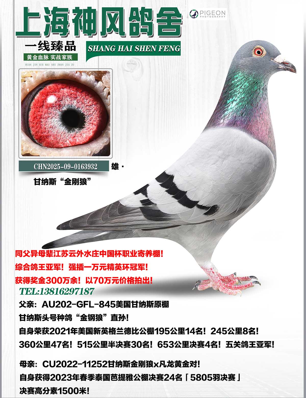 同父異母輩江蘇云外水莊中國(guó)杯職業(yè)寄養(yǎng)棚!首關(guān)32名!二關(guān)135名!兩關(guān)綜合20名!三關(guān)140名! 四關(guān)71名!五關(guān)13名!綜合鴿王亞軍!強(qiáng)插一萬(wàn)元精英環(huán)冠軍!獲得獎(jiǎng)金300萬(wàn)余!以70萬(wàn)元價(jià)格拍出!北京壹號(hào)鴿舍收藏!