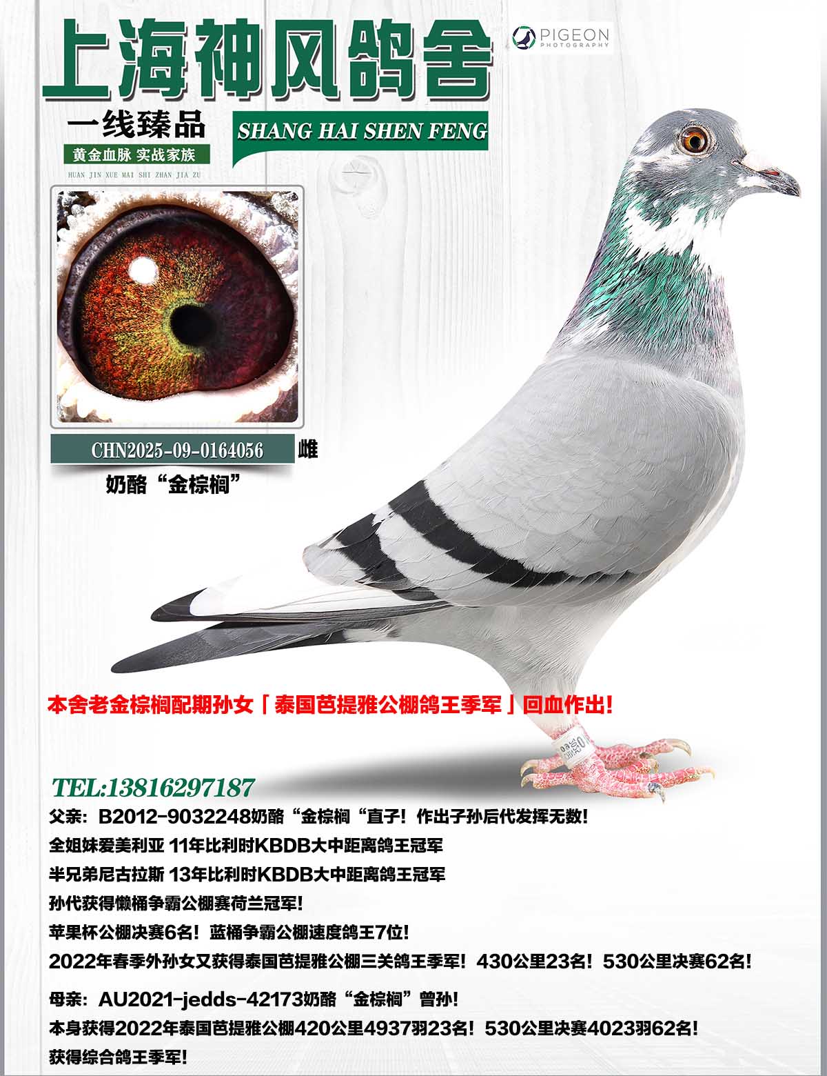 自身獲得蘋果杯公棚賽鴿王冠軍!作出子代獲得蘋果杯公棚決賽8名!綜合7名!尼亞拉加公棚賽鴿王4位!2022年泰國(guó)芭提雅公棚420公里4937羽23名!530公里決賽4023羽62名!獲得綜合鴿王季軍!