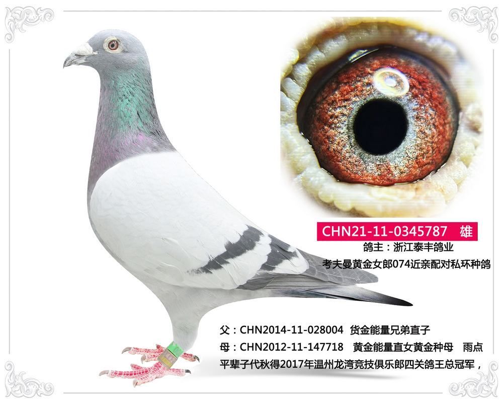 父:CHN2014-11-028004 貨金能量兄弟直子 平輩子代秋得2017年溫州龍灣競技俱樂郎四關(guān)鴿王總冠軍,2020年獲得唐山大月爾520公里決賽89名,同窩2020年獲獎(jiǎng)唐山小開爾桃戰(zhàn)賽443名