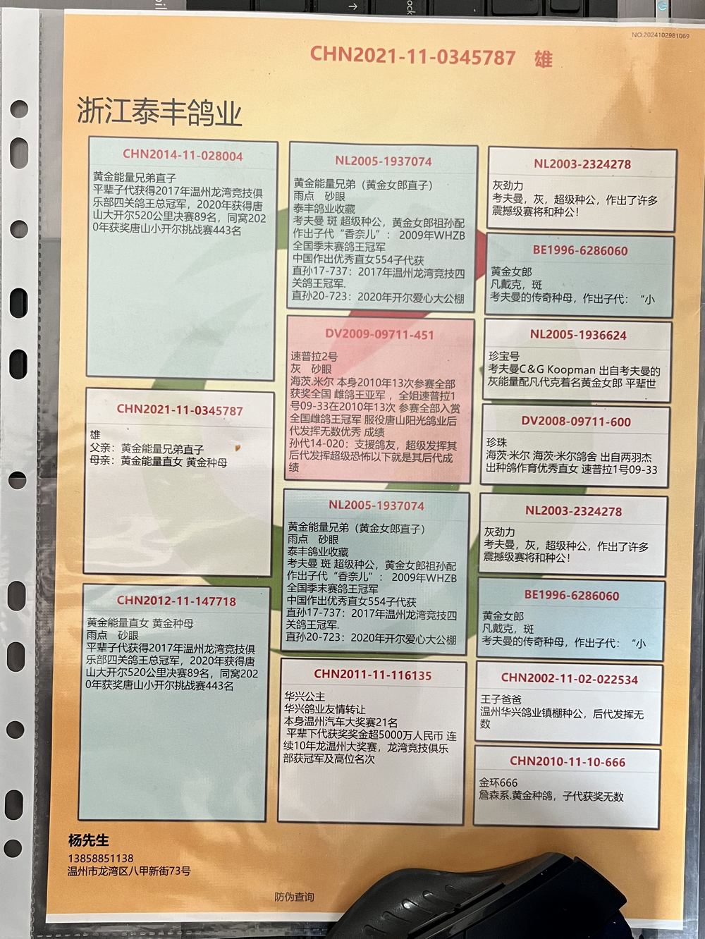 母:CHN2012-11-147718 黃金能量直女黃金種母 雨點(diǎn) 砂眼 平輩子代秋得2017年溫州龍灣競技俱樂郎四關(guān)鴿王總冠軍,2020年獲得唐山大月爾520公里決賽89名,同窩2020年獲獎(jiǎng)唐山小開爾桃戰(zhàn)賽443名;