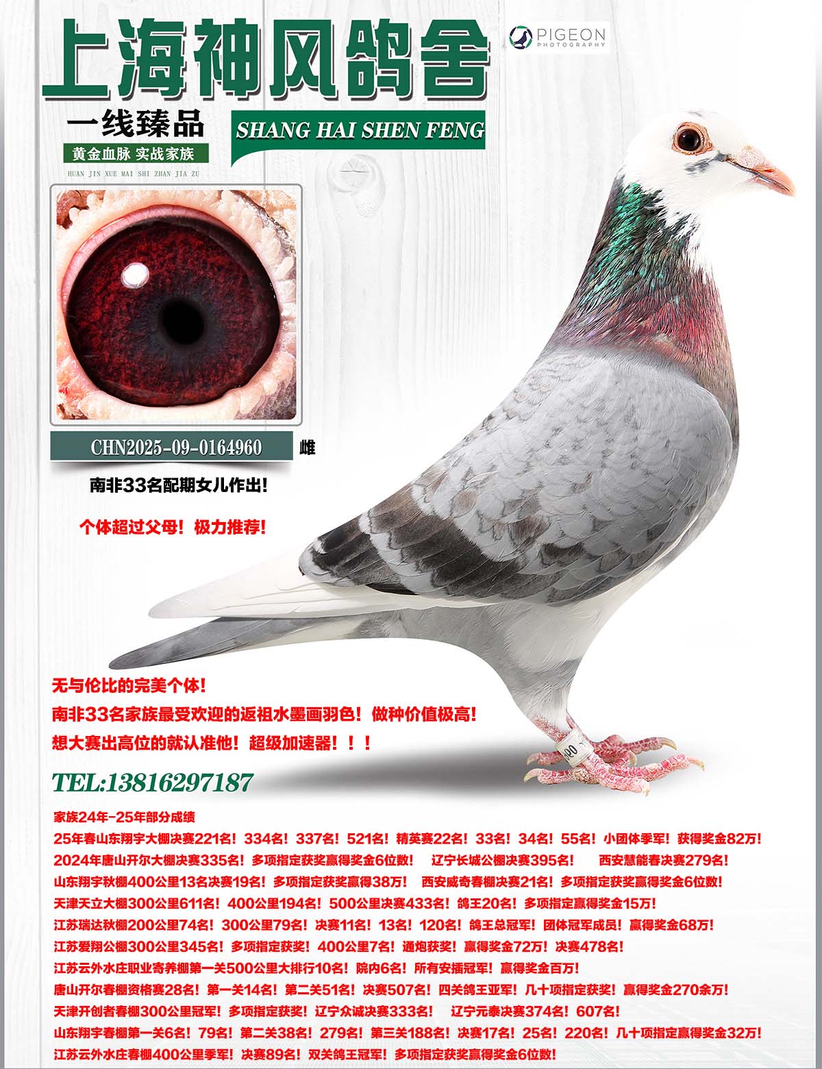 母親:AU2017-T-33本舍胡本頭號中鴿“鴿王締造者”直女!本身和全平輩后代西安威力。寧夏黃河。安徽萬佛。江蘇愛翔。浙江先鋒。上海君冠。等等眾多公棚都有高位獲獎!