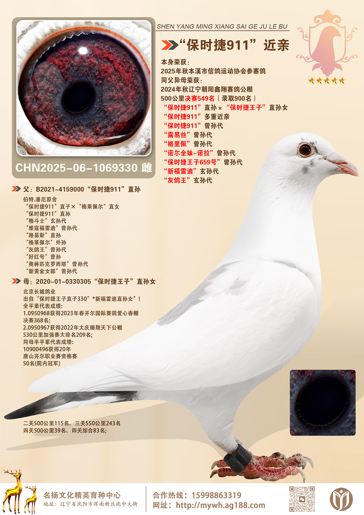 同父半弟(妹)代表成績A001217獲得2021年北京百鴿園中國杯四關(guān)綜合鴿王188名