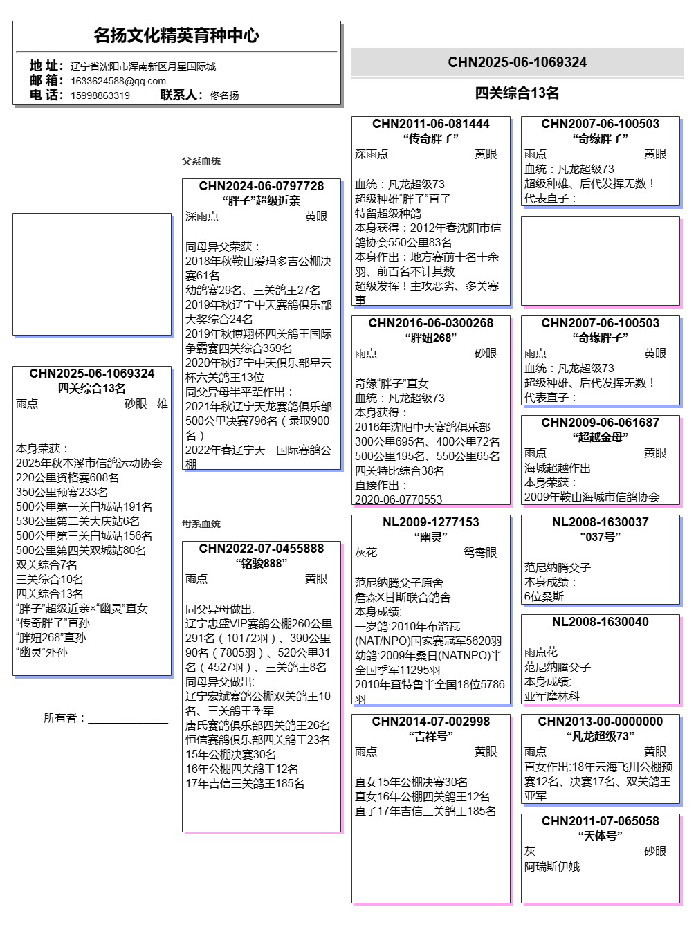 遼寧中天俱樂(lè)部(星云杯)六關(guān)鴿王13位