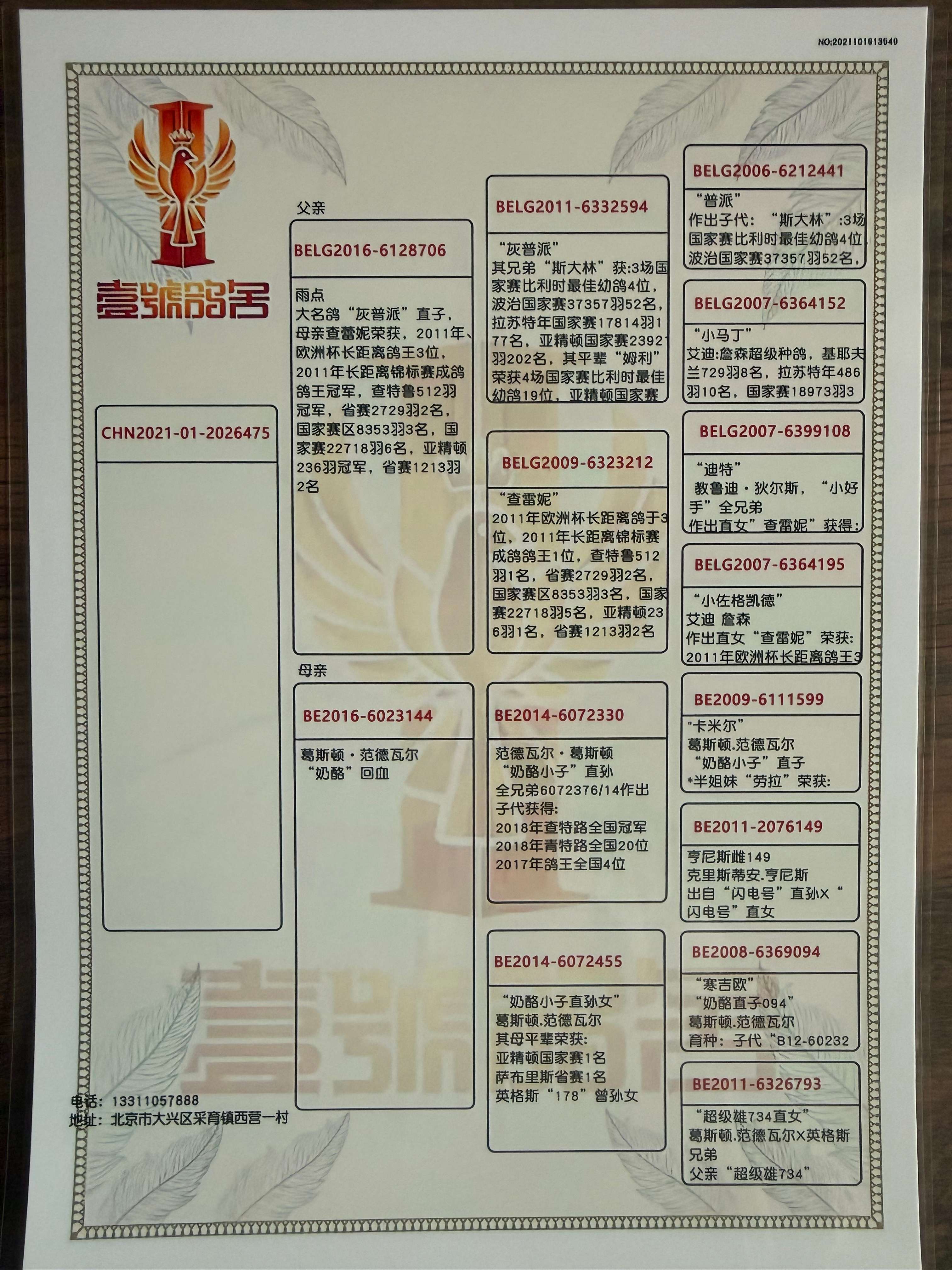 1615547 血統(tǒng):利奧.赫爾曼斯 本身成績?nèi)P(guān)鴿王冠軍 五關(guān)鴿王5名 ¥200元 1次