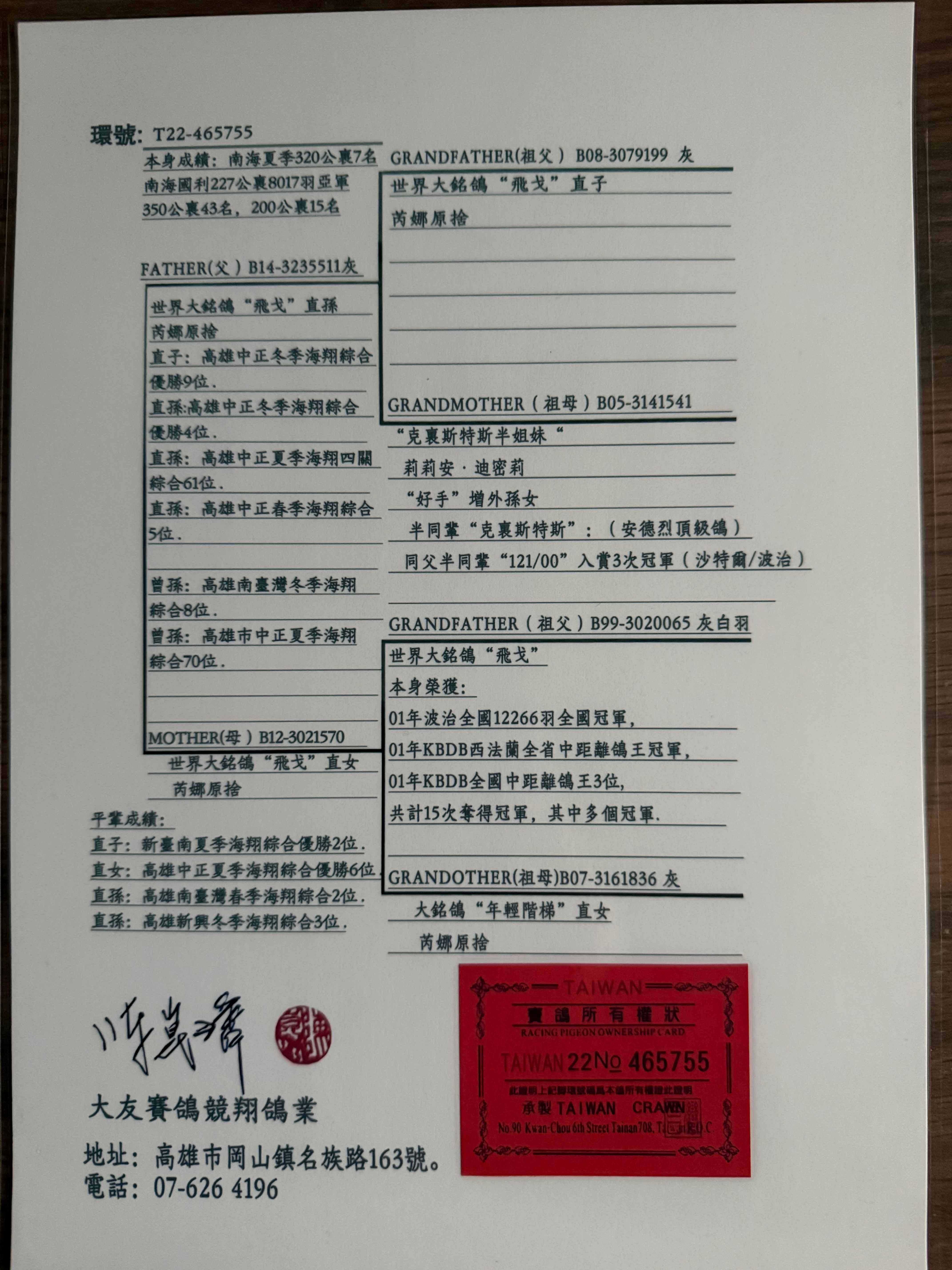1615596 臺灣飛事速翔”詹森血統“本身成績四關亞軍 ¥0元 0次