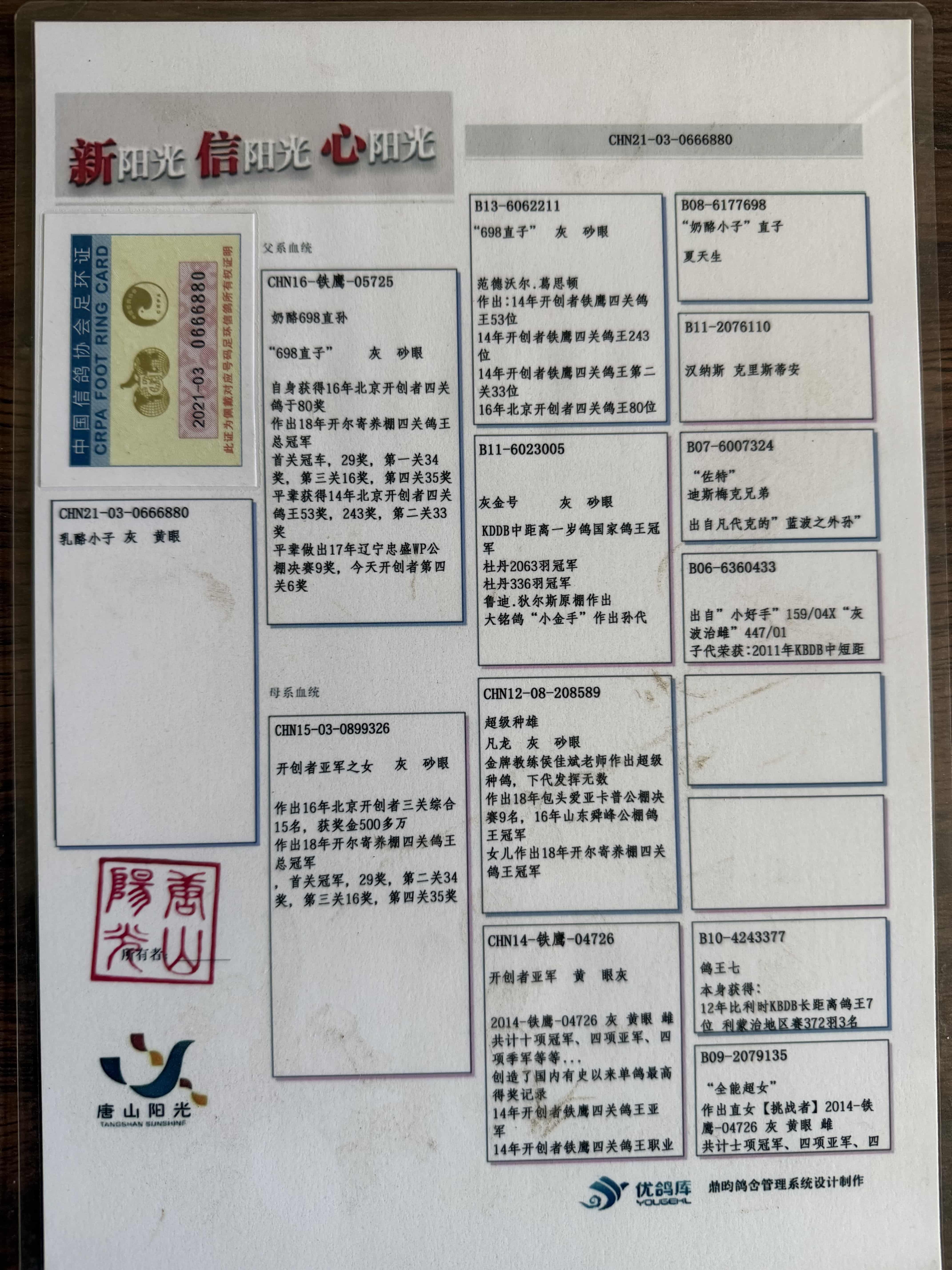1615621 血統(tǒng)楊胡曼斯.哈利血系 本身獲得:四關(guān)鴿王亞軍 ¥0元 0次
