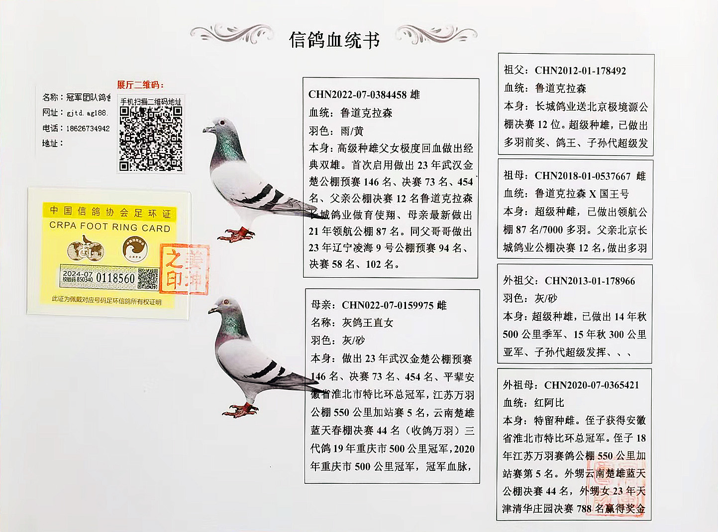 血統(tǒng)書足環(huán)卡隨鴿發(fā)出,低價位高品質(zhì)幼鴿,種賽皆宜。良心做人,所有成績血統(tǒng)假一賠百,不做虛假宣傳!當(dāng)曖贅氪菩塾啥嗄昃楹屯雅卸轄齬┎慰跡�