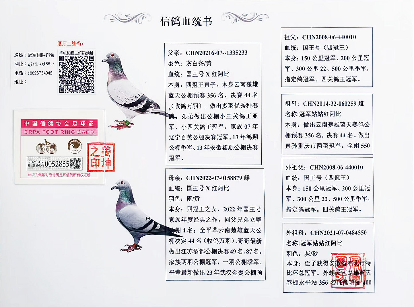 血統(tǒng)書足環(huán)卡隨鴿發(fā)出,低價(jià)位高品質(zhì)幼鴿,種賽皆宜。良心做人,所有成績(jī)血統(tǒng)假一賠百,不做虛假宣傳!當(dāng)曖贅氪菩塾啥嗄昃楹屯雅卸轄齬┎慰跡�