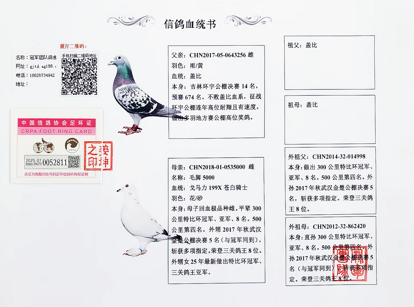 血統(tǒng)書足環(huán)卡隨鴿發(fā)出,低價(jià)位高品質(zhì)幼鴿,種賽皆宜。良心做人,所有成績血統(tǒng)假一賠百,不做虛假宣傳!當(dāng)曖贅氪菩塾啥嗄昃楹屯雅卸轄齬┎慰跡�
