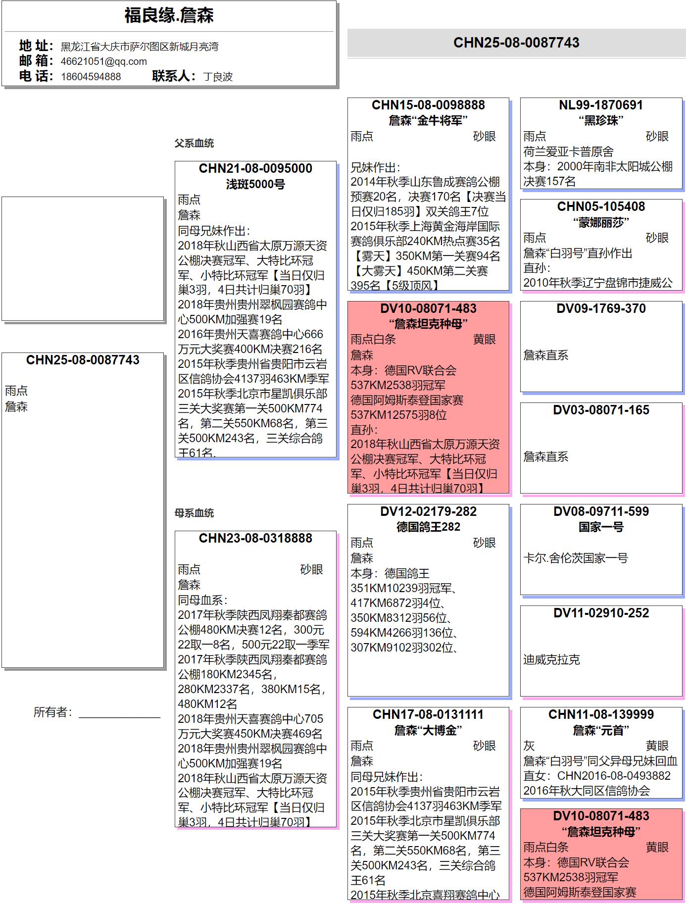 本身:德國(guó)鴿王351KM10239羽冠軍、417KM6872羽4位、350KM8312羽56位、594KM4266羽136位、307KM9102羽302位、