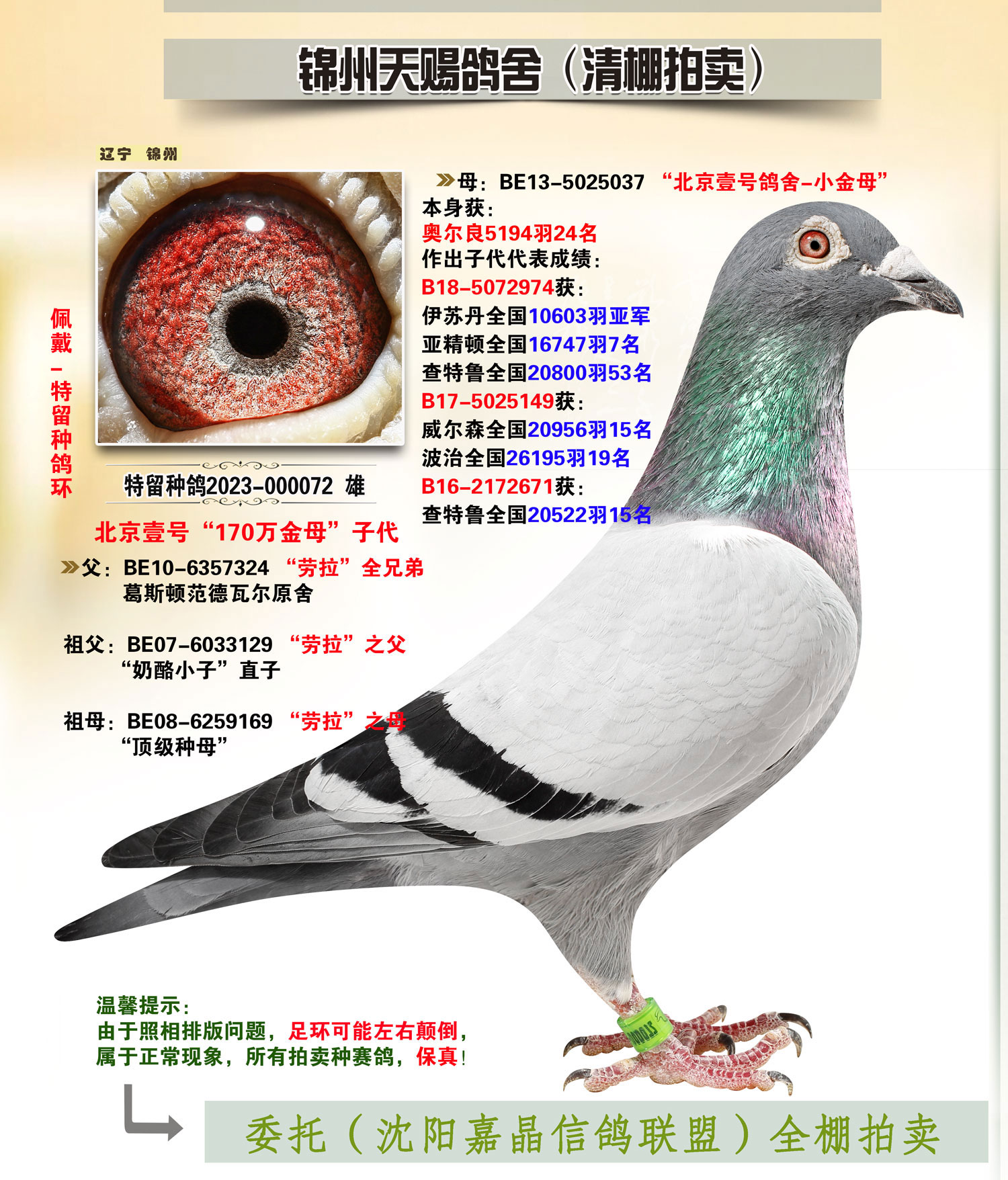 錦州天賜鴿舍,種鴿陣容十分強(qiáng)大,國(guó)內(nèi)外最頂級(jí)輩分,常年征戰(zhàn)各大賽場(chǎng),成績(jī)突出,真實(shí)可查,由于年事已高,故決定清舍,此次拍賣都是老爺子多年積攢的心血,非常實(shí)戰(zhàn),最后一期,請(qǐng)珍惜。