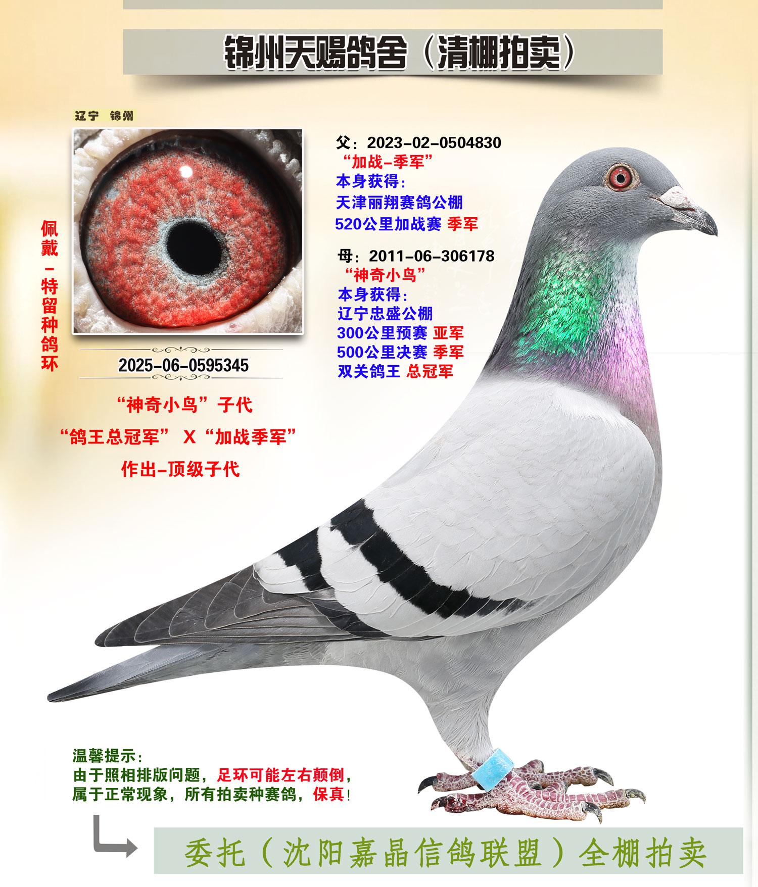 錦州天賜鴿舍,種鴿陣容十分強(qiáng)大,國(guó)內(nèi)外最頂級(jí)輩分,常年征戰(zhàn)各大賽場(chǎng),成績(jī)突出,真實(shí)可查,由于年事已高,故決定清舍,此次拍賣都是老爺子多年積攢的心血,非常實(shí)戰(zhàn),最后一期,請(qǐng)珍惜。