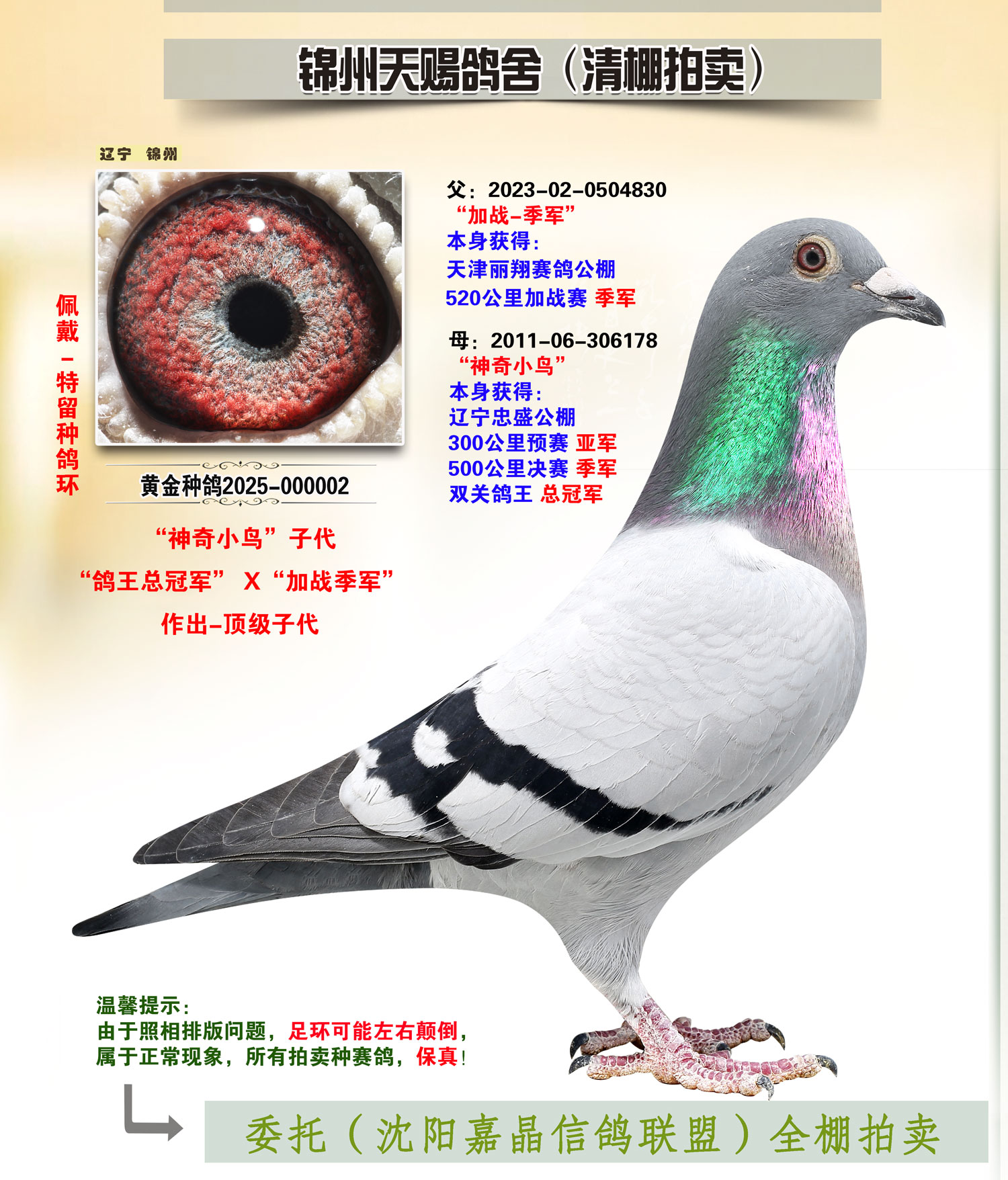 錦州天賜鴿舍,種鴿陣容十分強(qiáng)大,國(guó)內(nèi)外最頂級(jí)輩分,常年征戰(zhàn)各大賽場(chǎng),成績(jī)突出,真實(shí)可查,由于年事已高,故決定清舍,此次拍賣(mài)都是老爺子多年積攢的心血,非常實(shí)戰(zhàn),最后一期,請(qǐng)珍惜。