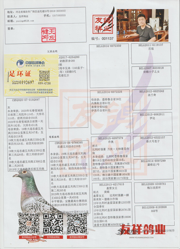 3、注明:請注意看種鴿和血統(tǒng)圖片,有的種鴿環(huán)卡丟失,有些獎鴿無環(huán)卡和獎狀和血統(tǒng),介意請勿出價;