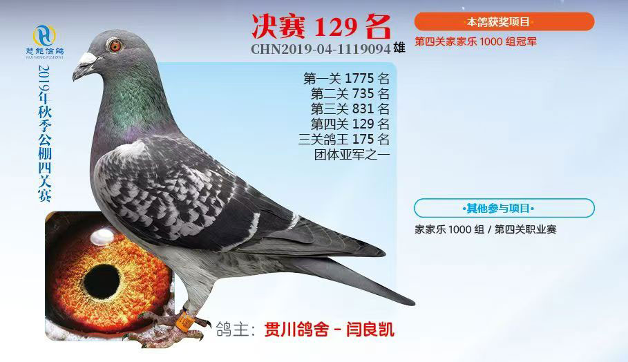 西安慧能兩只成績鴿(129名配154名)配對子代兩只在慧能公棚決賽獲獎,兩只子代在云南華羿公棚獲獎。
