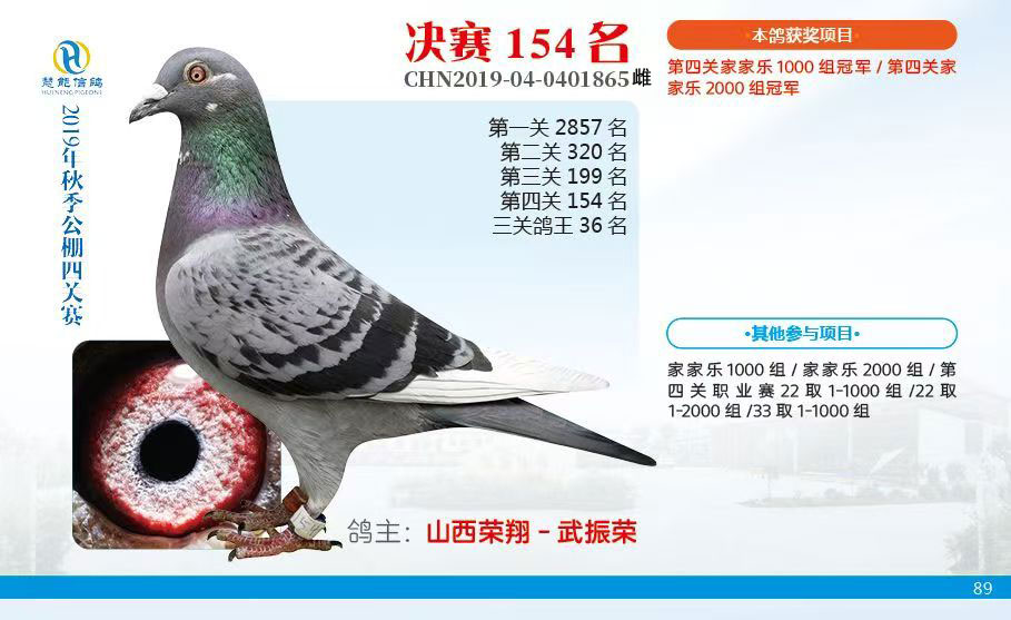 西安慧能兩只成績鴿(129名配154名)配對子代兩只在慧能公棚決賽獲獎,兩只子代在云南華羿公棚獲獎。