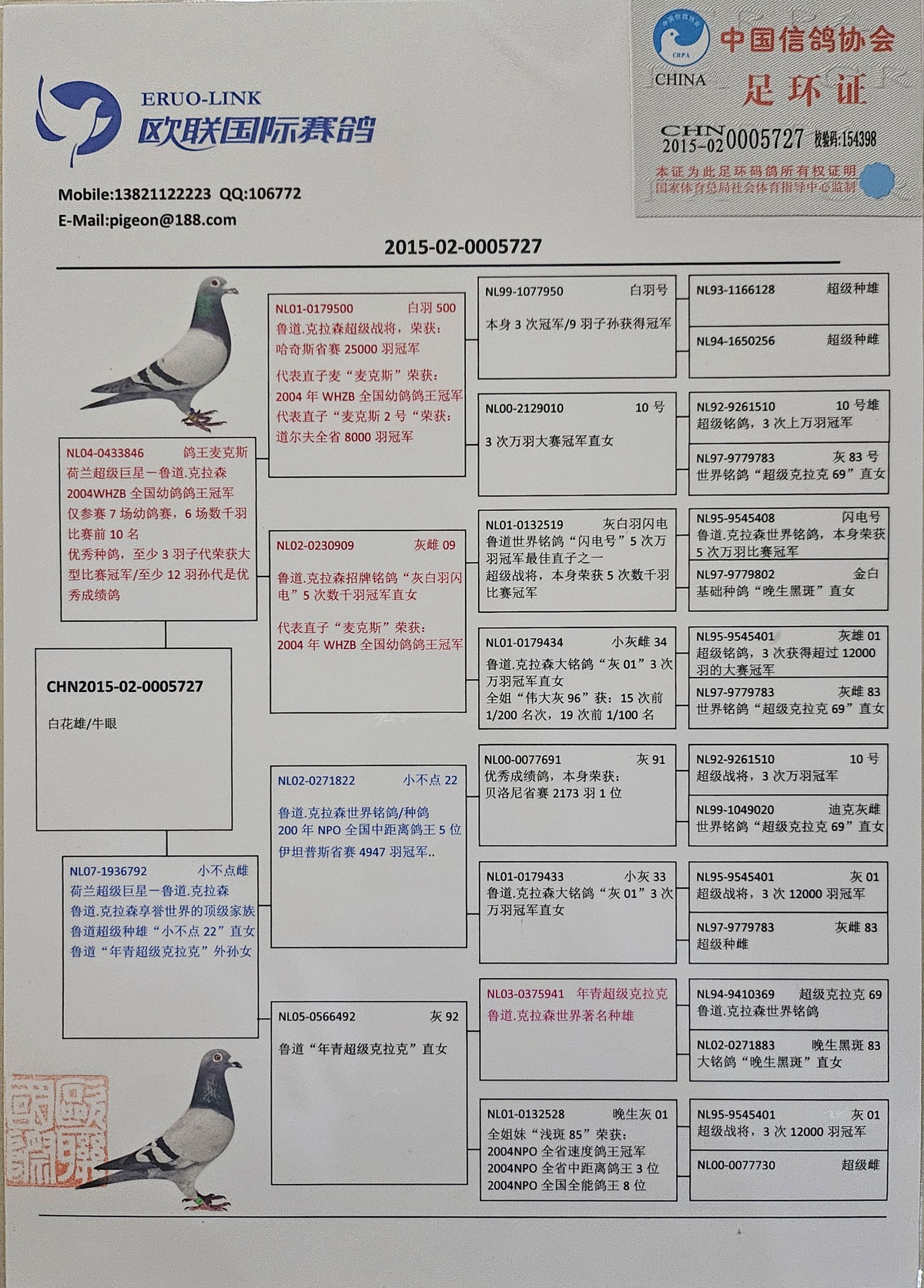 此鴿有原始紙質(zhì)血統(tǒng)書,但因?yàn)橘?gòu)買的時(shí)間長(zhǎng)了電子照片資料沒(méi)有了,早年的鴿子血統(tǒng)書后面也沒(méi)有鴿子照片,鴿子保真,介意勿拍