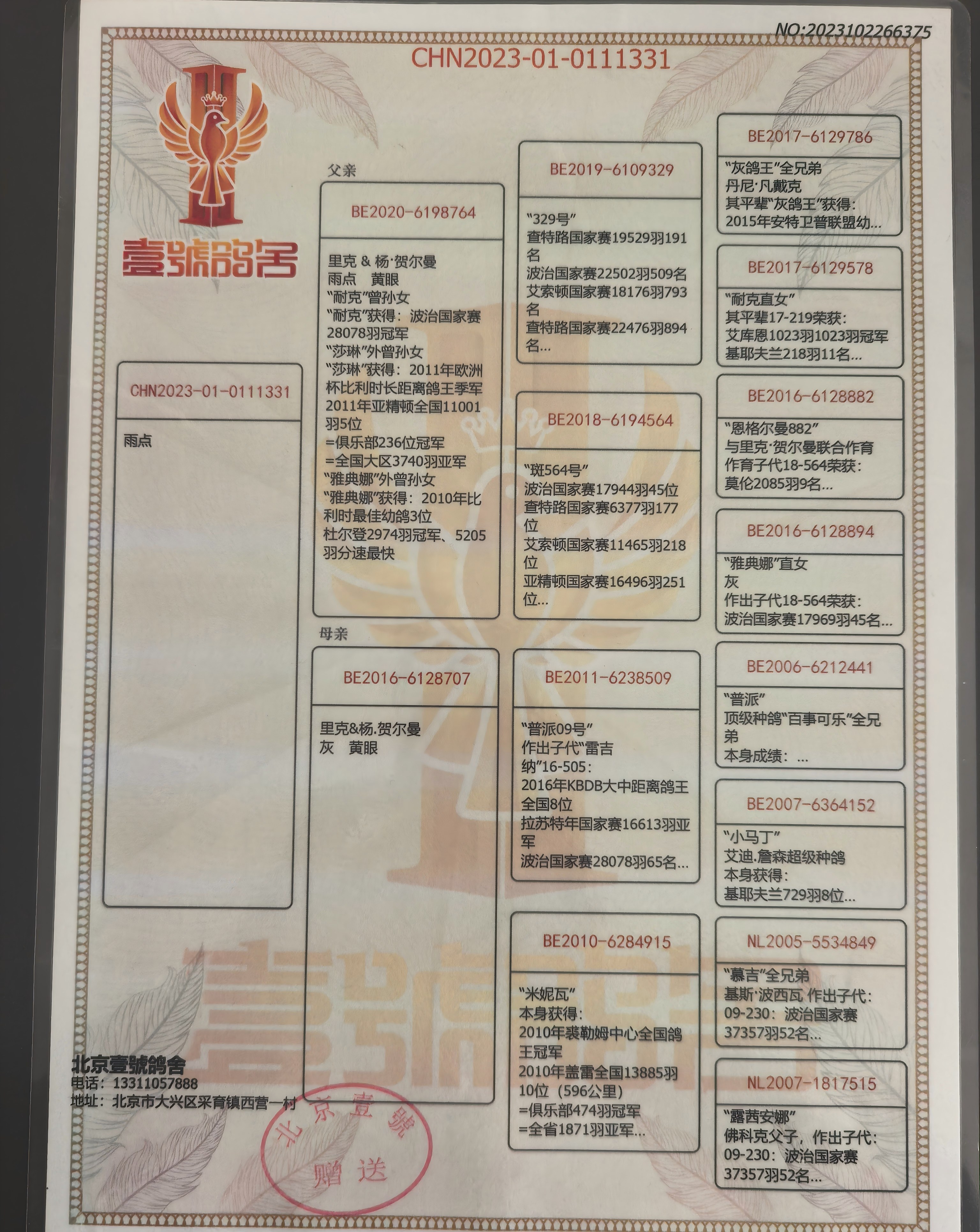 1623135 博翔大隊(duì)鴿王 ¥300元 3次
