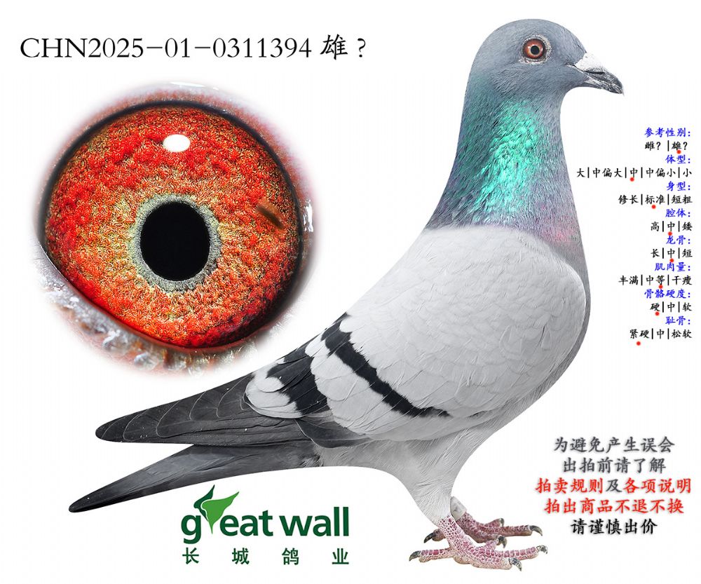 因拍賣鴿均是未做育過(guò)的種鴿或幼鴿,圖內(nèi)所標(biāo)雌雄僅供參考,實(shí)際性別已實(shí)物為準(zhǔn)。