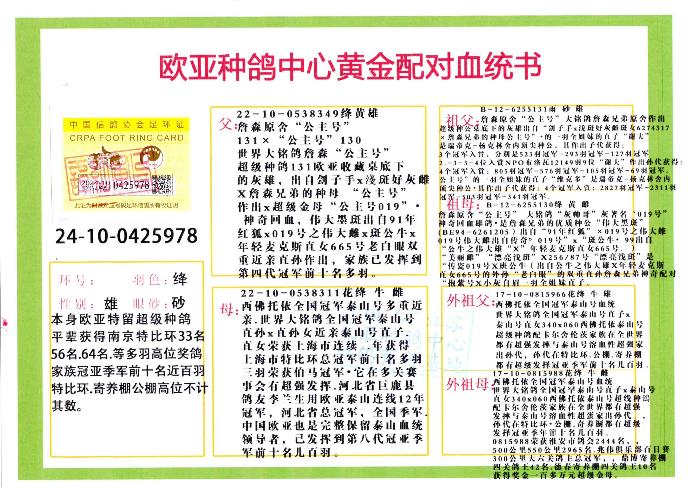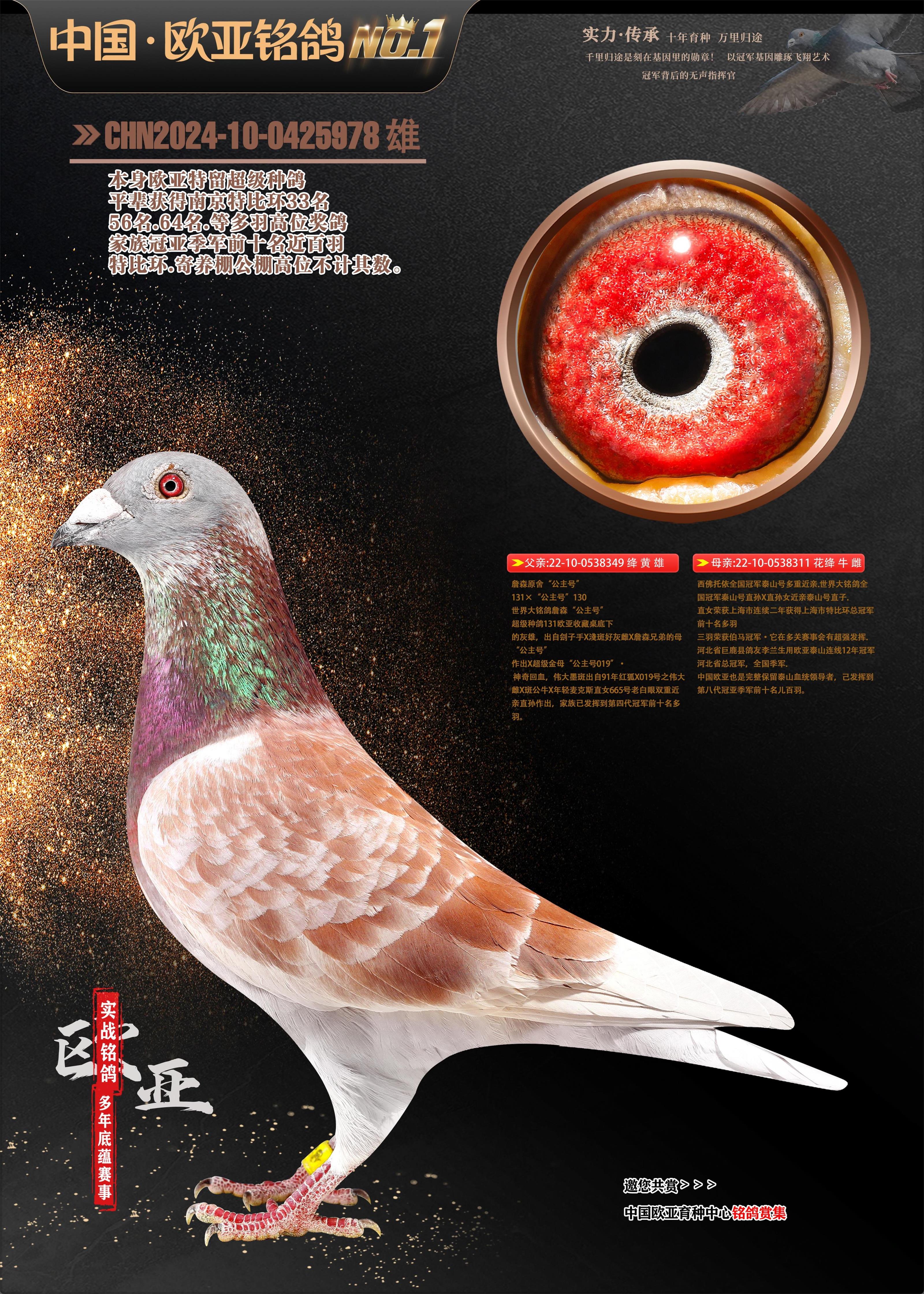 24年秋南京特比環(huán)歐亞榮獲大團體冠軍.小團體冠軍551公里大特比13名.14名.16名.19名.20名.21名.24名.26名.27名.28名.42名.52名.54名.57名.65名.66名.68名.70名.71名.72名.74名.76名.80名.82名.83名.84名.85名.86名.90名.92名.110名.116名.121名.122名.128名.131名.158名.161名.164名.165名.166名.172名.174名.177名.182名.195名.196名.201名.205名.208名.210名.216名.253名.269名.275名.276名.294名.296名.299名,,24年秋云南天南銅都公棚決賽415名.天南銅都小棚決賽409名.云南玉活公棚決賽102名.490名.團體32名上籠二羽進二羽,天南銅都大棚506公里決賽445名。熱烈祝賀河北省巨鹿縣李蘭生老師用歐亞泰山號血系連續(xù)十一年奪冠軍,河北省國家賽冠軍.全國季軍等多次前十名高位,揚州王軍王總用歐亞利奧24年春季獲山東翔宇公棚決賽33名蓋比53名。南京劉正龍劉總用歐亞蓋比獲得24年秋山東濰坊國際公棚決賽42名.精英賽30名.三關(guān)鴿王71名.決賽86名.加站賽16名.南京市特比環(huán)A組鴿王9名.B組鴿王5名.6名.C組鴿王5名.精英賽冠軍4名.技能賽A組冠軍4名.5名.秦淮區(qū)特比環(huán)榮獲15名.46名.48名.87名。四川西昌徐亮徐總用歐亞利奧獲得涼山州聚友決賽177名.第二關(guān)亞軍雙關(guān)鴿王19名.三關(guān)鴿王105名.云南豪庭公棚決賽603名。熱烈祝賀24年四川重慶翔園鴿舍用歐亞泰山號榮獲春季400公里冠軍.秋季500公里冠軍,河北王總用詹森X利奧獲得千羽千翔公棚400公里冠軍,廣東蔡楷煥榮獲24年秋愛好者 賽鴿俱樂部三關(guān)鴿王季軍.一關(guān)420公里99名.二關(guān)450公里11名.三關(guān)520公里32名.單關(guān)季軍.7名.12名,江西李衛(wèi)興榮獲貴州紅楓公棚8名.共翔俱樂部寄養(yǎng)棚四關(guān)綜合鴿王30名.一關(guān)400公里78名.二關(guān)500公里55名.三關(guān)520公里37名.四關(guān)500公里57名.同父母獲公棚18名.雷鳴獲得武漢黃浦育翔中心冠軍,四川陳文獲得四川明鴻俱樂部300公里夢幻2名.3名.4名.9名.10名.13名.14名.15名.31名.34名.40名.41名.42名.43名.69名.71名.72名.73名.74名.94名.95名.97名.98名.99名.419公里決賽榮獲總冠軍7名.總共歸巢9羽,四川徐亮獲豪庭決賽603名,山西鄭勇獲得山西泰鑫公棚決賽255名詹森紅狐,熱烈祝賀馬總獲得開爾(飛躍隊)決賽9名獲獎金1310000萬元.第一關(guān)52名,天津津福資賽180公里96名.獲獎金429543萬元,歐亞支持全國鴿友24年秋多人報喜 祝大家取得更好成績,給歐亞報喜鴿友歐亞決定給每人贈送一羽超級種鴿。歐亞俱樂部特比環(huán)多關(guān)鴿王成績:15年秋淮安特比環(huán)黑色星期一全會上籠9700多羽,當(dāng)天無鴿歸巢,第二天全會歸巢357羽,本舍歸巢158羽.前十名八羽.前一百名歸巢57羽,16年春季獲五關(guān)鴿王總冠軍,總亞軍四名.六名.七名.九名.十名.晶藝俱樂部520公里冠亞季軍5名.6名.7名.9名.11名等,火車頭冠軍.季軍6名.8名.9名.10名,16年秋晶藝俱樂部特比環(huán)520公里亞軍.季軍4名.6名.7名.9名,15年春南京白下特比環(huán)冠軍.亞軍.季軍6名.7名.8名.9名.10名.指定鴿A B組獲得冠軍.亞軍.季軍4名.5名.,17年淮安特比環(huán)亞軍.4名.5名.7名.8名.10名.六關(guān)鴿王總冠軍.4名.6名.9名.10名,寄養(yǎng)棚宿遷劉總20羽特比環(huán)獲冠軍.季軍.4名.7名.8名.9名等。18年榮獲萬羽特比環(huán)六關(guān)鴿王總冠軍.總亞軍.總季軍.6名.8名.十名.單關(guān)四羽冠軍.二羽亞軍.四羽季軍.前十名27羽。19年秋萬羽特比環(huán)六關(guān)鴿王總亞軍.總季軍.5名.8名等,單關(guān)二羽冠軍.三羽亞軍.一羽季軍前十名31羽。20年秋淮安市鴿會四關(guān)特比環(huán)大賽風(fēng)雨無阻鴿王亞軍.鴿王六名,金品俱樂部萬羽特比環(huán)六關(guān)鴿王總冠軍,總亞軍.四名.五名.六名.七名.八名.十名.前二百名鴿王35羽,單關(guān)冠亞季軍前十名四十多羽,火車頭五關(guān)鴿王季軍.六名.八名.前二百名鴿王十七羽。20年春榮獲淮安五區(qū)一市四關(guān)鴿王總冠軍.亞軍.四名.八名.九名。21年秋榮獲金品萬羽特比環(huán)大賽六關(guān)鴿王總亞軍.總季軍.四名.七名.九名.十名.單關(guān)冠亞軍季軍前十名三十多羽;疖囶^協(xié)會鴿王六名.七名.十名.單關(guān)前十名十七羽。22年秋榮獲鴿王總冠軍.總亞軍.5名.7名.8名.9名.11名.單關(guān)冠亞季軍前十名三十多羽,第一關(guān)單關(guān)前二百名四十多羽,第二關(guān)前二百名三十多羽,第三關(guān)前二百名四十多羽,第四關(guān)前二百名四十多羽,第五關(guān)前一百名53羽。23年秋榮獲鴿王季軍.五名.八名.十名.13名.17名.20名.27名等多羽鴿王.單關(guān)前十名二十多羽。公棚.寄養(yǎng)棚部分成績:16年秋寧夏黃河公棚總冠軍電腦戈馬力指定通炮冠軍,17年送八羽參賽獲得鴿王八名進獎四名,支持韓總榮獲八名。支持鴿友榮獲寧夏中衛(wèi)公棚決賽總冠軍.精英賽冠軍,支持18年寧夏黃河公棚決賽冠軍詹森X泰山。安徽鼎博寄養(yǎng)棚院內(nèi)外四關(guān)鴿王總冠軍.鴿王十七名.三十七名同窩,鴿王39名.42名.58名.67名。18年山東公棚預(yù)賽冠軍.決賽65名.送八羽進獎五羽.指定獲奔馳汽車一輛。支持鴿友獲得云南藍云公棚冠軍.蓋比X佛卡門。支持鴿友榮獲云南銀集公棚決賽冠軍 詹森427X520血系 速度賽6700羽冠軍。17年榮獲金馬俱樂部寄養(yǎng)棚四關(guān)鴿王總冠軍.季軍.六名.八名.第一關(guān)冠軍.亞軍.季軍四名.七名.十一名.金牌教練獎。支持鴿友18年北京費翔公棚預(yù)賽九名電腦X