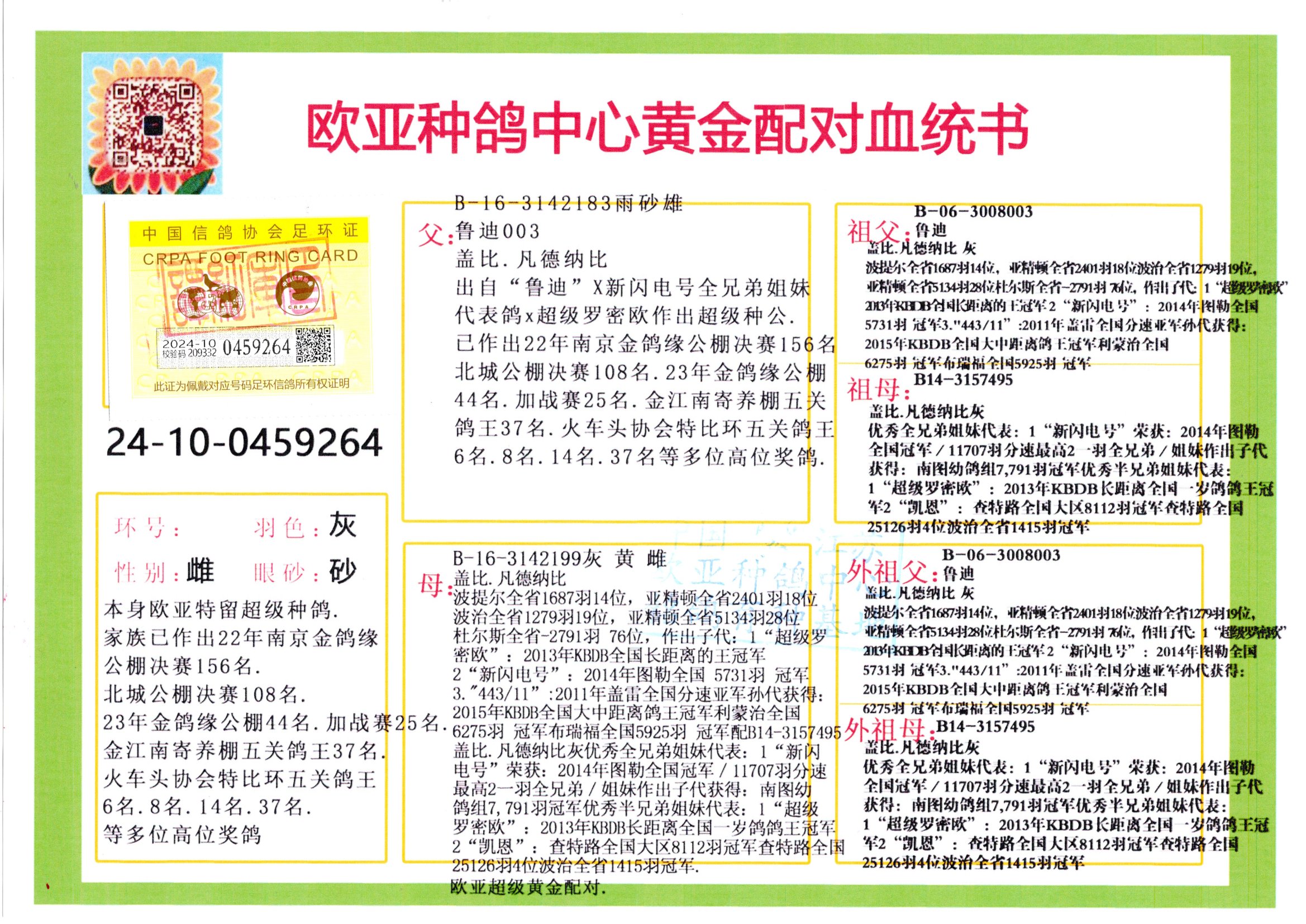 24年秋南京特比環(huán)歐亞榮獲大團體冠軍.小團體冠軍551公里大特比13名.14名.16名.19名.20名.21名.24名.26名.27名.28名.42名.52名.54名.57名.65名.66名.68名.70名.71名.72名.74名.76名.80名.82名.83名.84名.85名.86名.90名.92名.110名.116名.121名.122名.128名.131名.158名.161名.164名.165名.166名.172名.174名.177名.182名.195名.196名.201名.205名.208名.210名.216名.253名.269名.275名.276名.294名.296名.299名,,24年秋云南天南銅都公棚決賽415名.天南銅都小棚決賽409名.云南玉活公棚決賽102名.490名.團體32名上籠二羽進二羽,天南銅都大棚506公里決賽445名。熱烈祝賀河北省巨鹿縣李蘭生老師用歐亞泰山號血系連續(xù)十一年奪冠軍,河北省國家賽冠軍.全國季軍等多次前十名高位,揚州王軍王總用歐亞利奧24年春季獲山東翔宇公棚決賽33名蓋比53名。南京劉正龍劉總用歐亞蓋比獲得24年秋山東濰坊國際公棚決賽42名.精英賽30名.三關(guān)鴿王71名.決賽86名.加站賽16名.南京市特比環(huán)A組鴿王9名.B組鴿王5名.6名.C組鴿王5名.精英賽冠軍4名.技能賽A組冠軍4名.5名.秦淮區(qū)特比環(huán)榮獲15名.46名.48名.87名。四川西昌徐亮徐總用歐亞利奧獲得涼山州聚友決賽177名.第二關(guān)亞軍雙關(guān)鴿王19名.三關(guān)鴿王105名.云南豪庭公棚決賽603名。熱烈祝賀24年四川重慶翔園鴿舍用歐亞泰山號榮獲春季400公里冠軍.秋季500公里冠軍,河北王總用詹森X利奧獲得千羽千翔公棚400公里冠軍,廣東蔡楷煥榮獲24年秋愛好者 賽鴿俱樂部三關(guān)鴿王季軍.一關(guān)420公里99名.二關(guān)450公里11名.三關(guān)520公里32名.單關(guān)季軍.7名.12名,江西李衛(wèi)興榮獲貴州紅楓公棚8名.共翔俱樂部寄養(yǎng)棚四關(guān)綜合鴿王30名.一關(guān)400公里78名.二關(guān)500公里55名.三關(guān)520公里37名.四關(guān)500公里57名.同父母獲公棚18名.雷鳴獲得武漢黃浦育翔中心冠軍,四川陳文獲得四川明鴻俱樂部300公里夢幻2名.3名.4名.9名.10名.13名.14名.15名.31名.34名.40名.41名.42名.43名.69名.71名.72名.73名.74名.94名.95名.97名.98名.99名.419公里決賽榮獲總冠軍7名.總共歸巢9羽,四川徐亮獲豪庭決賽603名,山西鄭勇獲得山西泰鑫公棚決賽255名詹森紅狐,熱烈祝賀馬總獲得開爾(飛躍隊)決賽9名獲獎金1310000萬元.第一關(guān)52名,天津津福資賽180公里96名.獲獎金429543萬元,歐亞支持全國鴿友24年秋多人報喜 祝大家取得更好成績,給歐亞報喜鴿友歐亞決定給每人贈送一羽超級種鴿。歐亞俱樂部特比環(huán)多關(guān)鴿王成績:15年秋淮安特比環(huán)黑色星期一全會上籠9700多羽,當天無鴿歸巢,第二天全會歸巢357羽,本舍歸巢158羽.前十名八羽.前一百名歸巢57羽,16年春季獲五關(guān)鴿王總冠軍,總亞軍四名.六名.七名.九名.十名.晶藝俱樂部520公里冠亞季軍5名.6名.7名.9名.11名等,火車頭冠軍.季軍6名.8名.9名.10名,16年秋晶藝俱樂部特比環(huán)520公里亞軍.季軍4名.6名.7名.9名,15年春南京白下特比環(huán)冠軍.亞軍.季軍6名.7名.8名.9名.10名.指定鴿A B組獲得冠軍.亞軍.季軍4名.5名.,17年淮安特比環(huán)亞軍.4名.5名.7名.8名.10名.六關(guān)鴿王總冠軍.4名.6名.9名.10名,寄養(yǎng)棚宿遷劉總20羽特比環(huán)獲冠軍.季軍.4名.7名.8名.9名等。18年榮獲萬羽特比環(huán)六關(guān)鴿王總冠軍.總亞軍.總季軍.6名.8名.十名.單關(guān)四羽冠軍.二羽亞軍.四羽季軍.前十名27羽。19年秋萬羽特比環(huán)六關(guān)鴿王總亞軍.總季軍.5名.8名等,單關(guān)二羽冠軍.三羽亞軍.一羽季軍前十名31羽。20年秋淮安市鴿會四關(guān)特比環(huán)大賽風(fēng)雨無阻鴿王亞軍.鴿王六名,金品俱樂部萬羽特比環(huán)六關(guān)鴿王總冠軍,總亞軍.四名.五名.六名.七名.八名.十名.前二百名鴿王35羽,單關(guān)冠亞季軍前十名四十多羽,火車頭五關(guān)鴿王季軍.六名.八名.前二百名鴿王十七羽。20年春榮獲淮安五區(qū)一市四關(guān)鴿王總冠軍.亞軍.四名.八名.九名。21年秋榮獲金品萬羽特比環(huán)大賽六關(guān)鴿王總亞軍.總季軍.四名.七名.九名.十名.單關(guān)冠亞軍季軍前十名三十多羽。火車頭協(xié)會鴿王六名.七名.十名.單關(guān)前十名十七羽。22年秋榮獲鴿王總冠軍.總亞軍.5名.7名.8名.9名.11名.單關(guān)冠亞季軍前十名三十多羽,第一關(guān)單關(guān)前二百名四十多羽,第二關(guān)前二百名三十多羽,第三關(guān)前二百名四十多羽,第四關(guān)前二百名四十多羽,第五關(guān)前一百名53羽。23年秋榮獲鴿王季軍.五名.八名.十名.13名.17名.20名.27名等多羽鴿王.單關(guān)前十名二十多羽。公棚.寄養(yǎng)棚部分成績:16年秋寧夏黃河公棚總冠軍電腦戈馬力指定通炮冠軍,17年送八羽參賽獲得鴿王八名進獎四名,支持韓總榮獲八名。支持鴿友榮獲寧夏中衛(wèi)公棚決賽總冠軍.精英賽冠軍,支持18年寧夏黃河公棚決賽冠軍詹森X泰山。安徽鼎博寄養(yǎng)棚院內(nèi)外四關(guān)鴿王總冠軍.鴿王十七名.三十七名同窩,鴿王39名.42名.58名.67名。18年山東公棚預(yù)賽冠軍.決賽65名.送八羽進獎五羽.指定獲奔馳汽車一輛。支持鴿友獲得云南藍云公棚冠軍.蓋比X佛卡門。支持鴿友榮獲云南銀集公棚決賽冠軍 詹森427X520血系 速度賽6700羽冠軍。17年榮獲金馬俱樂部寄養(yǎng)棚四關(guān)鴿王總冠軍.季軍.六名.八名.第一關(guān)冠軍.亞軍.季軍四名.七名.十一名.金牌教練獎。支持鴿友18年北京費翔公棚預(yù)賽九名電腦X桑