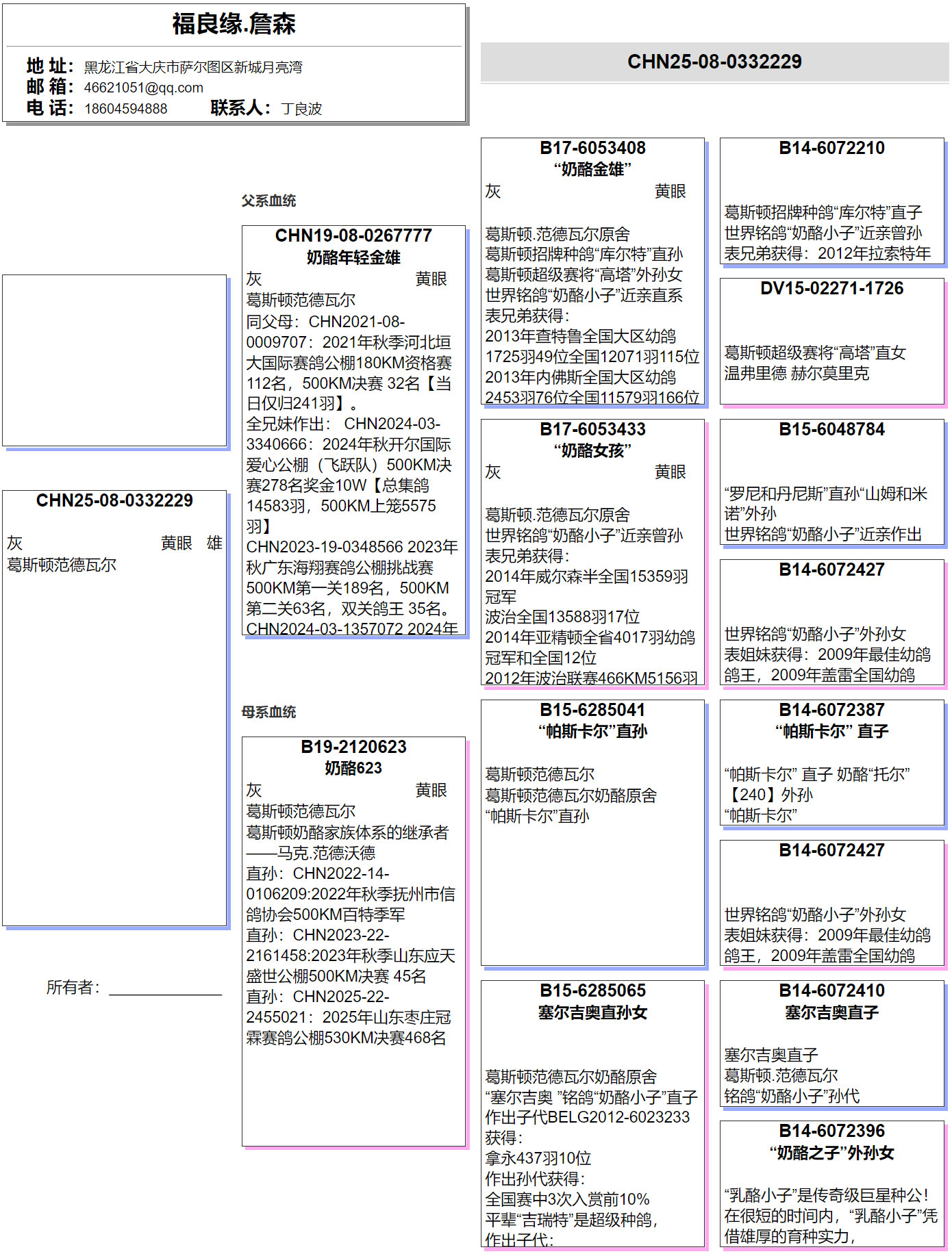 曾祖母:B14-6072427 世界銘鴿“奶酪小子”外孫女