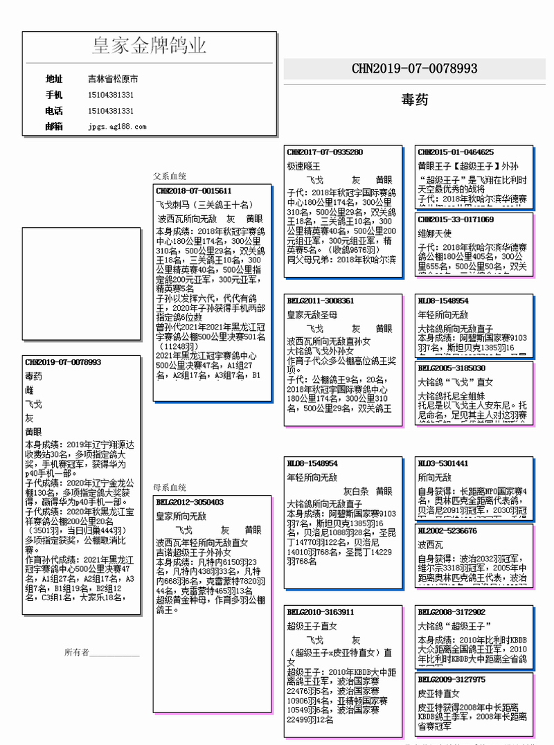作育孫代成績:2021年黑龍江冠宇賽鴿中心500公里決賽47名,A1組27名,A2組17名,A3組7名,B1組19名,B2組12名,C3組1名,大家樂18名,手機(jī)組4名。(13220羽)