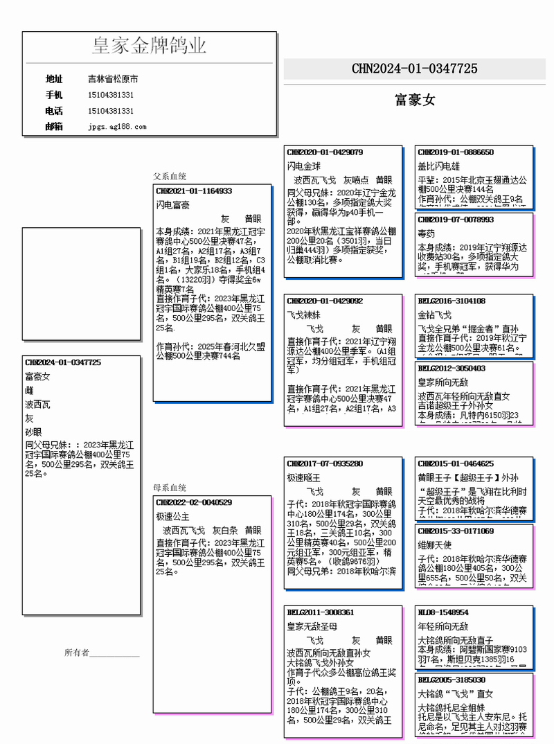 直接作育子代:2023年黑龍江冠宇國際賽鴿公棚400公里75名,500公里295名,雙關(guān)鴿王25名。