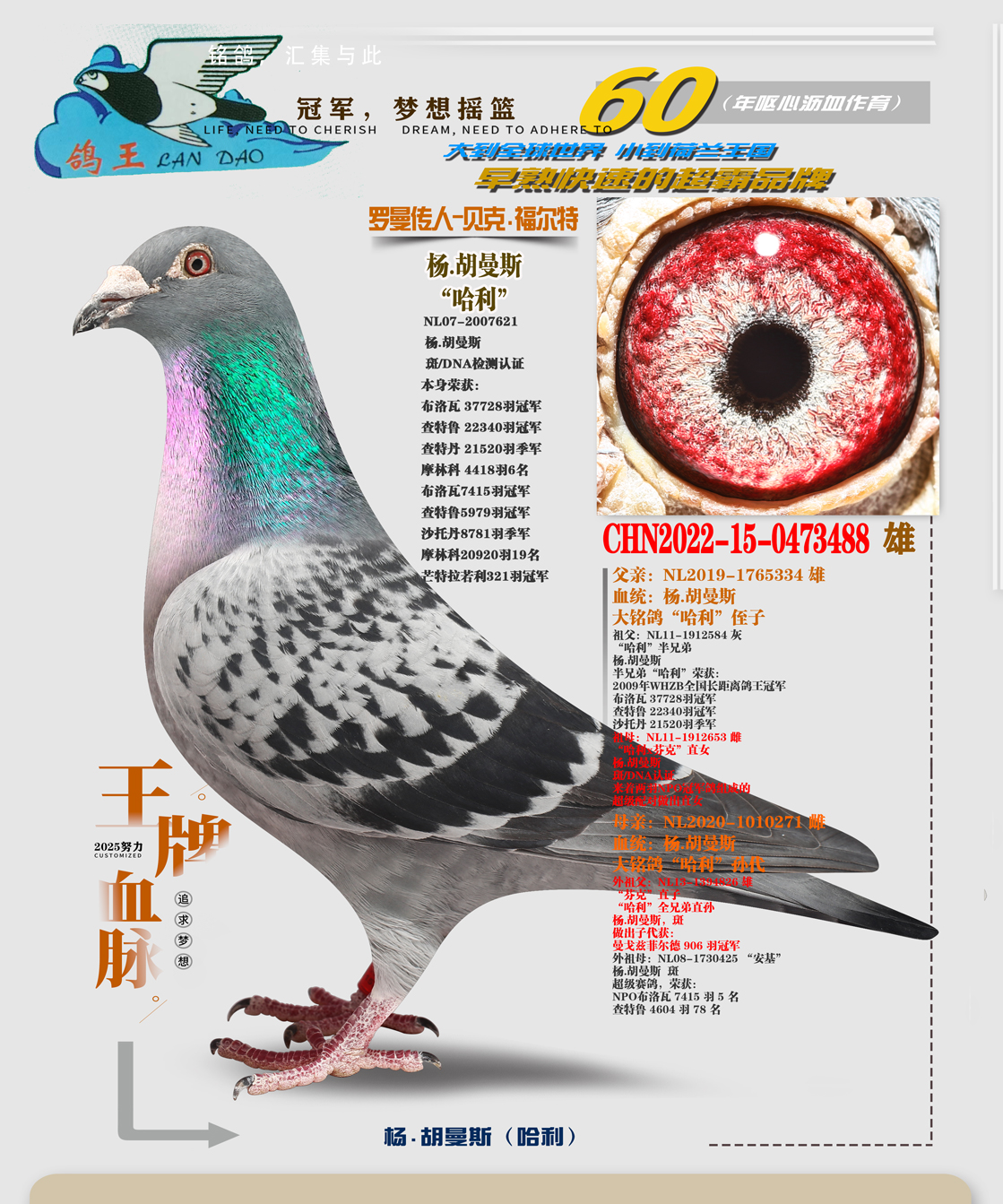 感謝齊魯良父子鴿業(yè)劉總支援巴賽羅那血統(tǒng)配我家彼得曼德斯血統(tǒng),在今年四關(guān)鴿王大賽斬獲5名,此鴿也是去年800特比小號只取10名的情況下飛進10名,獲獎金一萬元!再次感謝劉總!。