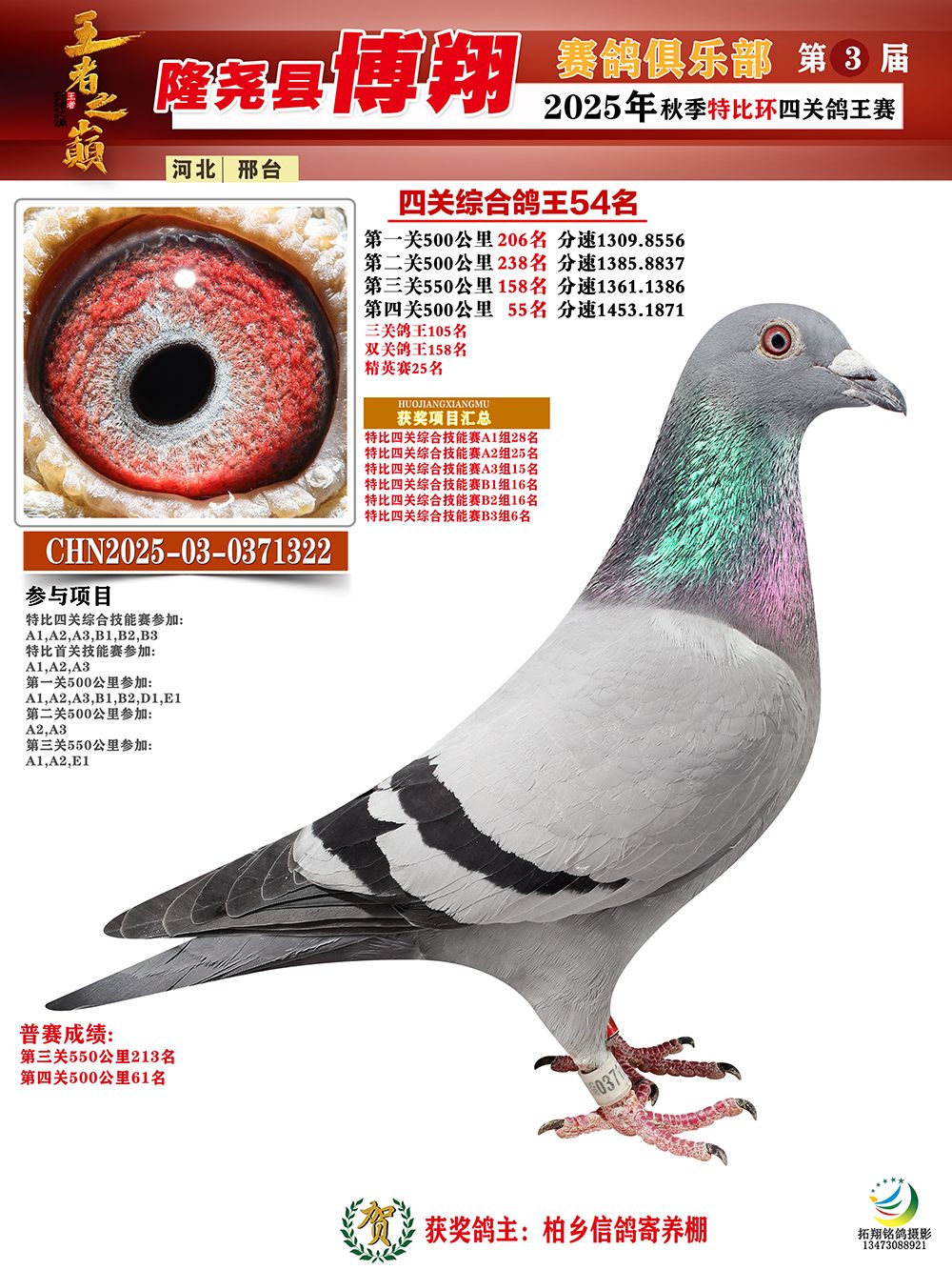 | 1626219 | 博翔特比四關鴿王冠軍 | ¥1600元 | 4次 |