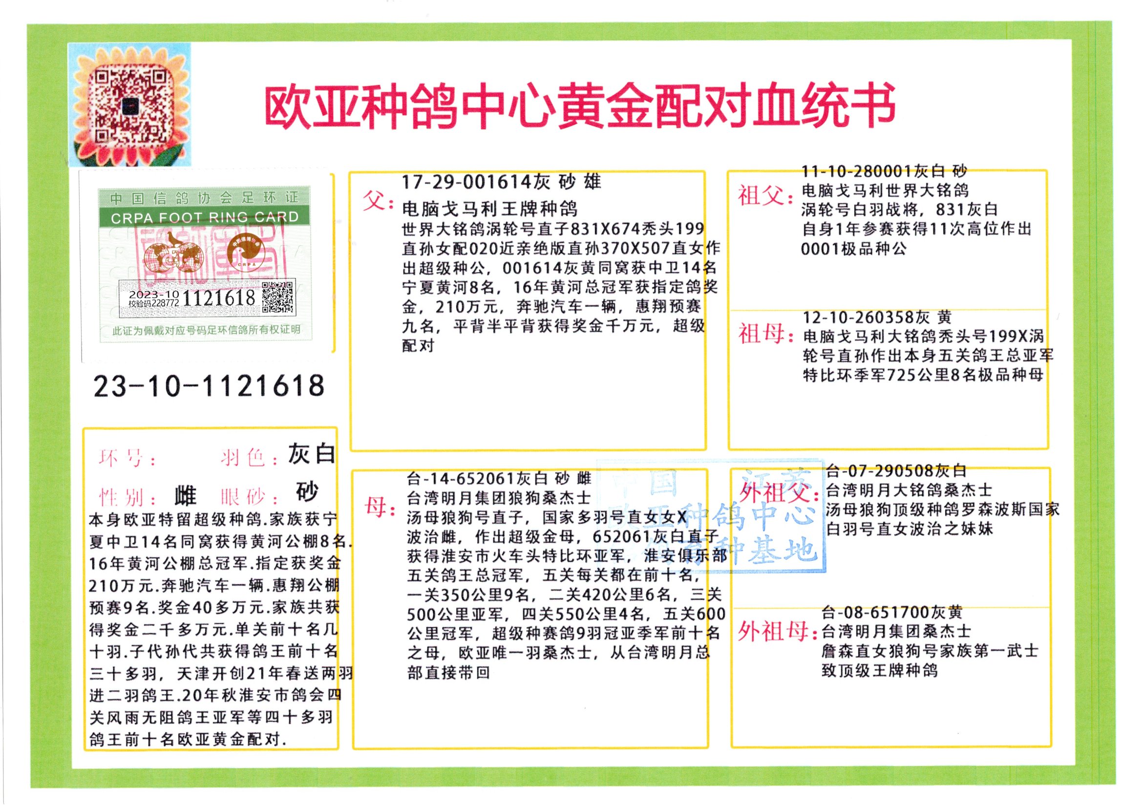 24年秋南京特比環(huán)歐亞榮獲大團體冠軍.小團體冠軍551公里大特比13名.14名.16名.19名.20名.21名.24名.26名.27名.28名.42名.52名.54名.57名.65名.66名.68名.70名.71名.72名.74名.76名.80名.82名.83名.84名.85名.86名.90名.92名.110名.116名.121名.122名.128名.131名.158名.161名.164名.165名.166名.172名.174名.177名.182名.195名.196名.201名.205名.208名.210名.216名.253名.269名.275名.276名.294名.296名.299名,,24年秋云南天南銅都公棚決賽415名.天南銅都小棚決賽409名.云南玉活公棚決賽102名.490名.團體32名上籠二羽進二羽,天南銅都大棚506公里決賽445名。熱烈祝賀河北省巨鹿縣李蘭生老師用歐亞泰山號血系連續(xù)十一年奪冠軍,河北省國家賽冠軍.全國季軍等多次前十名高位,揚州王軍王總用歐亞利奧24年春季獲山東翔宇公棚決賽33名蓋比53名。南京劉正龍劉總用歐亞蓋比獲得24年秋山東濰坊國際公棚決賽42名.精英賽30名.三關鴿王71名.決賽86名.加站賽16名.南京市特比環(huán)A組鴿王9名.B組鴿王5名.6名.C組鴿王5名.精英賽冠軍4名.技能賽A組冠軍4名.5名.秦淮區(qū)特比環(huán)榮獲15名.46名.48名.87名。四川西昌徐亮徐總用歐亞利奧獲得涼山州聚友決賽177名.第二關亞軍雙關鴿王19名.三關鴿王105名.云南豪庭公棚決賽603名。熱烈祝賀24年四川重慶翔園鴿舍用歐亞泰山號榮獲春季400公里冠軍.秋季500公里冠軍,河北王總用詹森X利奧獲得千羽千翔公棚400公里冠軍,廣東蔡楷煥榮獲24年秋愛好者 賽鴿俱樂部三關鴿王季軍.一關420公里99名.二關450公里11名.三關520公里32名.單關季軍.7名.12名,江西李衛(wèi)興榮獲貴州紅楓公棚8名.共翔俱樂部寄養(yǎng)棚四關綜合鴿王30名.一關400公里78名.二關500公里55名.三關520公里37名.四關500公里57名.同父母獲公棚18名.雷鳴獲得武漢黃浦育翔中心冠軍,四川陳文獲得四川明鴻俱樂部300公里夢幻2名.3名.4名.9名.10名.13名.14名.15名.31名.34名.40名.41名.42名.43名.69名.71名.72名.73名.74名.94名.95名.97名.98名.99名.419公里決賽榮獲總冠軍7名.總共歸巢9羽,四川徐亮獲豪庭決賽603名,山西鄭勇獲得山西泰鑫公棚決賽255名詹森紅狐,熱烈祝賀馬總獲得開爾(飛躍隊)決賽9名獲獎金1310000萬元.第一關52名,天津津福資賽180公里96名.獲獎金429543萬元,歐亞支持全國鴿友24年秋多人報喜 祝大家取得更好成績,給歐亞報喜鴿友歐亞決定給每人贈送一羽超級種鴿。歐亞俱樂部特比環(huán)多關鴿王成績:15年秋淮安特比環(huán)黑色星期一全會上籠9700多羽,當天無鴿歸巢,第二天全會歸巢357羽,本舍歸巢158羽.前十名八羽.前一百名歸巢57羽,16年春季獲五關鴿王總冠軍,總亞軍四名.六名.七名.九名.十名.晶藝俱樂部520公里冠亞季軍5名.6名.7名.9名.11名等,火車頭冠軍.季軍6名.8名.9名.10名,16年秋晶藝俱樂部特比環(huán)520公里亞軍.季軍4名.6名.7名.9名,15年春南京白下特比環(huán)冠軍.亞軍.季軍6名.7名.8名.9名.10名.指定鴿A B組獲得冠軍.亞軍.季軍4名.5名.,17年淮安特比環(huán)亞軍.4名.5名.7名.8名.10名.六關鴿王總冠軍.4名.6名.9名.10名,寄養(yǎng)棚宿遷劉總20羽特比環(huán)獲冠軍.季軍.4名.7名.8名.9名等。18年榮獲萬羽特比環(huán)六關鴿王總冠軍.總亞軍.總季軍.6名.8名.十名.單關四羽冠軍.二羽亞軍.四羽季軍.前十名27羽。19年秋萬羽特比環(huán)六關鴿王總亞軍.總季軍.5名.8名等,單關二羽冠軍.三羽亞軍.一羽季軍前十名31羽。20年秋淮安市鴿會四關特比環(huán)大賽風雨無阻鴿王亞軍.鴿王六名,金品俱樂部萬羽特比環(huán)六關鴿王總冠軍,總亞軍.四名.五名.六名.七名.八名.十名.前二百名鴿王35羽,單關冠亞季軍前十名四十多羽,火車頭五關鴿王季軍.六名.八名.前二百名鴿王十七羽。20年春榮獲淮安五區(qū)一市四關鴿王總冠軍.亞軍.四名.八名.九名。21年秋榮獲金品萬羽特比環(huán)大賽六關鴿王總亞軍.總季軍.四名.七名.九名.十名.單關冠亞軍季軍前十名三十多羽;疖囶^協(xié)會鴿王六名.七名.十名.單關前十名十七羽。22年秋榮獲鴿王總冠軍.總亞軍.5名.7名.8名.9名.11名.單關冠亞季軍前十名三十多羽,第一關單關前二百名四十多羽,第二關前二百名三十多羽,第三關前二百名四十多羽,第四關前二百名四十多羽,第五關前一百名53羽。23年秋榮獲鴿王季軍.五名.八名.十名.13名.17名.20名.27名等多羽鴿王.單關前十名二十多羽。公棚.寄養(yǎng)棚部分成績:16年秋寧夏黃河公棚總冠軍電腦戈馬力指定通炮冠軍,17年送八羽參賽獲得鴿王八名進獎四名,支持韓總榮獲八名。支持鴿友榮獲寧夏中衛(wèi)公棚決賽總冠軍.精英賽冠軍,支持18年寧夏黃河公棚決賽冠軍詹森X泰山。安徽鼎博寄養(yǎng)棚院內(nèi)外四關鴿王總冠軍.鴿王十七名.三十七名同窩,鴿王39名.42名.58名.67名。18年山東公棚預賽冠軍.決賽65名.送八羽進獎五羽.指定獲奔馳汽車一輛。支持鴿友獲得云南藍云公棚冠軍.蓋比X佛卡門。支持鴿友榮獲云南銀集公棚決賽冠軍 詹森427X520血系 速度賽6700羽冠軍。17年榮獲金馬俱樂部寄養(yǎng)棚四關鴿王總冠軍.季軍.六名.八名.第一關冠軍.亞軍.季軍四名.七名.十一名.金牌教練獎。支持鴿友18年北京費翔公棚預賽九名電腦X桑杰士,支持鴿友榮獲陜西威力公棚決賽11名.內(nèi)蒙古臨河寄養(yǎng)棚四關鴿王六名.詹森配泰山,支持河北王總用歐亞詹森427配胡本喜獲20年秋開爾青年棚季軍。云南東榮公棚16年預賽冠軍.決賽77名.17年決賽12名.詹森紅狐X泰山,17年平安公