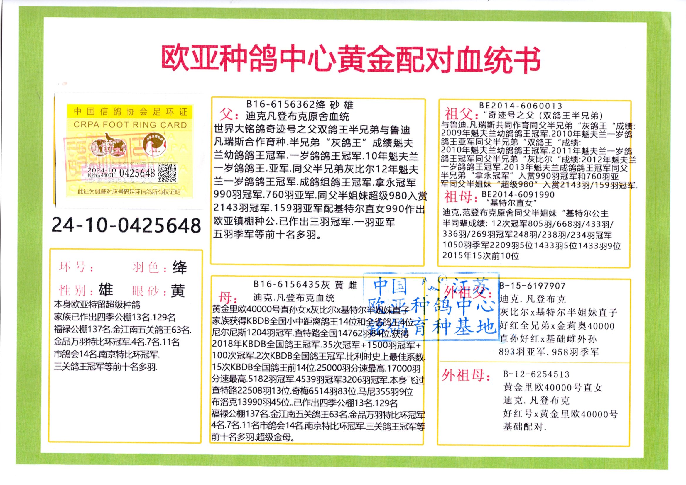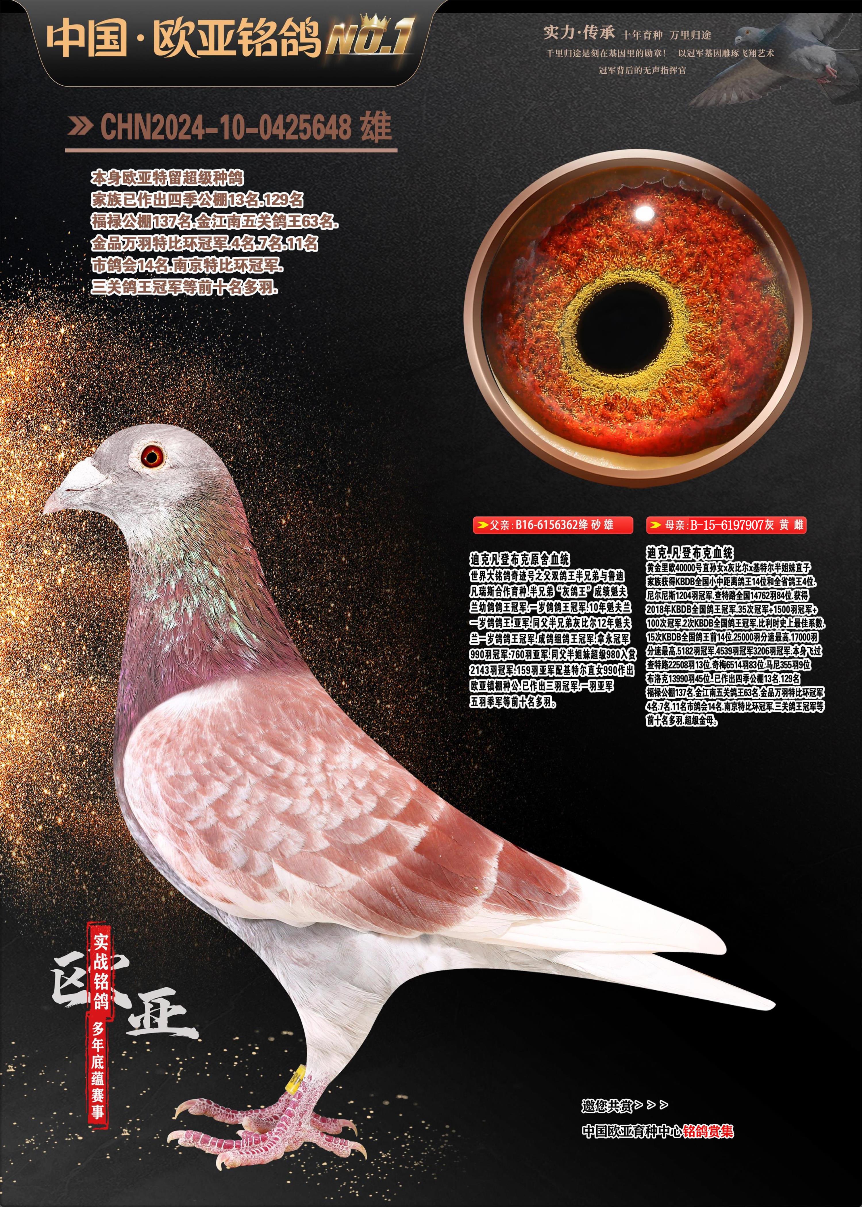 24年秋南京特比環(huán)歐亞榮獲大團體冠軍.小團體冠軍551公里大特比13名.14名.16名.19名.20名.21名.24名.26名.27名.28名.42名.52名.54名.57名.65名.66名.68名.70名.71名.72名.74名.76名.80名.82名.83名.84名.85名.86名.90名.92名.110名.116名.121名.122名.128名.131名.158名.161名.164名.165名.166名.172名.174名.177名.182名.195名.196名.201名.205名.208名.210名.216名.253名.269名.275名.276名.294名.296名.299名,,24年秋云南天南銅都公棚決賽415名.天南銅都小棚決賽409名.云南玉活公棚決賽102名.490名.團體32名上籠二羽進二羽,天南銅都大棚506公里決賽445名。熱烈祝賀河北省巨鹿縣李蘭生老師用歐亞泰山號血系連續(xù)十一年奪冠軍,河北省國家賽冠軍.全國季軍等多次前十名高位,揚州王軍王總用歐亞利奧24年春季獲山東翔宇公棚決賽33名蓋比53名。南京劉正龍劉總用歐亞蓋比獲得24年秋山東濰坊國際公棚決賽42名.精英賽30名.三關(guān)鴿王71名.決賽86名.加站賽16名.南京市特比環(huán)A組鴿王9名.B組鴿王5名.6名.C組鴿王5名.精英賽冠軍4名.技能賽A組冠軍4名.5名.秦淮區(qū)特比環(huán)榮獲15名.46名.48名.87名。四川西昌徐亮徐總用歐亞利奧獲得涼山州聚友決賽177名.第二關(guān)亞軍雙關(guān)鴿王19名.三關(guān)鴿王105名.云南豪庭公棚決賽603名。熱烈祝賀24年四川重慶翔園鴿舍用歐亞泰山號榮獲春季400公里冠軍.秋季500公里冠軍,河北王總用詹森X利奧獲得千羽千翔公棚400公里冠軍,廣東蔡楷煥榮獲24年秋愛好者 賽鴿俱樂部三關(guān)鴿王季軍.一關(guān)420公里99名.二關(guān)450公里11名.三關(guān)520公里32名.單關(guān)季軍.7名.12名,江西李衛(wèi)興榮獲貴州紅楓公棚8名.共翔俱樂部寄養(yǎng)棚四關(guān)綜合鴿王30名.一關(guān)400公里78名.二關(guān)500公里55名.三關(guān)520公里37名.四關(guān)500公里57名.同父母獲公棚18名.雷鳴獲得武漢黃浦育翔中心冠軍,四川陳文獲得四川明鴻俱樂部300公里夢幻2名.3名.4名.9名.10名.13名.14名.15名.31名.34名.40名.41名.42名.43名.69名.71名.72名.73名.74名.94名.95名.97名.98名.99名.419公里決賽榮獲總冠軍7名.總共歸巢9羽,四川徐亮獲豪庭決賽603名,山西鄭勇獲得山西泰鑫公棚決賽255名詹森紅狐,熱烈祝賀馬總獲得開爾(飛躍隊)決賽9名獲獎金1310000萬元.第一關(guān)52名,天津津福資賽180公里96名.獲獎金429543萬元,歐亞支持全國鴿友24年秋多人報喜 祝大家取得更好成績,給歐亞報喜鴿友歐亞決定給每人贈送一羽超級種鴿。歐亞俱樂部特比環(huán)多關(guān)鴿王成績:15年秋淮安特比環(huán)黑色星期一全會上籠9700多羽,當(dāng)天無鴿歸巢,第二天全會歸巢357羽,本舍歸巢158羽.前十名八羽.前一百名歸巢57羽,16年春季獲五關(guān)鴿王總冠軍,總亞軍四名.六名.七名.九名.十名.晶藝俱樂部520公里冠亞季軍5名.6名.7名.9名.11名等,火車頭冠軍.季軍6名.8名.9名.10名,16年秋晶藝俱樂部特比環(huán)520公里亞軍.季軍4名.6名.7名.9名,15年春南京白下特比環(huán)冠軍.亞軍.季軍6名.7名.8名.9名.10名.指定鴿A B組獲得冠軍.亞軍.季軍4名.5名.,17年淮安特比環(huán)亞軍.4名.5名.7名.8名.10名.六關(guān)鴿王總冠軍.4名.6名.9名.10名,寄養(yǎng)棚宿遷劉總20羽特比環(huán)獲冠軍.季軍.4名.7名.8名.9名等。18年榮獲萬羽特比環(huán)六關(guān)鴿王總冠軍.總亞軍.總季軍.6名.8名.十名.單關(guān)四羽冠軍.二羽亞軍.四羽季軍.前十名27羽。19年秋萬羽特比環(huán)六關(guān)鴿王總亞軍.總季軍.5名.8名等,單關(guān)二羽冠軍.三羽亞軍.一羽季軍前十名31羽。20年秋淮安市鴿會四關(guān)特比環(huán)大賽風(fēng)雨無阻鴿王亞軍.鴿王六名,金品俱樂部萬羽特比環(huán)六關(guān)鴿王總冠軍,總亞軍.四名.五名.六名.七名.八名.十名.前二百名鴿王35羽,單關(guān)冠亞季軍前十名四十多羽,火車頭五關(guān)鴿王季軍.六名.八名.前二百名鴿王十七羽。20年春榮獲淮安五區(qū)一市四關(guān)鴿王總冠軍.亞軍.四名.八名.九名。21年秋榮獲金品萬羽特比環(huán)大賽六關(guān)鴿王總亞軍.總季軍.四名.七名.九名.十名.單關(guān)冠亞軍季軍前十名三十多羽。火車頭協(xié)會鴿王六名.七名.十名.單關(guān)前十名十七羽。22年秋榮獲鴿王總冠軍.總亞軍.5名.7名.8名.9名.11名.單關(guān)冠亞季軍前十名三十多羽,第一關(guān)單關(guān)前二百名四十多羽,第二關(guān)前二百名三十多羽,第三關(guān)前二百名四十多羽,第四關(guān)前二百名四十多羽,第五關(guān)前一百名53羽。23年秋榮獲鴿王季軍.五名.八名.十名.13名.17名.20名.27名等多羽鴿王.單關(guān)前十名二十多羽。公棚.寄養(yǎng)棚部分成績:16年秋寧夏黃河公棚總冠軍電腦戈馬力指定通炮冠軍,17年送八羽參賽獲得鴿王八名進獎四名,支持韓總榮獲八名。支持鴿友榮獲寧夏中衛(wèi)公棚決賽總冠軍.精英賽冠軍,支持18年寧夏黃河公棚決賽冠軍詹森X泰山。安徽鼎博寄養(yǎng)棚院內(nèi)外四關(guān)鴿王總冠軍.鴿王十七名.三十七名同窩,鴿王39名.42名.58名.67名。18年山東公棚預(yù)賽冠軍.決賽65名.送八羽進獎五羽.指定獲奔馳汽車一輛。支持鴿友獲得云南藍云公棚冠軍.蓋比X佛卡門。支持鴿友榮獲云南銀集公棚決賽冠軍 詹森427X520血系 速度賽6700羽冠軍。17年榮獲金馬俱樂部寄養(yǎng)棚四關(guān)鴿王總冠軍.季軍.六名.八名.第一關(guān)冠軍.亞軍.季軍四名.七名.十一名.金牌教練獎。支持鴿友18年北京費翔公棚預(yù)賽九名電