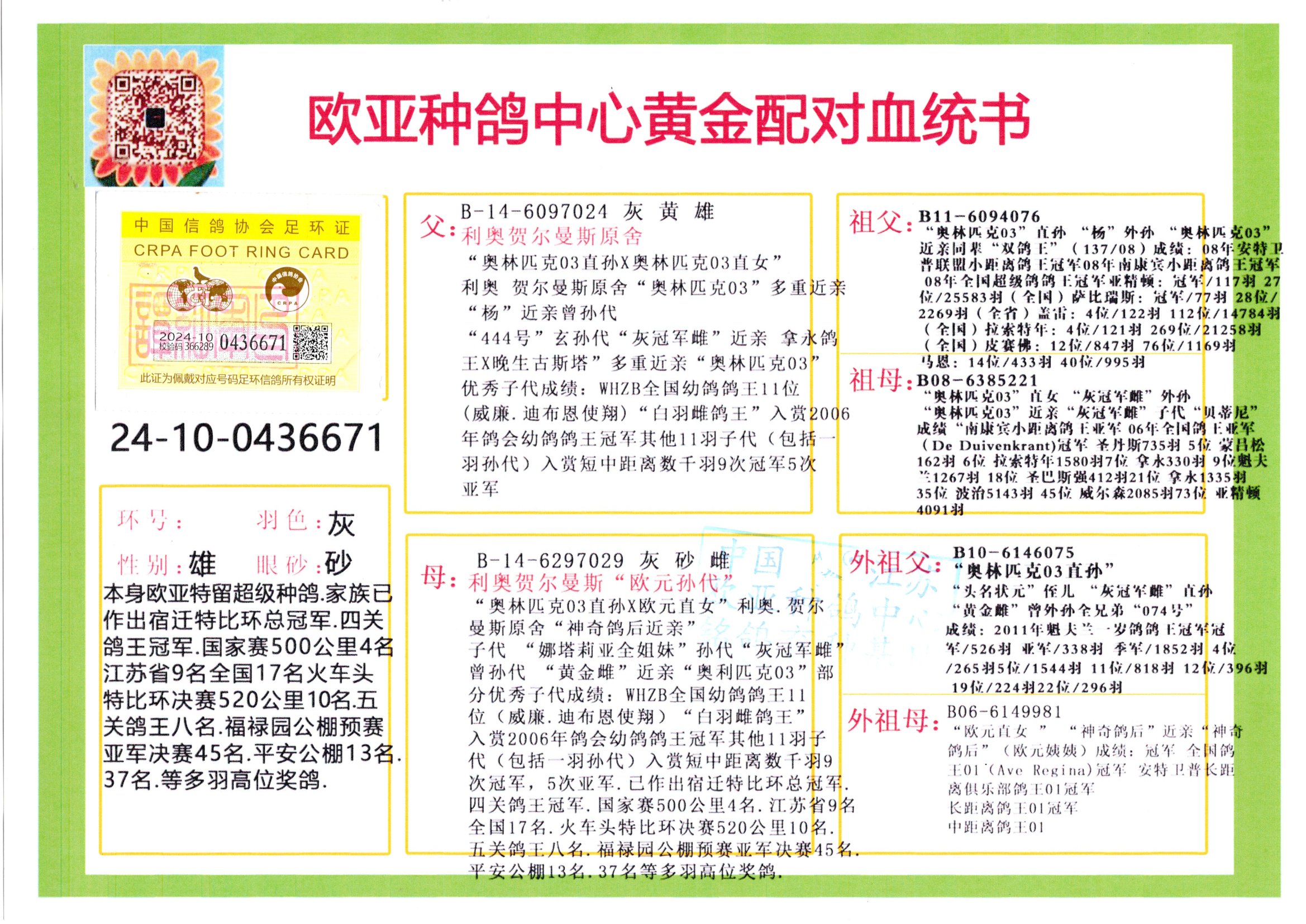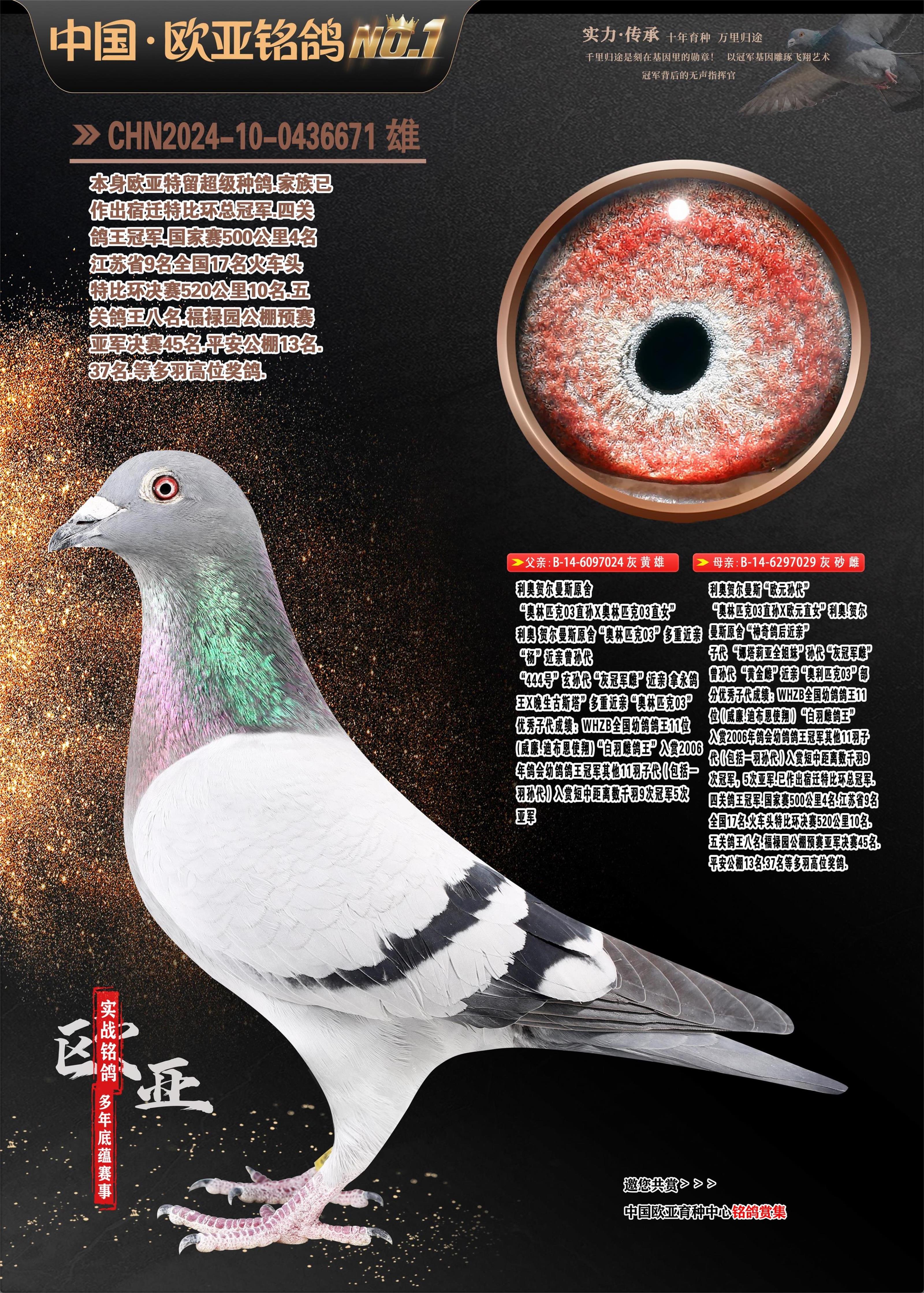 24年秋南京特比環(huán)歐亞榮獲大團體冠軍.小團體冠軍551公里大特比13名.14名.16名.19名.20名.21名.24名.26名.27名.28名.42名.52名.54名.57名.65名.66名.68名.70名.71名.72名.74名.76名.80名.82名.83名.84名.85名.86名.90名.92名.110名.116名.121名.122名.128名.131名.158名.161名.164名.165名.166名.172名.174名.177名.182名.195名.196名.201名.205名.208名.210名.216名.253名.269名.275名.276名.294名.296名.299名,,24年秋云南天南銅都公棚決賽415名.天南銅都小棚決賽409名.云南玉活公棚決賽102名.490名.團體32名上籠二羽進二羽,天南銅都大棚506公里決賽445名。熱烈祝賀河北省巨鹿縣李蘭生老師用歐亞泰山號血系連續(xù)十一年奪冠軍,河北省國家賽冠軍.全國季軍等多次前十名高位,揚州王軍王總用歐亞利奧24年春季獲山東翔宇公棚決賽33名蓋比53名。南京劉正龍劉總用歐亞蓋比獲得24年秋山東濰坊國際公棚決賽42名.精英賽30名.三關(guān)鴿王71名.決賽86名.加站賽16名.南京市特比環(huán)A組鴿王9名.B組鴿王5名.6名.C組鴿王5名.精英賽冠軍4名.技能賽A組冠軍4名.5名.秦淮區(qū)特比環(huán)榮獲15名.46名.48名.87名。四川西昌徐亮徐總用歐亞利奧獲得涼山州聚友決賽177名.第二關(guān)亞軍雙關(guān)鴿王19名.三關(guān)鴿王105名.云南豪庭公棚決賽603名。熱烈祝賀24年四川重慶翔園鴿舍用歐亞泰山號榮獲春季400公里冠軍.秋季500公里冠軍,河北王總用詹森X利奧獲得千羽千翔公棚400公里冠軍,廣東蔡楷煥榮獲24年秋愛好者 賽鴿俱樂部三關(guān)鴿王季軍.一關(guān)420公里99名.二關(guān)450公里11名.三關(guān)520公里32名.單關(guān)季軍.7名.12名,江西李衛(wèi)興榮獲貴州紅楓公棚8名.共翔俱樂部寄養(yǎng)棚四關(guān)綜合鴿王30名.一關(guān)400公里78名.二關(guān)500公里55名.三關(guān)520公里37名.四關(guān)500公里57名.同父母獲公棚18名.雷鳴獲得武漢黃浦育翔中心冠軍,四川陳文獲得四川明鴻俱樂部300公里夢幻2名.3名.4名.9名.10名.13名.14名.15名.31名.34名.40名.41名.42名.43名.69名.71名.72名.73名.74名.94名.95名.97名.98名.99名.419公里決賽榮獲總冠軍7名.總共歸巢9羽,四川徐亮獲豪庭決賽603名,山西鄭勇獲得山西泰鑫公棚決賽255名詹森紅狐,熱烈祝賀馬總獲得開爾(飛躍隊)決賽9名獲獎金1310000萬元.第一關(guān)52名,天津津福資賽180公里96名.獲獎金429543萬元,歐亞支持全國鴿友24年秋多人報喜 祝大家取得更好成績,給歐亞報喜鴿友歐亞決定給每人贈送一羽超級種鴿。歐亞俱樂部特比環(huán)多關(guān)鴿王成績:15年秋淮安特比環(huán)黑色星期一全會上籠9700多羽,當天無鴿歸巢,第二天全會歸巢357羽,本舍歸巢158羽.前十名八羽.前一百名歸巢57羽,16年春季獲五關(guān)鴿王總冠軍,總亞軍四名.六名.七名.九名.十名.晶藝俱樂部520公里冠亞季軍5名.6名.7名.9名.11名等,火車頭冠軍.季軍6名.8名.9名.10名,16年秋晶藝俱樂部特比環(huán)520公里亞軍.季軍4名.6名.7名.9名,15年春南京白下特比環(huán)冠軍.亞軍.季軍6名.7名.8名.9名.10名.指定鴿A B組獲得冠軍.亞軍.季軍4名.5名.,17年淮安特比環(huán)亞軍.4名.5名.7名.8名.10名.六關(guān)鴿王總冠軍.4名.6名.9名.10名,寄養(yǎng)棚宿遷劉總20羽特比環(huán)獲冠軍.季軍.4名.7名.8名.9名等。18年榮獲萬羽特比環(huán)六關(guān)鴿王總冠軍.總亞軍.總季軍.6名.8名.十名.單關(guān)四羽冠軍.二羽亞軍.四羽季軍.前十名27羽。19年秋萬羽特比環(huán)六關(guān)鴿王總亞軍.總季軍.5名.8名等,單關(guān)二羽冠軍.三羽亞軍.一羽季軍前十名31羽。20年秋淮安市鴿會四關(guān)特比環(huán)大賽風雨無阻鴿王亞軍.鴿王六名,金品俱樂部萬羽特比環(huán)六關(guān)鴿王總冠軍,總亞軍.四名.五名.六名.七名.八名.十名.前二百名鴿王35羽,單關(guān)冠亞季軍前十名四十多羽,火車頭五關(guān)鴿王季軍.六名.八名.前二百名鴿王十七羽。20年春榮獲淮安五區(qū)一市四關(guān)鴿王總冠軍.亞軍.四名.八名.九名。21年秋榮獲金品萬羽特比環(huán)大賽六關(guān)鴿王總亞軍.總季軍.四名.七名.九名.十名.單關(guān)冠亞軍季軍前十名三十多羽;疖囶^協(xié)會鴿王六名.七名.十名.單關(guān)前十名十七羽。22年秋榮獲鴿王總冠軍.總亞軍.5名.7名.8名.9名.11名.單關(guān)冠亞季軍前十名三十多羽,第一關(guān)單關(guān)前二百名四十多羽,第二關(guān)前二百名三十多羽,第三關(guān)前二百名四十多羽,第四關(guān)前二百名四十多羽,第五關(guān)前一百名53羽。23年秋榮獲鴿王季軍.五名.八名.十名.13名.17名.20名.27名等多羽鴿王.單關(guān)前十名二十多羽。公棚.寄養(yǎng)棚部分成績:16年秋寧夏黃河公棚總冠軍電腦戈馬力指定通炮冠軍,17年送八羽參賽獲得鴿王八名進獎四名,支持韓總榮獲八名。支持鴿友榮獲寧夏中衛(wèi)公棚決賽總冠軍.精英賽冠軍,支持18年寧夏黃河公棚決賽冠軍詹森X泰山。安徽鼎博寄養(yǎng)棚院內(nèi)外四關(guān)鴿王總冠軍.鴿王十七名.三十七名同窩,鴿王39名.42名.58名.67名。18年山東公棚預賽冠軍.決賽65名.送八羽進獎五羽.指定獲奔馳汽車一輛。支持鴿友獲得云南藍云公棚冠軍.蓋比X佛卡門。支持鴿友榮獲云南銀集公棚決賽冠軍 詹森427X520血系 速度賽6700羽冠軍。17年榮獲金馬俱樂部寄養(yǎng)棚四關(guān)鴿王總冠軍.季軍.六名.八名.第一關(guān)冠軍.亞軍.季軍四名.七名.十一名.金牌教練獎。支持鴿友18年北京費翔公棚預賽九名電腦X桑杰士,支持鴿友榮