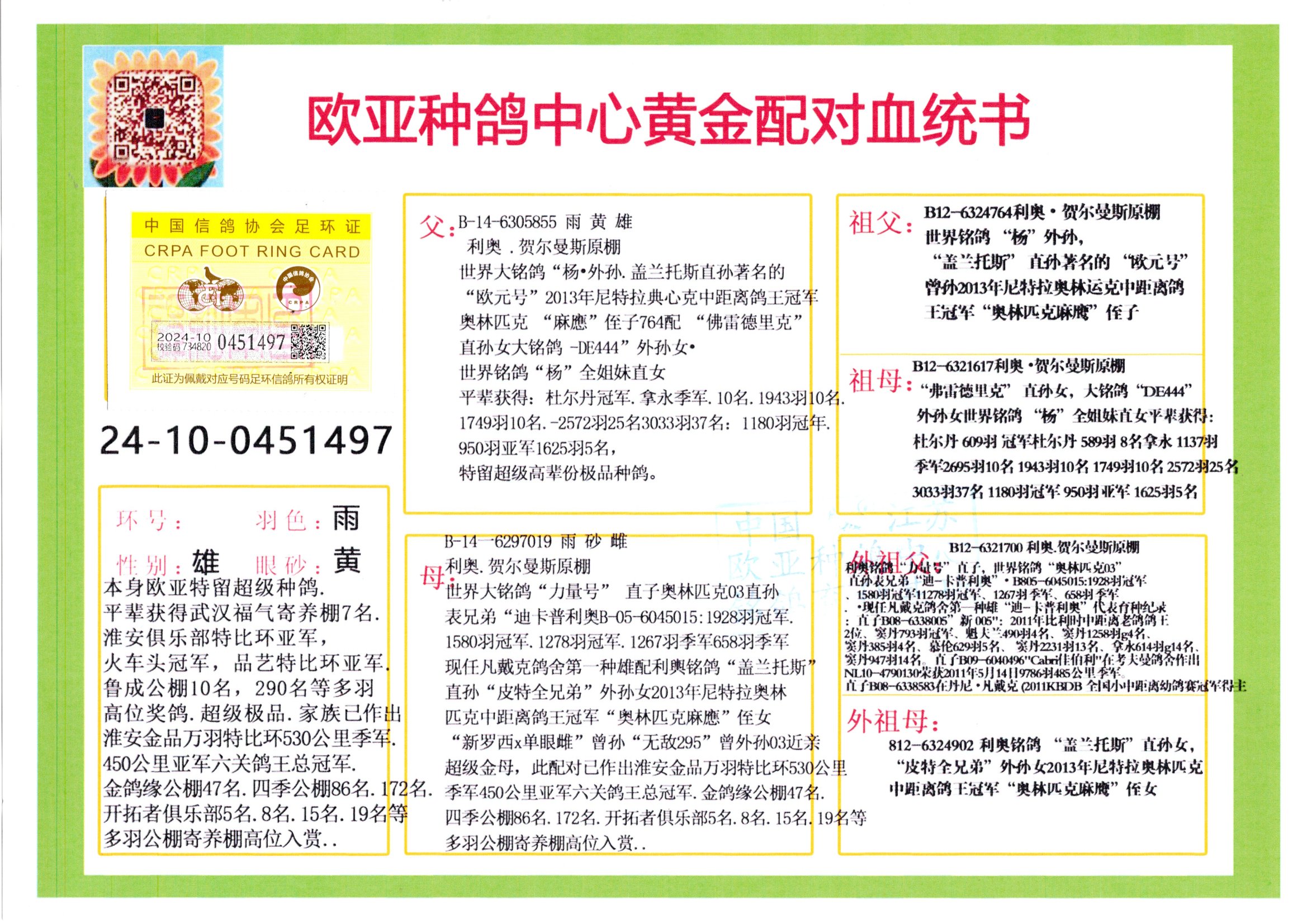 24年秋南京特比環(huán)歐亞榮獲大團(tuán)體冠軍.小團(tuán)體冠軍551公里大特比13名.14名.16名.19名.20名.21名.24名.26名.27名.28名.42名.52名.54名.57名.65名.66名.68名.70名.71名.72名.74名.76名.80名.82名.83名.84名.85名.86名.90名.92名.110名.116名.121名.122名.128名.131名.158名.161名.164名.165名.166名.172名.174名.177名.182名.195名.196名.201名.205名.208名.210名.216名.253名.269名.275名.276名.294名.296名.299名,,24年秋云南天南銅都公棚決賽415名.天南銅都小棚決賽409名.云南玉活公棚決賽102名.490名.團(tuán)體32名上籠二羽進(jìn)二羽,天南銅都大棚506公里決賽445名。熱烈祝賀河北省巨鹿縣李蘭生老師用歐亞泰山號(hào)血系連續(xù)十一年奪冠軍,河北省國家賽冠軍.全國季軍等多次前十名高位,揚(yáng)州王軍王總用歐亞利奧24年春季獲山東翔宇公棚決賽33名蓋比53名。南京劉正龍劉總用歐亞蓋比獲得24年秋山東濰坊國際公棚決賽42名.精英賽30名.三關(guān)鴿王71名.決賽86名.加站賽16名.南京市特比環(huán)A組鴿王9名.B組鴿王5名.6名.C組鴿王5名.精英賽冠軍4名.技能賽A組冠軍4名.5名.秦淮區(qū)特比環(huán)榮獲15名.46名.48名.87名。四川西昌徐亮徐總用歐亞利奧獲得涼山州聚友決賽177名.第二關(guān)亞軍雙關(guān)鴿王19名.三關(guān)鴿王105名.云南豪庭公棚決賽603名。熱烈祝賀24年四川重慶翔園鴿舍用歐亞泰山號(hào)榮獲春季400公里冠軍.秋季500公里冠軍,河北王總用詹森X利奧獲得千羽千翔公棚400公里冠軍,廣東蔡楷煥榮獲24年秋愛好者 賽鴿俱樂部三關(guān)鴿王季軍.一關(guān)420公里99名.二關(guān)450公里11名.三關(guān)520公里32名.單關(guān)季軍.7名.12名,江西李衛(wèi)興榮獲貴州紅楓公棚8名.共翔俱樂部寄養(yǎng)棚四關(guān)綜合鴿王30名.一關(guān)400公里78名.二關(guān)500公里55名.三關(guān)520公里37名.四關(guān)500公里57名.同父母獲公棚18名.雷鳴獲得武漢黃浦育翔中心冠軍,四川陳文獲得四川明鴻俱樂部300公里夢幻2名.3名.4名.9名.10名.13名.14名.15名.31名.34名.40名.41名.42名.43名.69名.71名.72名.73名.74名.94名.95名.97名.98名.99名.419公里決賽榮獲總冠軍7名.總共歸巢9羽,四川徐亮獲豪庭決賽603名,山西鄭勇獲得山西泰鑫公棚決賽255名詹森紅狐,熱烈祝賀馬總獲得開爾(飛躍隊(duì))決賽9名獲獎(jiǎng)金1310000萬元.第一關(guān)52名,天津津福資賽180公里96名.獲獎(jiǎng)金429543萬元,歐亞支持全國鴿友24年秋多人報(bào)喜 祝大家取得更好成績,給歐亞報(bào)喜鴿友歐亞決定給每人贈(zèng)送一羽超級(jí)種鴿。歐亞俱樂部特比環(huán)多關(guān)鴿王成績:15年秋淮安特比環(huán)黑色星期一全會(huì)上籠9700多羽,當(dāng)天無鴿歸巢,第二天全會(huì)歸巢357羽,本舍歸巢158羽.前十名八羽.前一百名歸巢57羽,16年春季獲五關(guān)鴿王總冠軍,總亞軍四名.六名.七名.九名.十名.晶藝俱樂部520公里冠亞季軍5名.6名.7名.9名.11名等,火車頭冠軍.季軍6名.8名.9名.10名,16年秋晶藝俱樂部特比環(huán)520公里亞軍.季軍4名.6名.7名.9名,15年春南京白下特比環(huán)冠軍.亞軍.季軍6名.7名.8名.9名.10名.指定鴿A B組獲得冠軍.亞軍.季軍4名.5名.,17年淮安特比環(huán)亞軍.4名.5名.7名.8名.10名.六關(guān)鴿王總冠軍.4名.6名.9名.10名,寄養(yǎng)棚宿遷劉總20羽特比環(huán)獲冠軍.季軍.4名.7名.8名.9名等。18年榮獲萬羽特比環(huán)六關(guān)鴿王總冠軍.總亞軍.總季軍.6名.8名.十名.單關(guān)四羽冠軍.二羽亞軍.四羽季軍.前十名27羽。19年秋萬羽特比環(huán)六關(guān)鴿王總亞軍.總季軍.5名.8名等,單關(guān)二羽冠軍.三羽亞軍.一羽季軍前十名31羽。20年秋淮安市鴿會(huì)四關(guān)特比環(huán)大賽風(fēng)雨無阻鴿王亞軍.鴿王六名,金品俱樂部萬羽特比環(huán)六關(guān)鴿王總冠軍,總亞軍.四名.五名.六名.七名.八名.十名.前二百名鴿王35羽,單關(guān)冠亞季軍前十名四十多羽,火車頭五關(guān)鴿王季軍.六名.八名.前二百名鴿王十七羽。20年春榮獲淮安五區(qū)一市四關(guān)鴿王總冠軍.亞軍.四名.八名.九名。21年秋榮獲金品萬羽特比環(huán)大賽六關(guān)鴿王總亞軍.總季軍.四名.七名.九名.十名.單關(guān)冠亞軍季軍前十名三十多羽;疖囶^協(xié)會(huì)鴿王六名.七名.十名.單關(guān)前十名十七羽。22年秋榮獲鴿王總冠軍.總亞軍.5名.7名.8名.9名.11名.單關(guān)冠亞季軍前十名三十多羽,第一關(guān)單關(guān)前二百名四十多羽,第二關(guān)前二百名三十多羽,第三關(guān)前二百名四十多羽,第四關(guān)前二百名四十多羽,第五關(guān)前一百名53羽。23年秋榮獲鴿王季軍.五名.八名.十名.13名.17名.20名.27名等多羽鴿王.單關(guān)前十名二十多羽。公棚.寄養(yǎng)棚部分成績:16年秋寧夏黃河公棚總冠軍電腦戈馬力指定通炮冠軍,17年送八羽參賽獲得鴿王八名進(jìn)獎(jiǎng)四名,支持韓總榮獲八名。支持鴿友榮獲寧夏中衛(wèi)公棚決賽總冠軍.精英賽冠軍,支持18年寧夏黃河公棚決賽冠軍詹森X泰山。安徽鼎博寄養(yǎng)棚院內(nèi)外四關(guān)鴿王總冠軍.鴿王十七名.三十七名同窩,鴿王39名.42名.58名.67名。18年山東公棚預(yù)賽冠軍.決賽65名.送八羽進(jìn)獎(jiǎng)五羽.指定獲奔馳汽車一輛。支持鴿友獲得云南藍(lán)云公棚冠軍.蓋比X佛卡門。支持鴿友榮獲云南銀集公棚決賽冠軍 詹森427X520血系 速度賽6700羽冠軍。17年榮獲金馬俱樂部寄養(yǎng)棚四關(guān)鴿王總冠軍.季軍.六