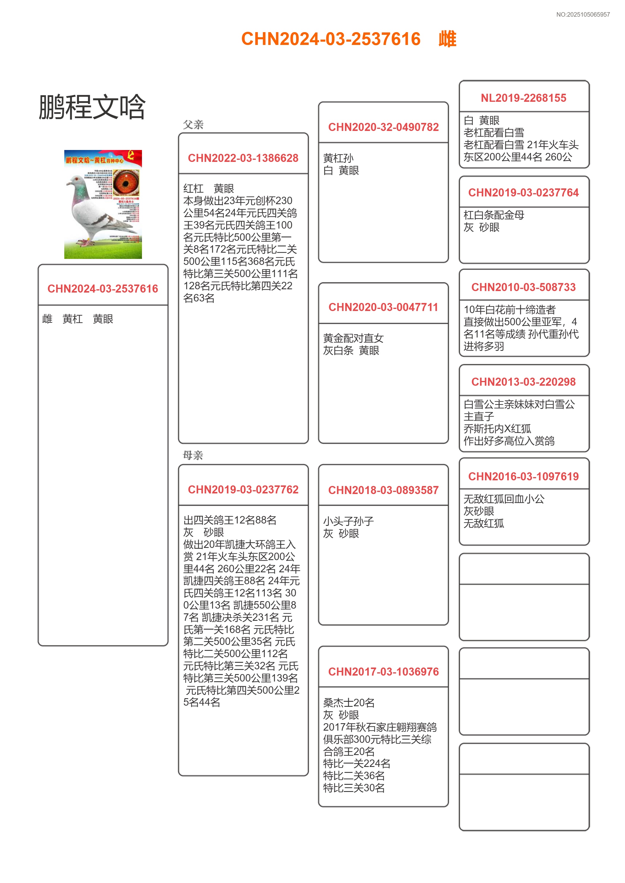 平輩:500公里單關(guān)8名四關(guān)鴿王12名39名88名100名父親:2022-03-1386628紅倫黃眼
