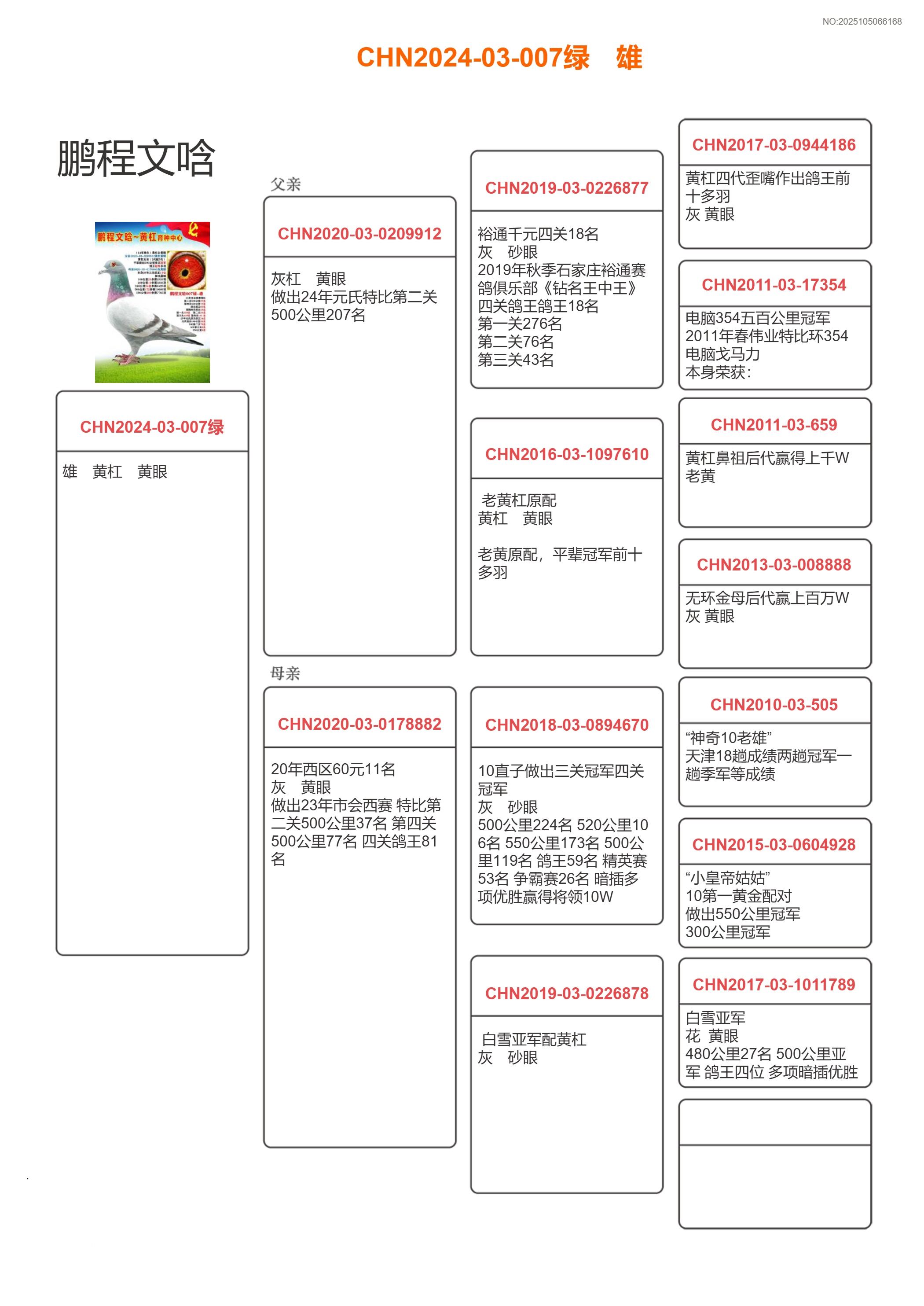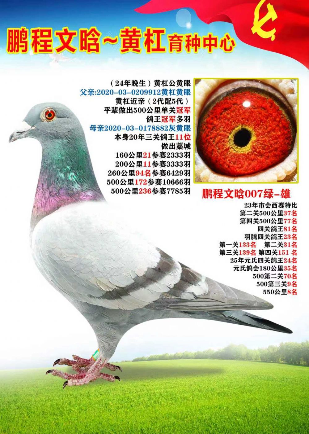 (24年晚生)黃杠公黃眼父親:2020-03-0209912黃杠黃眼黃杠近親(2代配5代)平輩做出500公里單關(guān)冠軍鴿王冠軍多羽母親2020-03-0178882灰黃眼本身20年三關(guān)鴿王11位做出藁城160公里21參賽2333羽200公里11參賽3333羽260公里94名參賽6429羽500公里172參賽10666羽500公里236參賽7785羽