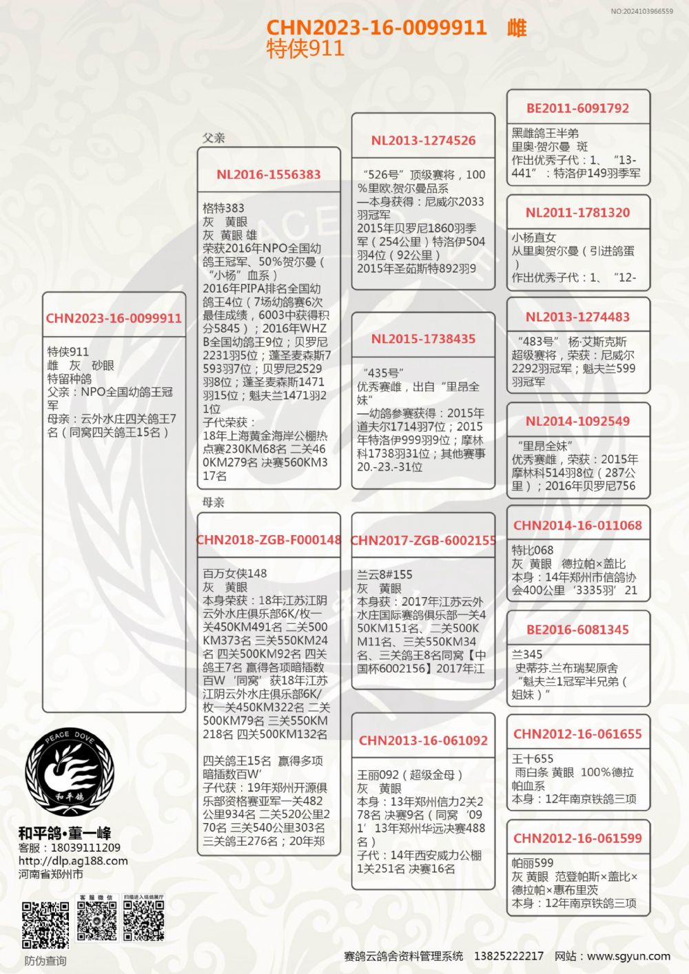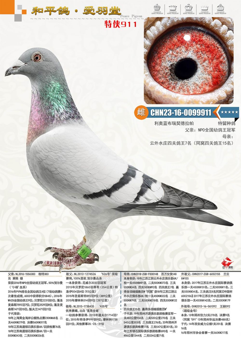 荷蘭全國幼鴿速度鴿王冠軍(格特)配云外水莊鴿王7位作出子代,