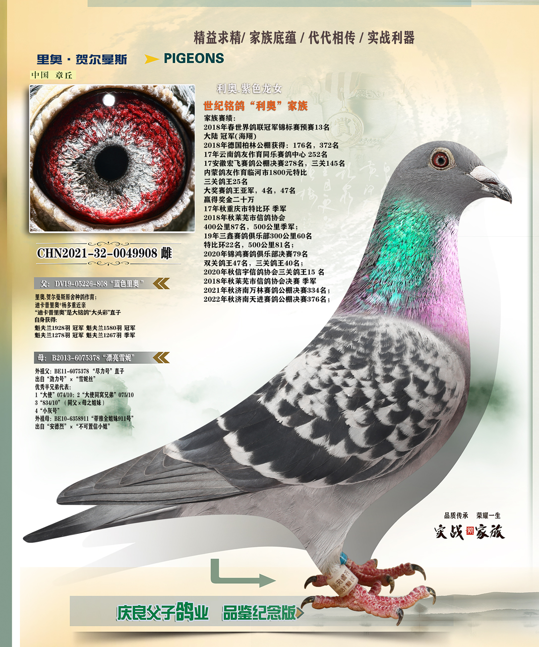 感謝齊魯良父子鴿業(yè)劉總支援巴賽羅那血統(tǒng)配我家彼得曼德斯血統(tǒng),在今年四關(guān)鴿王大賽斬獲5名,此鴿也是去年800特比小號只取10名的情況下飛進(jìn)10名,獲獎金一萬元!再次感謝劉總。!